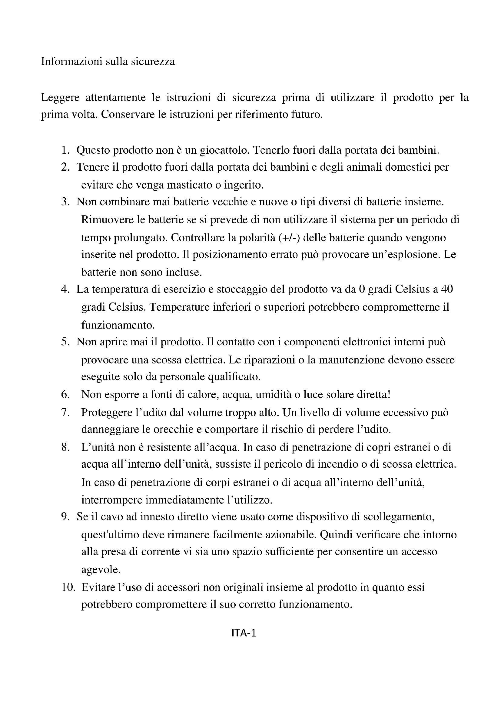 Rimuovere le batterie se si prevede di non utilizzare il sistema per un periodo di tempo prolungato. Controllare la polarità (+/-) delle batterie quando vengono inserite nel prodotto. Il posizionamento errato può provocare un’esplosione. Le batterie non sono incluse.
