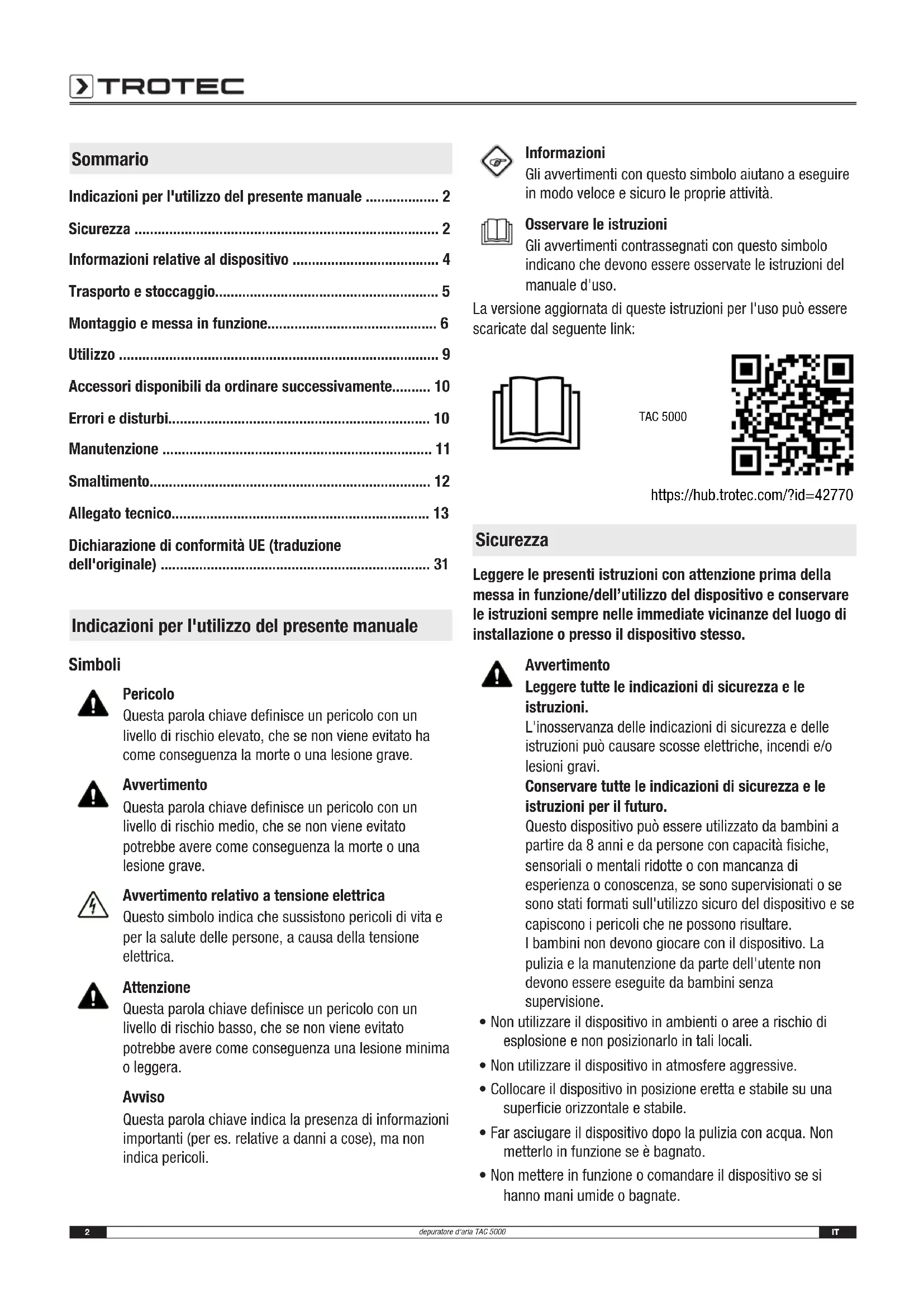 - Dichiarazione di conformità UE (traduzione dell'originale) Indicazioni per l'utilizzo del presente manuale Simboli Pericolo Questa parola chiave definisce un pericolo con un livello di rischio elevato, che se non viene evitato ha come conseguenza la morte o una lesione grave. Avvertimento Questa parola chiave definisce un pericolo con un livello di rischio medio, che se non viene evitato potrebbe avere come conseguenza la morte o una lesione grave. Avvertimento relativo a tensione elettrica Questo simbolo indica che sussistono pericoli di vita e per la salute delle persone, a causa della tensione elettrica. Attenzione Questa parola chiave definisce un pericolo con un livello di rischio basso, che se non viene evitato potrebbe avere come conseguenza una lesione minima o leggera. Avviso Questa parola chiave indica la presenza di informazioni importanti (per es. relative a danni a cose), ma non indica pericoli. Informazioni Gli avvertimenti con questo simbolo aiutano a eseguire in modo veloce e sicuro le proprie attività. Osservare le istruzioni Gli avvertimenti contrassegnati con questo simbolo indicano che devono essere osservate le istruzioni del manuale d'uso. La versione aggiornata di queste istruzioni per l'uso può essere scaricate dal seguente link: TAC 5000 https://hub.trotec.com/?id=42770 Sicurezza Leggere le presenti istruzioni con attenzione prima della messa in funzione/dell’utilizzo del dispositivo e conservare le istruzioni sempre nelle immediate vicinanze del luogo di installazione o presso il dispositivo stesso. Avvertimento Leggere tutte le indicazioni di sicurezza e le istruzioni. L'inosservanza delle indicazioni di sicurezza e delle istruzioni può causare scosse elettriche, incendi e/o lesioni gravi. Conservare tutte le indicazioni di sicurezza e le istruzioni per il futuro. Questo dispositivo può essere utilizzato da bambini a partire da 8 anni e da persone con capacità fisiche, sensoriali o mentali ridotte o con mancanza di esperienza o conoscenza, se sono supervisionati o se sono stati formati sull'utilizzo sicuro del dispositivo e se capiscono i pericoli che ne possono risultare. I bambini non devono giocare con il dispositivo. La pulizia e la manutenzione da parte dell'utente non devono essere eseguite da bambini senza supervisione. p. 31
