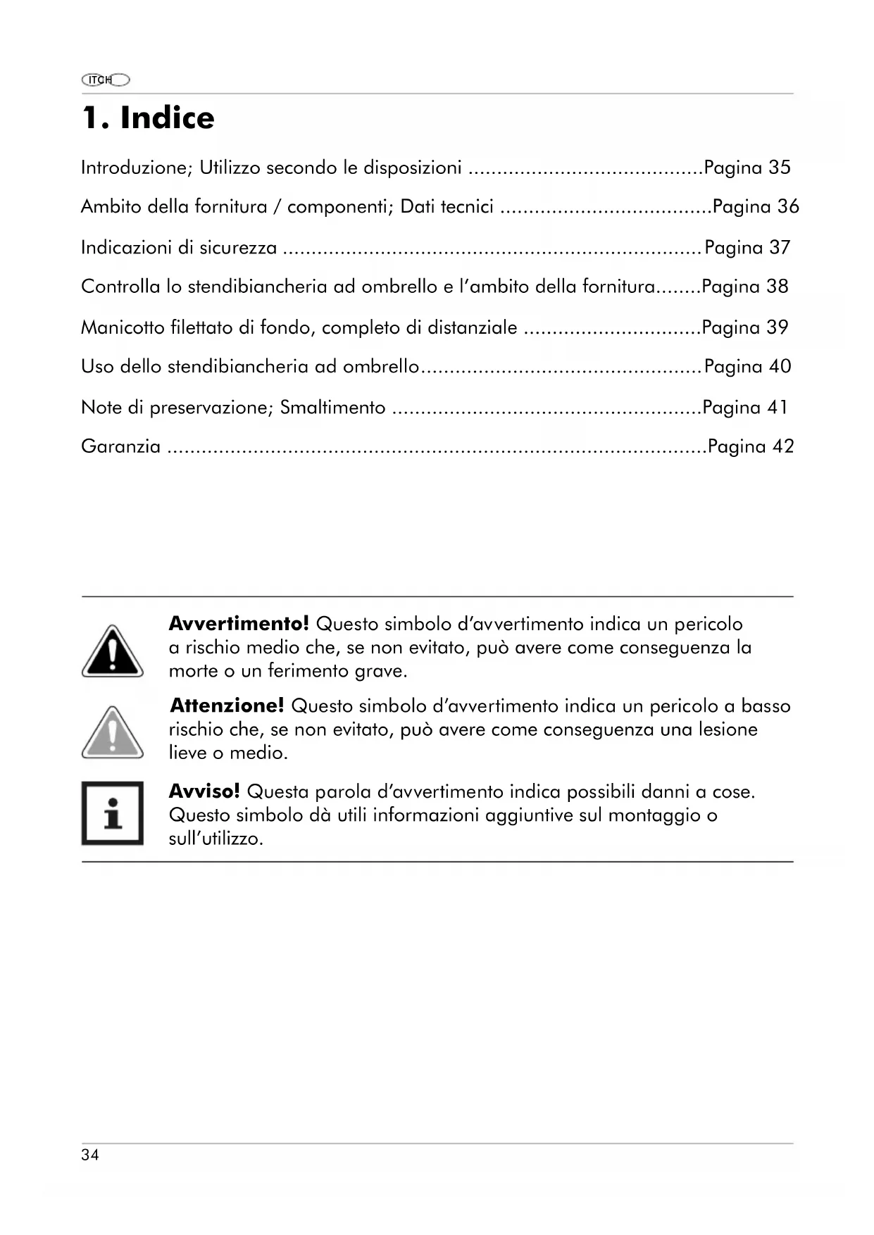 Avviso! Questa parola d’avvertimento indica possibili danni a cose. Questo simbolo dà utili informazioni aggiuntive sul montaggio o sull’utilizzo. IT CH35 IT CH