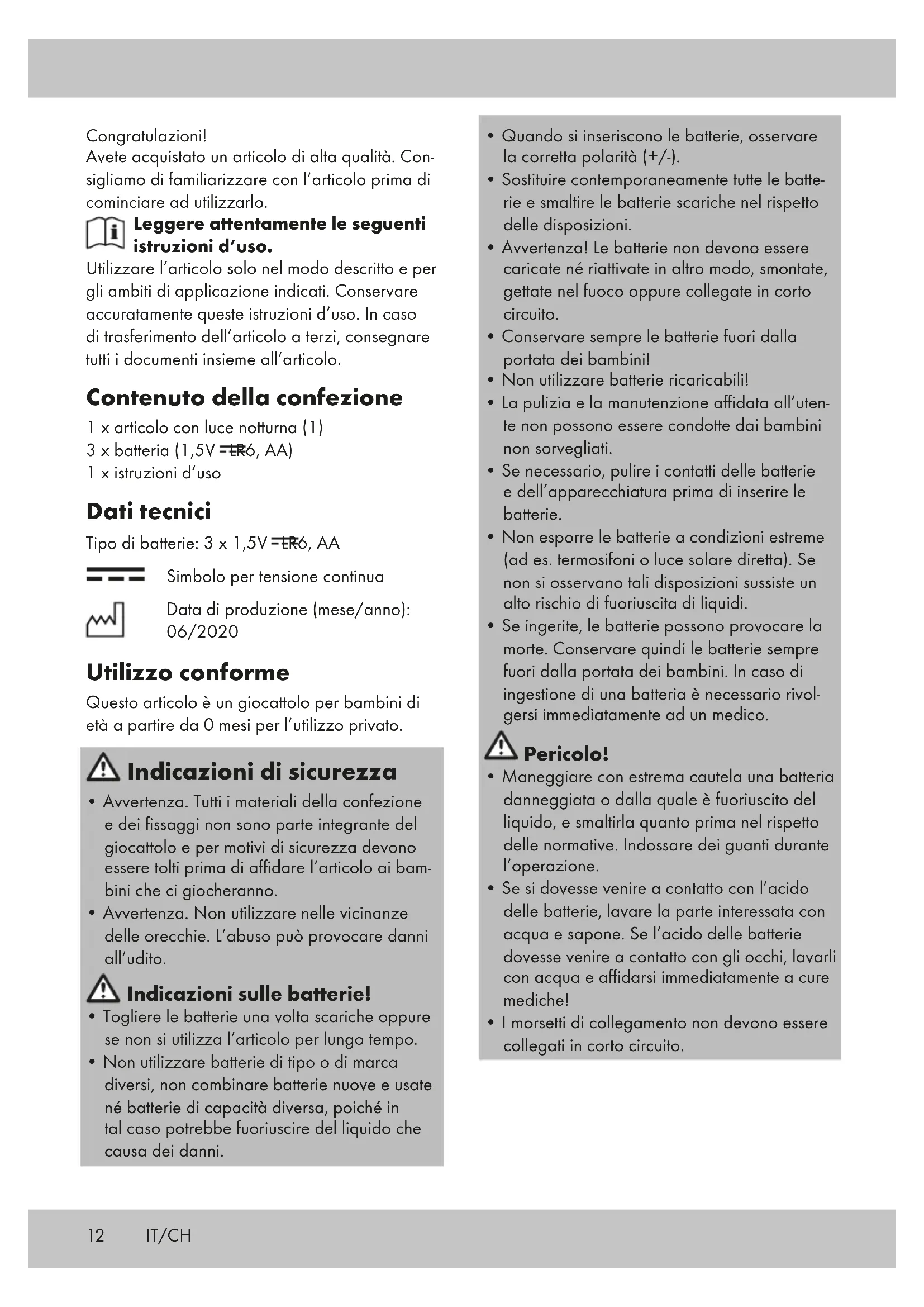 vano delle batterie (1d) e chiudere la zip. Conservazione, pulizia In caso di mancato utilizzo, riporre l’articolo a temperatura ambiente senza batterie in un luogo asciutto e pulito. Pulire solo con un panno umido. IMPORTANTE! Non utilizzare mai detergenti aggressivi. Smaltimento Una volta che l’articolo diventa inutilizzabile, non gettarlo nei rifiuti domestici, ma smaltirlo correttamente nel pieno rispetto dell’ambiente. È possibile ottenere informazioni sui punti di raccolta e sui loro orari di apertura presso l’ufficio amministrativo competente. Le batterie difettose o usate devono essere riciclate in conformità alla direttiva 2006/66/ CE e successive modifiche. Restituire le batterie e/o l’articolo attraverso i centri di raccolta offerti. I materiali di imballaggio, ad es. i sacchetti, non devono giungere nelle mani dei bambini. Tenere il materiale di imballaggio fuori dalla portata dei bambini. Danni ambientali dovuti a un errato smaltimento delle batterie! Le batterie non devono essere smaltite come rifiuti domestici. Possono contenere metalli pesanti tossici e sono soggetti a un trattamento speciale dei rifiuti. I simboli chimici dei metalli pesanti sono i seguenti: Cd = cadmio, Hg = mercurio, Pb = piombo. Pertanto, restituire le batterie usate in un punto di raccolta comunale. Smaltire l’articolo e il materiale di imballaggio nel pieno rispetto dell’ambiente. Si noti la marcatura dei materiali di imballaggio durante la separazione dei rifiuti, questi sono contrassegnati da abbreviazioni (a) e numeri (b) con il seguente significato: 1-7: materiali plastici/20-22: carta e cartone/80-98: materiali compositi. L’articolo e i materiali di imballaggio sono riciclabili, smaltirli separatamente per una migliore gestione dei rifiuti. Il logo Triman è valido solo per la Francia. Per informazioni su come smaltire l’articolo non più utilizzabile, rivolgersi alle autorità locali o comunali. Avvertenze sulla garanzia e sulla gestione dei servizi di assistenza Questo prodotto è stato fabbricato con grande attenzione e sottoposto a costanti controlli. La garanzia è di tre anni dalla data d’acquisto. Conservi lo scontrino fiscale. La garanzia vale solo su difetti di materiale o di fabbricazione e decade in caso di uso errato o non conforme. Questa garanzia non costituisce una limitazione ai Suoi diritti legali e in partico- lare al diritto di garanzia. Per eventuali reclami vi preghiamo di con- tattare il seguente servizio hotline o mettervi in comunicazione con noi via e-mail. I nostri addetti all‘assistenza concorderanno con voi come procedere nel modo più rapido possibile. In qualsiasi caso vi consiglieremo per le vostre esigenze specifiche. Il periodo di garanzia non viene prolungato a seguito di riparazioni effettuate in garanzia, secondo il diritto di garanzia o per correntezza commerciale. Lo stesso vale anche per le parti sostituite o riparate. Le riparazioni dopo la scadenza della garanzia verranno effettuate a pagamento. IAN: 347714_2001 Assistenza Svizzera Tel.: 0842 665566 (0,08 CHF/Min., telefonia mobile max. 0,40 CHF/Min.) E-Mail: deltasport@lidl.ch15GB Congratulations! You have chosen to purchase a high-quality product. Familiarise yourself with the product before using it for the first time. Read the following instructions for use carefully. Use the product only as described and only for the given areas of application. Store these instructions for use carefully. When passing the product on to third parties, please also hand over all accompanying documents. Scope of delivery 1 x product with night light (1) 3 x battery (1.5V LR6, AA) 1 x instructions for use Technical data Battery type: 3 x 1.5V LR6, AA Symbol for DC voltage Date of manufacture (month/year): 06/2020 Intended use This product is a toy for children of any age and for private use. Safety instructions
