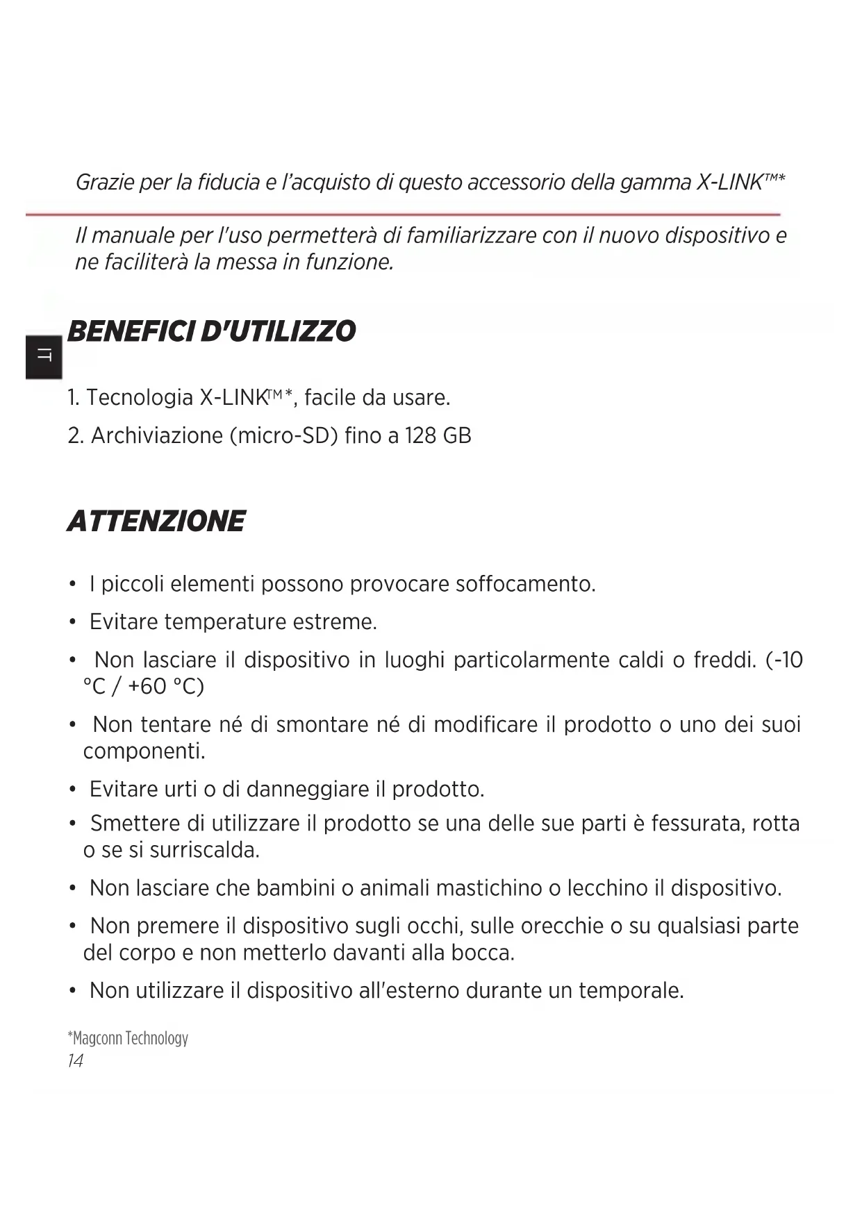 - Non utilizzare il dispositivo all'esterno durante un temporale. Grazie per la ducia e l’acquisto di questo accessorio della gamma X-LINK™* Il manuale per l'uso permetterà di familiarizzare con il nuovo dispositivo e ne faciliterà la messa in funzione.