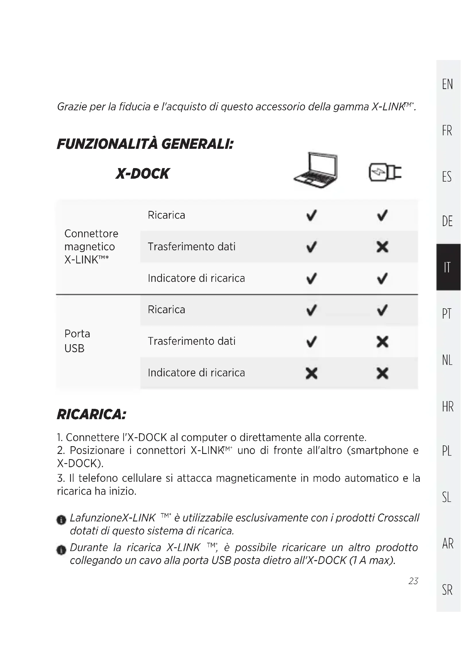 ricarica ha inizio. La funzione X-LINK TM* è utilizzabile esclusivamente con i prodotti Crosscall dotati di questo sistema di ricarica. Durante la ricarica X-LINK TM* , è possibile ricaricare un altro prodotto collegando un cavo alla porta USB posta dietro all'X-DOCK (1 A max). Grazie per la fiducia e l'acquisto di questo accessorio della gamma X-LINK TM* .EN