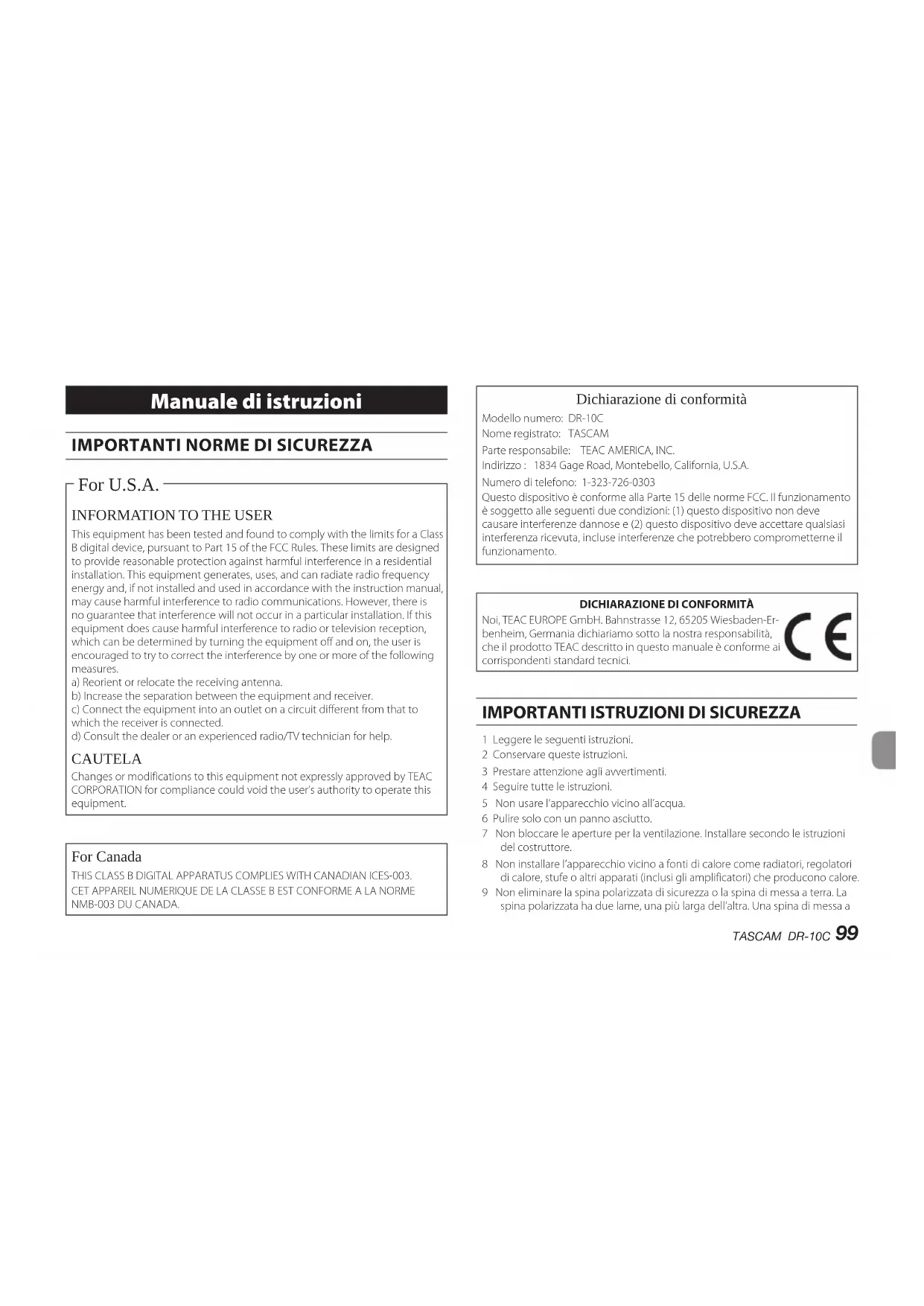Noi, TEAC EUROPE GmbH. Bahnstrasse 12, 65205 Wiesbaden-Er- benheim, Germania dichiariamo sotto la nostra responsabilità, che il prodotto TEAC descritto in questo manuale è conforme ai corrispondenti standard tecnici.