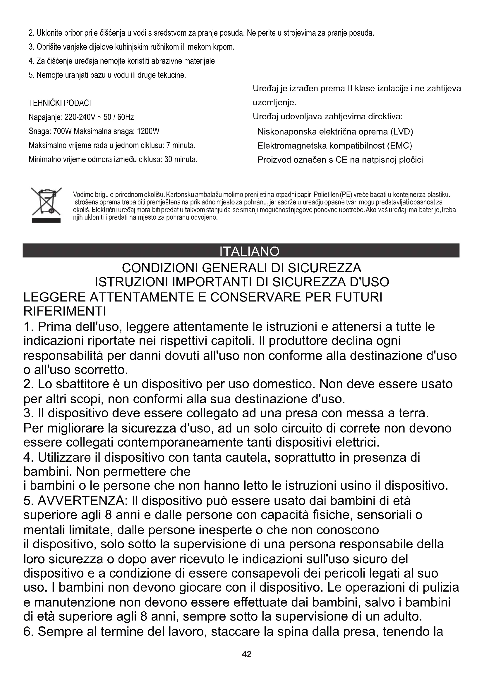 DATI TECNICI Tempo di riposo minimo tra i cicli: 30 minuti. Non gettare l'apparecchio nei contenitori dei rifiuti urbani! Prendersi cura dell'ambiente Gli imballi di cartone devono essere smaltiti nel contenitore per la carta. I sacchetti di polietilene (PE) vanno gettati nel contenitore per la plastica. L'apparecchio usato deve essere rottamato presso un centro di raccolta autorizzato, poiché contiene elementi pericolosi che potrebbero costituire una minaccia per l'ambiente. I dispositivi elettrici devono essere resi al fine di evitare il loro riutilizzo. Se il dispositivo contiene una batteria, deve essere rimossa e smaltita separatamente in un punto di raccolta. Marcatura CE (vedi: targhetta dati). Bassa tensione (LVD) Il dispositivo è conforme alle seguenti direttive: Compatibilità elettromagnetica (EMC) Il dispositivo è di II classe di isolamento e non richiede la messa a terra.