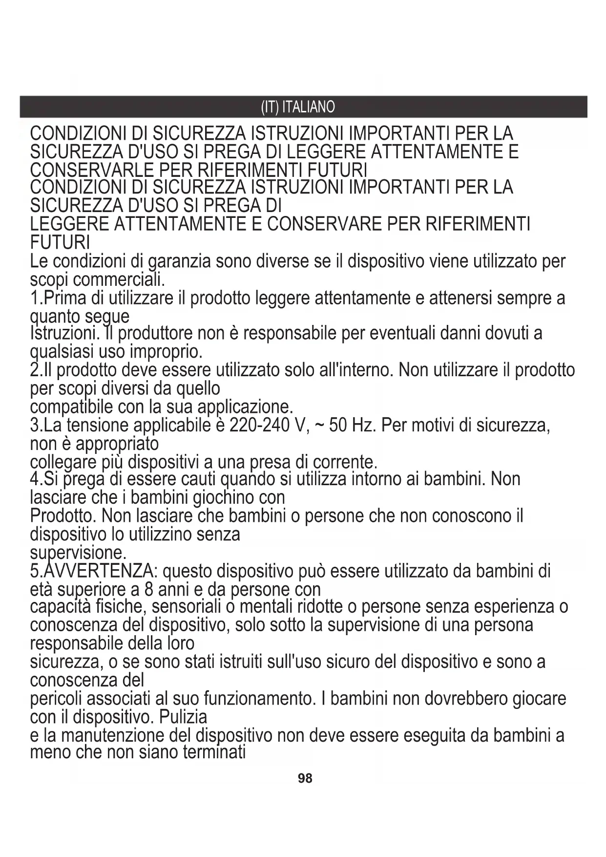 FUTURI Le condizioni di garanzia sono diverse se il dispositivo viene utilizzato per scopi commerciali. 1.Prima di utilizzare il prodotto leggere attentamente e attenersi sempre a quanto segue Istruzioni. Il produttore non è responsabile per eventuali danni dovuti a qualsiasi uso improprio. 2.Il prodotto deve essere utilizzato solo all'interno. Non utilizzare il prodotto per scopi diversi da quello compatibile con la sua applicazione. 3.La tensione applicabile è 220-240 V, ~ 50 Hz. Per motivi di sicurezza, non è appropriato collegare più dispositivi a una presa di corrente. 4.Si prega di essere cauti quando si utilizza intorno ai bambini. Non lasciare che i bambini giochino con Prodotto. Non lasciare che bambini o persone che non conoscono il dispositivo lo utilizzino senza supervisione. 5.AVVERTENZA: questo dispositivo può essere utilizzato da bambini di età superiore a 8 anni e da persone con capacità fisiche, sensoriali o mentali ridotte o persone senza esperienza o conoscenza del dispositivo, solo sotto la supervisione di una persona responsabile della loro sicurezza, o se sono stati istruiti sull'uso sicuro del dispositivo e sono a conoscenza del pericoli associati al suo funzionamento. I bambini non dovrebbero giocare con il dispositivo. Pulizia e la manutenzione del dispositivo non deve essere eseguita da bambini a meno che non siano terminati99 8 anni di età e queste attività vengono svolte sotto supervisione. 6.Dopo aver finito di utilizzare il prodotto, ricordarsi sempre di rimuovere delicatamente la spina la presa di corrente tenendo la presa con la mano. Non tirare mai il cavo di alimentazione !!! 7.Non immergere mai il cavo di alimentazione, la spina o l'intero dispositivo nell'acqua. Non esporre mai il file prodotto alle condizioni atmosferiche come luce solare diretta o pioggia, ecc. Non utilizzare mai prodotto in condizioni di umidità. 8.Controllare periodicamente le condizioni del cavo di alimentazione. Se il cavo di alimentazione è danneggiato il prodotto dovrebbe essere rivolto a una posizione di servizio professionale per essere sostituito al fine di evitare situazioni pericolose. 9.Non utilizzare mai il prodotto con un cavo di alimentazione danneggiato o se è caduto o è stato danneggiato in qualsiasi altro modo o se non funziona correttamente. Non tentare di riparare il prodotto difettoso te stesso perché può provocare scosse elettriche. Trasformare sempre il dispositivo danneggiato in a posizione di servizio professionale al fine di ripararlo. Tutte le riparazioni possono essere eseguite solo da professionisti dell'assistenza autorizzati. La riparazione eseguita in modo errato può causare situazioni pericolose per l'utente. 10.Non posizionare mai il prodotto sopra o vicino a superfici calde o calde o elettrodomestici da cucina come il forno elettrico o il fornello a gas. 11.Non utilizzare mai il prodotto vicino a combustibili. 12.Non lasciare che il cavo penda dal bordo del bancone o che tocchi superfici calde.