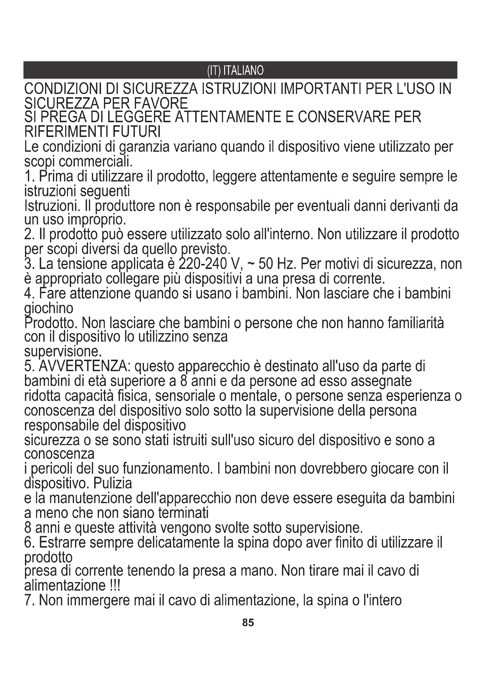 istruzioni seguenti Le condizioni di garanzia variano quando il dispositivo viene utilizzato per scopi commerciali. SI PREGA DI LEGGERE ATTENTAMENTE E CONSERVARE PER RIFERIMENTI FUTURI CONDIZIONI DI SICUREZZA ISTRUZIONI IMPORTANTI PER L'USO IN