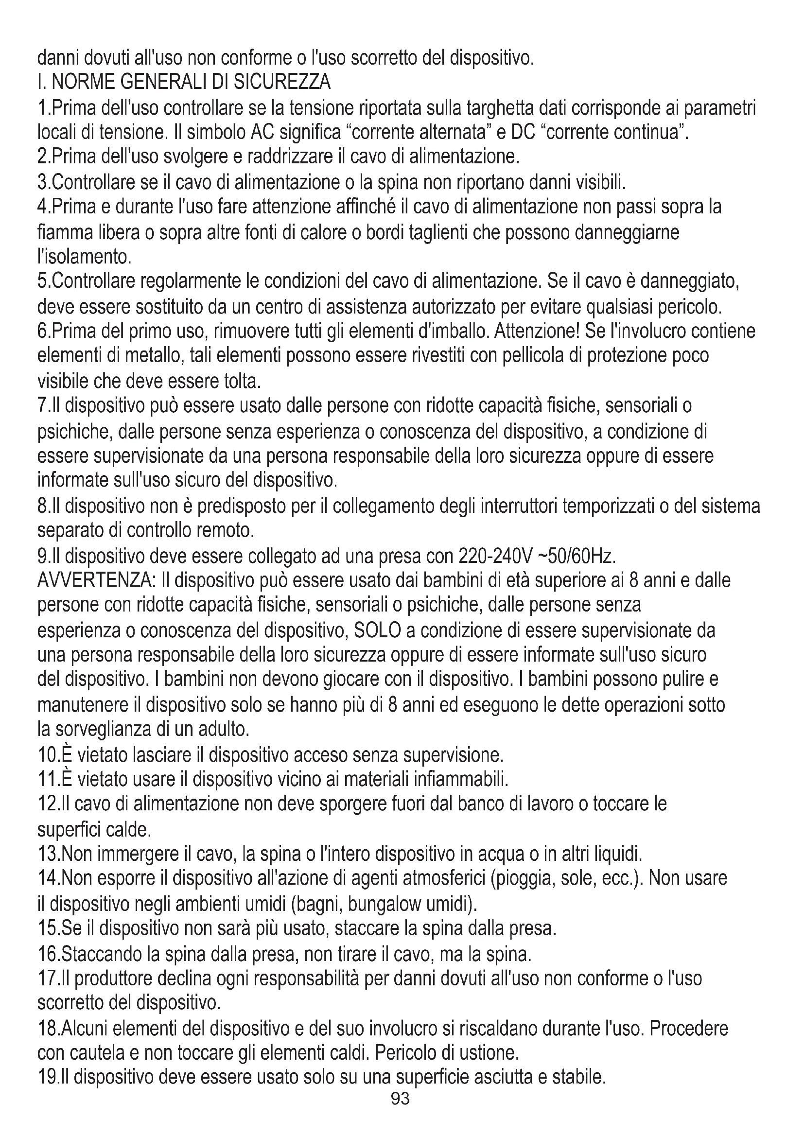 19.Il dispositivo deve essere usato solo su una superficie asciutta e stabile. 2.Prima dell'uso svolgere e raddrizzare il cavo di alimentazione. 4.Prima e durante l'uso fare attenzione affinché il cavo di alimentazione non passi sopra la fiamma libera o sopra altre fonti di calore o bordi taglienti che possono danneggiarne l'isolamento. 3.Controllare se il cavo di alimentazione o la spina non riportano danni visibili. 7.Il dispositivo può essere usato dalle persone con ridotte capacità fisiche, sensoriali o psichiche, dalle persone senza esperienza o conoscenza del dispositivo, a condizione di essere supervisionate da una persona responsabile della loro sicurezza oppure di essere informate sull'uso sicuro del dispositivo. 10.È vietato lasciare il dispositivo acceso senza supervisione. 5.Controllare regolarmente le condizioni del cavo di alimentazione. Se il cavo è danneggiato, deve essere sostituito da un centro di assistenza autorizzato per evitare qualsiasi pericolo. 6.Prima del primo uso, rimuovere tutti gli elementi d'imballo. Attenzione! Se l'involucro contiene elementi di metallo, tali elementi possono essere rivestiti con pellicola di protezione poco visibile che deve essere tolta. 11.È vietato usare il dispositivo vicino ai materiali infiammabili. 1.Prima dell'uso controllare se la tensione riportata sulla targhetta dati corrisponde ai parametri locali di tensione. Il simbolo AC significa “corrente alternata” e DC “corrente continua”. 9.Il dispositivo deve essere collegato ad una presa con 220-240V ~50/60Hz. 13.Non immergere il cavo, la spina o l'intero dispositivo in acqua o in altri liquidi. 12.Il cavo di alimentazione non deve sporgere fuori dal banco di lavoro o toccare le superfici calde. 14.Non esporre il dispositivo all'azione di agenti atmosferici (pioggia, sole, ecc.). Non usare il dispositivo negli ambienti umidi (bagni, bungalow umidi). 16.Staccando la spina dalla presa, non tirare il cavo, ma la spina. 18.Alcuni elementi del dispositivo e del suo involucro si riscaldano durante l'uso. Procedere con cautela e non toccare gli elementi caldi. Pericolo di ustione. AVVERTENZA: Il dispositivo può essere usato dai bambini di età superiore ai 8 anni e dalle persone con ridotte capacità fisiche, sensoriali o psichiche, dalle persone senza esperienza o conoscenza del dispositivo, SOLO a condizione di essere supervisionate da una persona responsabile della loro sicurezza oppure di essere informate sull'uso sicuro del dispositivo. I bambini non devono giocare con il dispositivo. I bambini possono pulire e manutenere il dispositivo solo se hanno più di 8 anni ed eseguono le dette operazioni sotto la sorveglianza di un adulto. 15.Se il dispositivo non sarà più usato, staccare la spina dalla presa. 17.Il produttore declina ogni responsabilità per danni dovuti all'uso non conforme o l'uso scorretto del dispositivo. 8.Il dispositivo non è predisposto per il collegamento degli interruttori temporizzati o del sistema separato di controllo remoto. danni dovuti all'uso non conforme o l'uso scorretto del dispositivo.94 21.Gli elementi riscaldanti hanno bisogno del tempo per raffreddarsi completamente. 23.Durante l'uso del dispositivo occorre garantire lo spazio sufficiente sopra e attorno. Durante il funzionamento il dispositivo non deve toccare alcun oggetto infiammabile come per esempio: decorazioni, carta da cucina, tende, abbigliamento, ecc. 20.Non coprire MAI il dispositivo funzionante, né quando non si è ancora completamente raffreddato. 25.Il dispositivo non è predisposto per il collegamento degli interruttori temporizzati o del sistema separato di controllo remoto. 22.Il dispositivo è della II classe di protezione antifolgorazione 24.FARE ATTENZIONE se il dispositivo è utilizzato sulle superfici sensibili ad alte temperature. Si consiglia di usare i tappetini di isolamento. 2.Non lavare la parte esterna del dispositivo con detergenti aggressivi sotto forma di emulsioni, latti, paste, ecc. Possono cancellare i simboli grafici come per esempio i segnali di avvertimento, ecc. 1.Il dispositivo non deve essere usato all'esterno. 9.Non sistemare il dispositivo in modo tale che il fornello tocchi i cavi di altri elettrodomestici (per esempio dei frullatori). Non sistemare il dispositivo sotto la presa elettrica.
