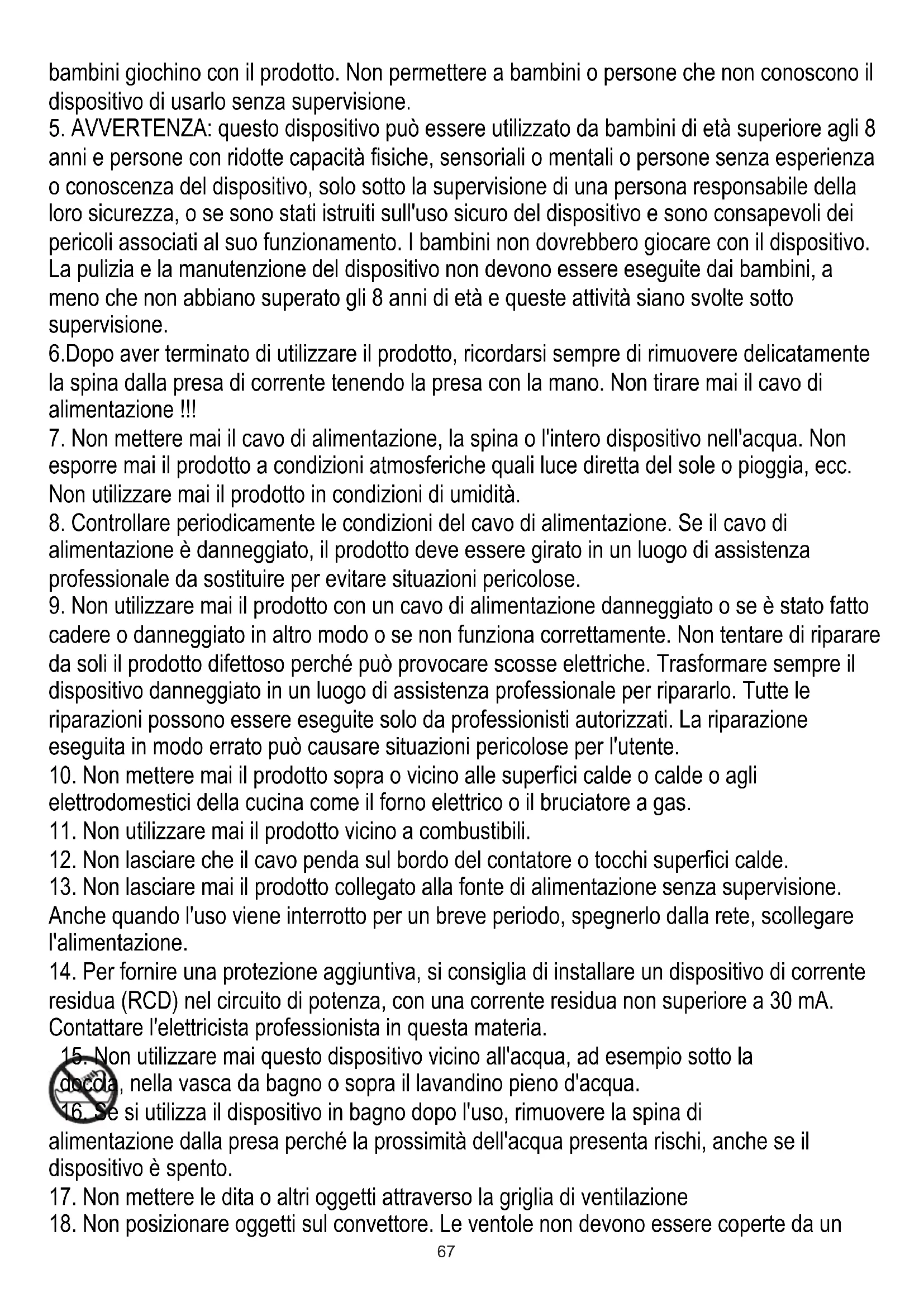 18. Non posizionare oggetti sul convettore. Le ventole non devono essere coperte da un68