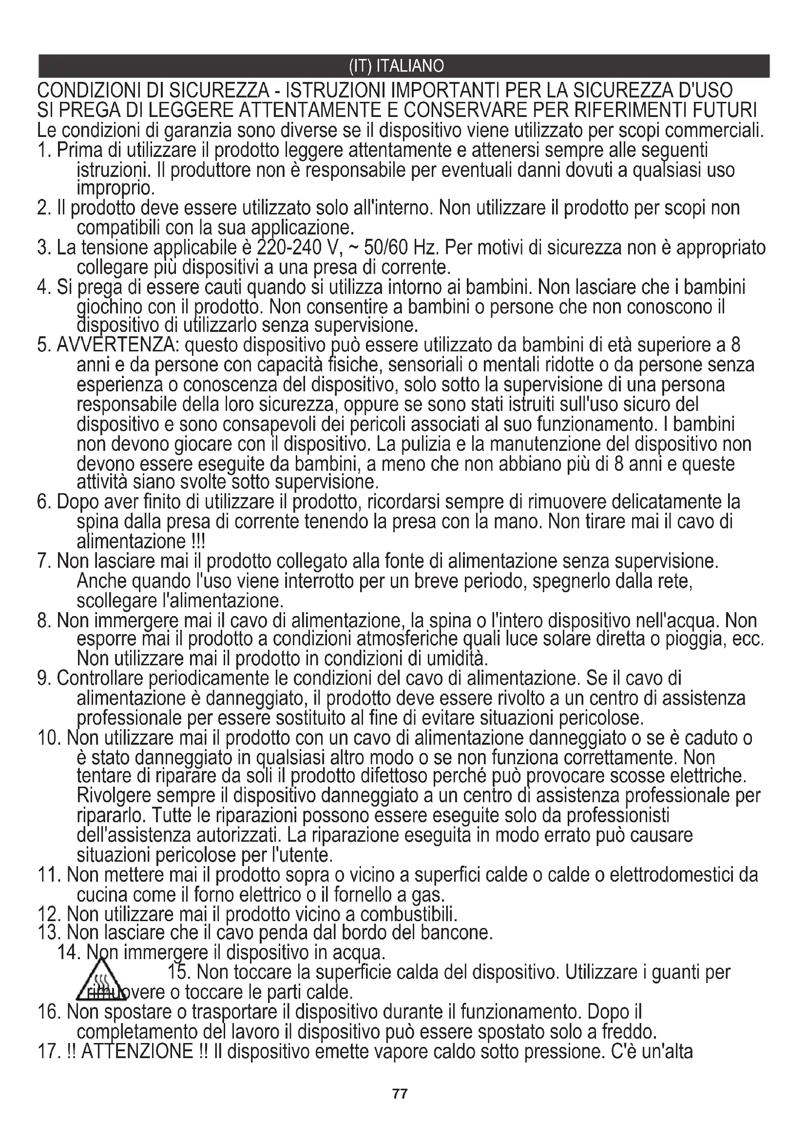 17. !! ATTENZIONE !! Il dispositivo emette vapore caldo sotto pressione. C'è un'alta78