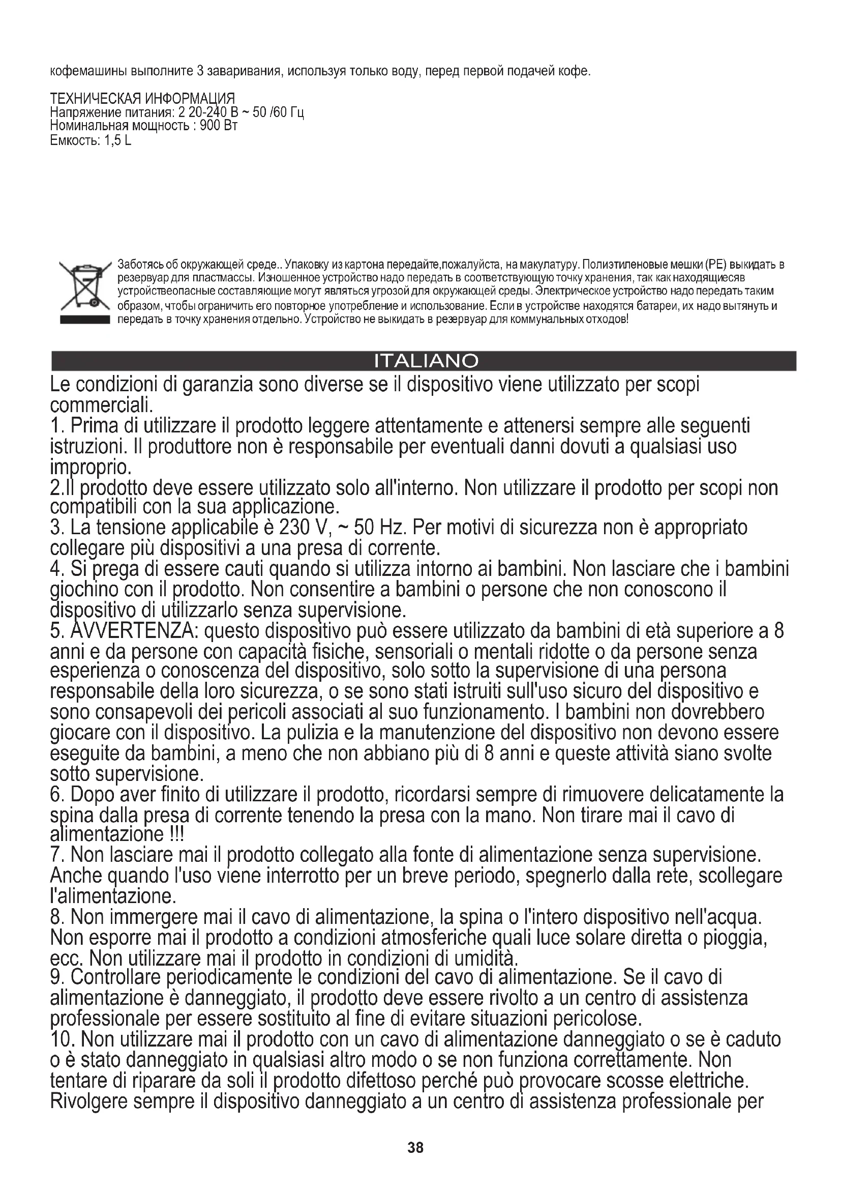 5.Gli elementi della macchina da caffè non devono essere lavati in lavastoviglie. Decalcificazione: Per garantire che la macchina da caffè funzioni in modo affidabile e sia completamente efficace, deve essere decalcificata regolarmente. La frequenza della decalcificazione dipende dalla durezza dell'acqua e dalla frequenza di utilizzo. Il deposito di calcare porta a una preparazione del caffè più lunga e può danneggiare la macchina da caffè. SI PREGA DI DECALCARE IL DISPOSITIVO UNO OGNI 5-8 settimane. I dispositivi danneggiati da una cattiva manutenzione non potranno beneficiare di richieste di garanzia e riparazioni. Si consiglia di utilizzare liquidi disincrostanti particolarmente adatti a macchine da caffè e bollitori con corpo in plastica. Segui le istruzioni fornite. Dopo aver risciacquato i depositi di calcare dagli elementi acqua della macchina da caffè, eseguire 3 infusioni utilizzando solo acqua prima della prima erogazione del caffè. INFORMAZIONI TECNICHE Tensione di alimentazione: 2 20-240 V ~ 50 /60 Hz Potenza Nom: 900W Capacità: 1,5 L