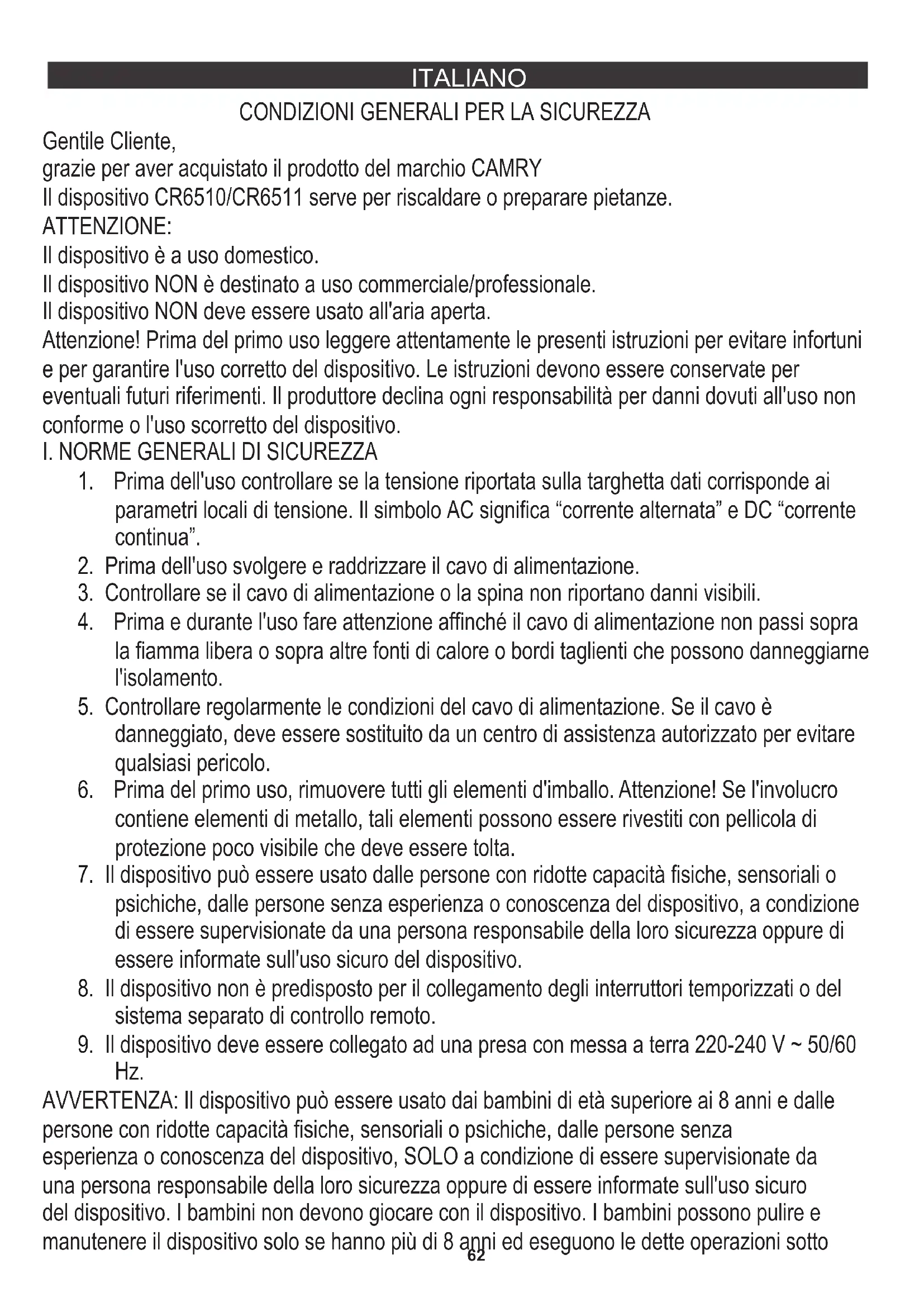 grazie per aver acquistato il prodotto del marchio CAMRY Il dispositivo CR6510/CR6511 serve per riscaldare o preparare pietanze. Il dispositivo è a uso domestico. Il dispositivo NON è destinato a uso commerciale/professionale.