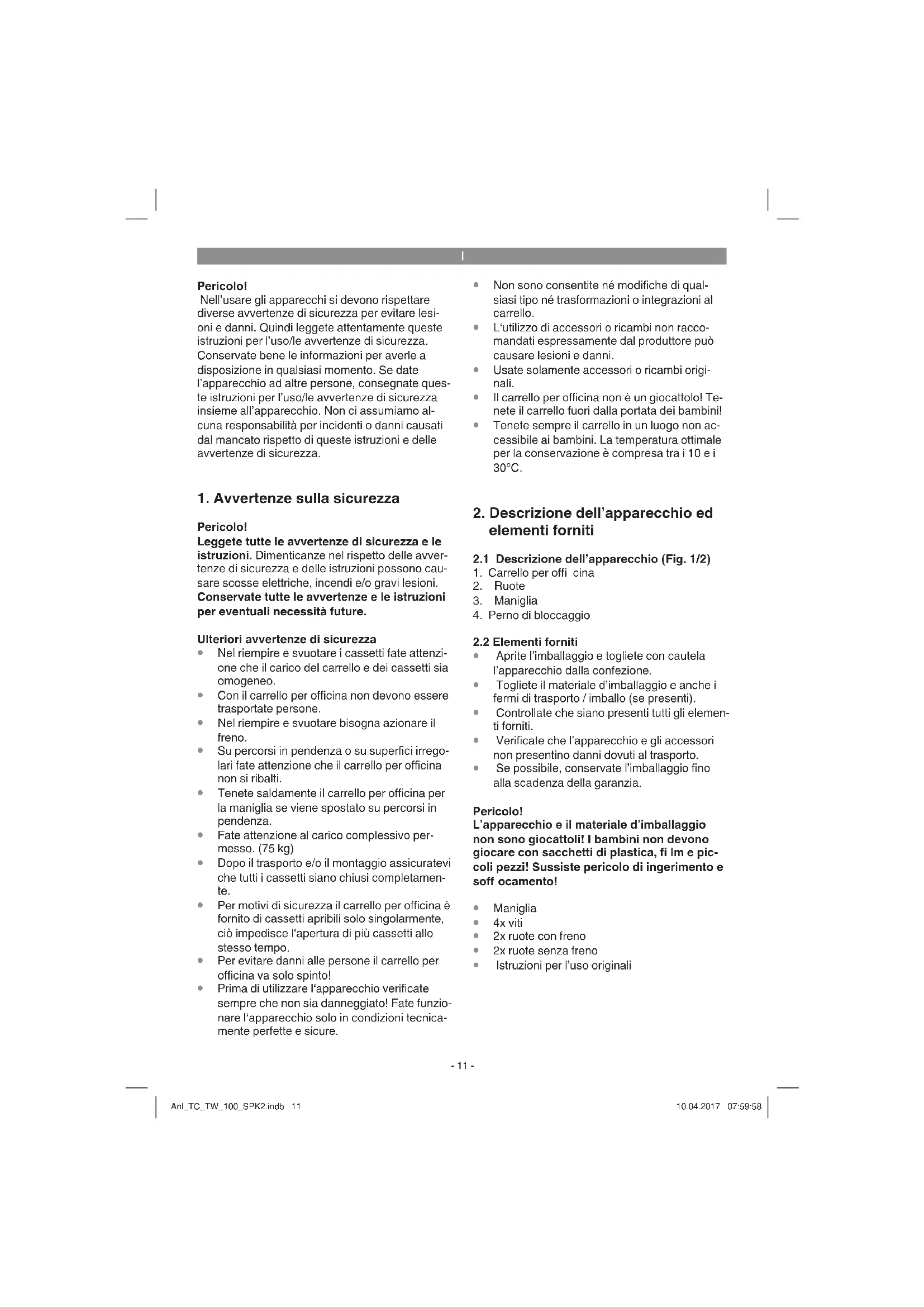 Il carrello per officina non è un giocattolo! Te- nete il carrello fuori dalla portata dei bambini!