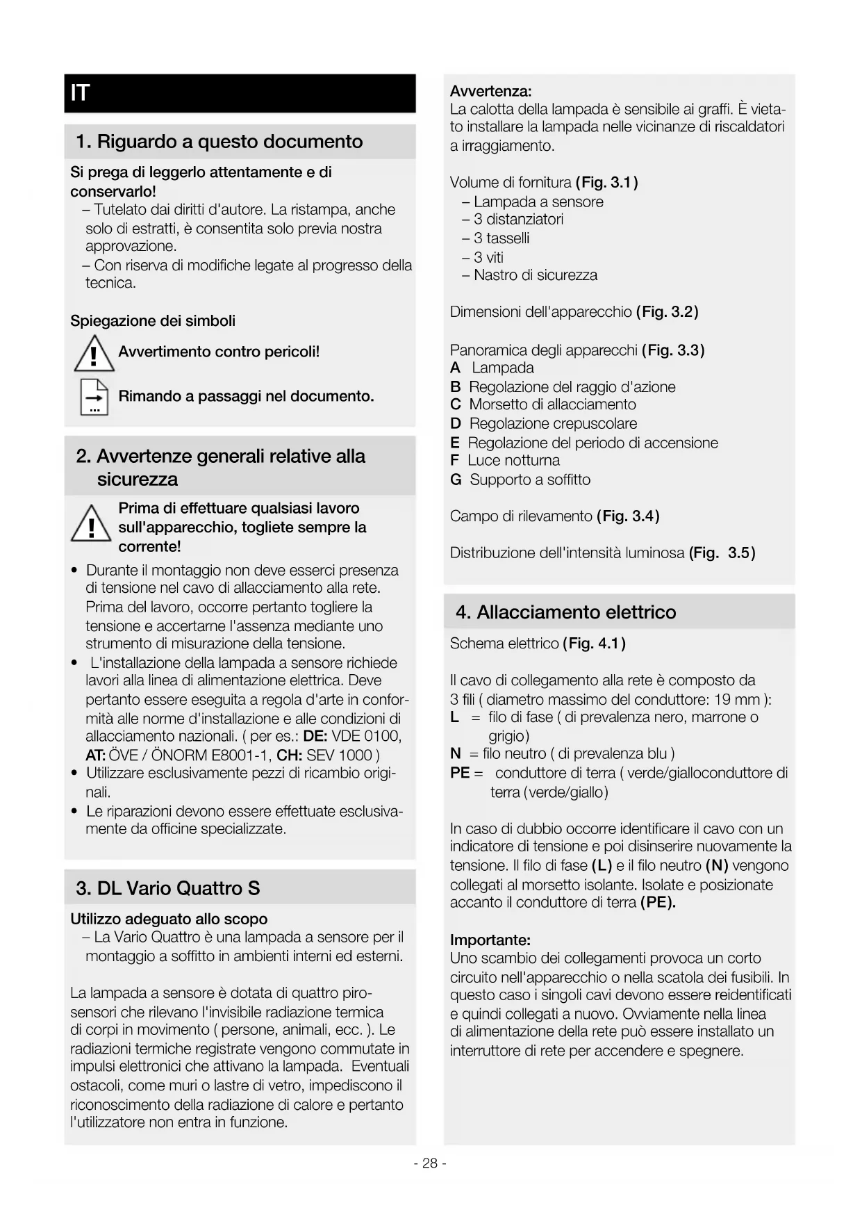 Utilizzo adeguato allo scopo – La Vario Quattro è una lampada a sensore per il montaggio a sotto in ambienti interni ed esterni. La lampada a sensore è dotata di quattro piro- sensori che rilevano l'invisibile radiazione termica di corpi in movimento ( persone, animali, ecc. ). Le radiazioni termiche registrate vengono commutate in impulsi elettronici che attivano la lampada. Eventuali ostacoli, come muri o lastre di vetro, impediscono il riconoscimento della radiazione di calore e pertanto l'utilizzatore non entra in funzione.