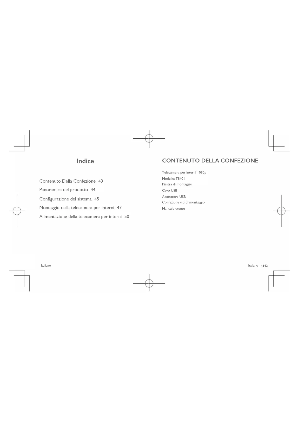 Italiano Indice Contenuto Della Confezione 43 Panoramica del prodotto 44 Congurazione del sistema 45 Montaggio della telecamera per interni 47 Alimentazione della telecamera per interni 50