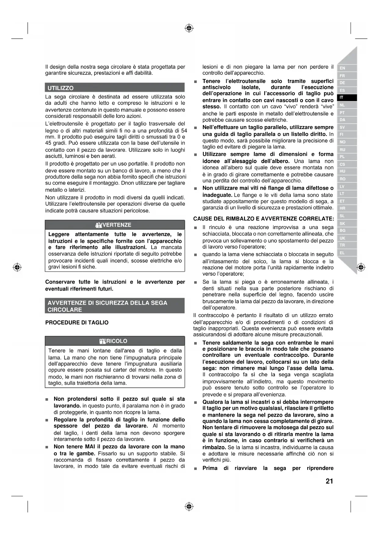 PERICOLO Tenere le mani lontane dall'area di taglio e dalla lama. La mano che non tiene l’impugnatura principale dell’apparecchio deve tenere l’impugnatura ausiliaria oppure essere posata sul carter del motore. In questo modo, le mani non rischieranno di trovarsi nella zona di taglio, sulla traiettoria della lama. ■ Non protendersi sotto il pezzo sul quale si sta lavorando. in questo punto, il paralama non è in grado di proteggerle, in quanto non ricopre la lama. ■ Regolare la profondità di taglio in funzione dello spessore del pezzo da lavorare. Al momento del taglio, i denti della lama non devono sporgere interamente sotto il pezzo da lavorare. ■ Non tenere MAI il pezzo da lavorare con la mano o tra le gambe. Fissarlo su un supporto stabile. Si raccomanda di fissare correttamente il pezzo da lavorare, in modo tale da evitare eventuali rischi di lesioni e di non piegare la lama per non perdere il controllo dell’apparecchio. ■ Tenere l’elettroutensile solo tramite superfici antiscivolo isolate, durante l’esecuzione dell’operazione in cui l’accessorio di taglio può entrare in contatto con cavi nascosti o con il cavo stesso. Il contatto con un cavo “vivo” renderà “vive” anche le parti esposte in metallo dell’elettroutensile e potrebbe causare scosse elettriche. ■ Nell’effettuare un taglio parallelo, utilizzare sempre una guida di taglio parallela o un listello diritto. In questo modo, sarà possibile migliorare la precisione di taglio ed evitare di piegare la lama. ■ Utilizzare sempre lame di dimensioni e forma idonee all’alesaggio dell’albero. Una lama non idonea all’albero sul quale deve essere montata non è in grado di girare correttamente e potrebbe causare una perdita del controllo dell’apparecchio. ■ Non utilizzare mai viti né flange di lama difettose o inadeguate. Le flange e le viti della lama sono state studiate appositamente per questo modello di sega, a garanzia di un livello di sicurezza e prestazioni ottimale. CAUSE DEL RIMBALZO E AVVERTENZE CORRELATE: ■ Il rinculo è una reazione improvvisa a una sega schiacciata, bloccata o non correttamente allineata, che provoca un sollevamento o uno spostamento del pezzo di lavoro verso l’operatore; ■ quando la lama viene schiacciata o bloccata in seguito all’intasamento del solco, la lama si blocca e la reazione del motore porta l’unità rapidamente indietro verso l’operatore; ■ Se la lama si piega o è erroneamente allineata, i denti situati nella sua parte posteriore rischiano di penetrare nella superficie del legno, facendo uscire bruscamente la lama dal pezzo da lavorare, in direzione dell’operatore. Il contraccolpo è pertanto il risultato di un utilizzo errato dell’apparecchio e/o di procedimenti o di condizioni di taglio inappropriati. Questa evenienza può essere evitata assicurandosi di adottare alcune misure precauzionali. ■ Tenere saldamente la sega con entrambe le mani e posizionare le braccia in modo tale che possano controllare un eventuale contraccolpo. Durante l’esecuzione del lavoro, collocarsi su un lato della sega: non rimanere mai lungo l’asse della lama. Il contraccolpo fa sì che la sega venga scagliata improvvisamente all’indietro, ma questo movimento può essere tenuto sotto controllo se l’operatore lo prevede e si prepara all’evenienza. ■ Qualora la lama si incastri o si debba interrompere il taglio per un motivo qualsiasi, rilasciare il grilletto e mantenere la sega nel pezzo da lavorare, sino a quando la lama non cessa completamente di girare. Non tentare di rimuovere la motosega dal pezzo sul quale si sta lavorando o di ritirarla mentre la lama è in funzione, in caso contrario si verificherà un rimbalzo. Se la lama si incastra, individuarne la causa e adottare le misure necessarie affinché ciò non si verifichi più. ■ Prima di riavviare la sega per riprendere22 | Italiano un’operazione di taglio, allineare correttamente la lama rispetto al taglio ed assicurarsi che i denti non tocchino il pezzo da lavorare. Se la lama si incastra, potrebbe avvicinarsi o rinculare dal pezzo di lavoro una volta avviata. ■ Non dimenticare di sorreggere i pezzi lunghi, onde evitare che la lama si incastri e limitare pertanto i rischi di contraccolpo. I pezzi lunghi tendono infatti a flettersi sotto il loro stesso peso. È possibile sistemare appositi supporti su entrambi i lati del pezzo, accanto alla linea di taglio e a livello dell’estremità del pezzo. ■ Non utilizzare lame smussate o danneggiate. Una lama non affilata o montata erroneamente genera un taglio sottile, che dà luogo ad un attrito eccessivo della lama e pertanto a maggiori rischi di torsione e di contraccolpo. ■ Prima di iniziare un’operazione di taglio, assicurarsi che le manopole di regolazione della profondità e dell’inclinazione siano adeguatamente bloccate. Se le regolazioni della posizione della lama si modificano durante il taglio, la lama rischia infatti di incastrarsi e può verificarsi un contraccolpo. ■ Fare ulteriore attenzione quando si svolgono operazioni di taglio in muri gà esistenti o altre aree cieche. La lama potrebbe urtare elementi nascosti, con conseguente pericolo di contraccolpo.