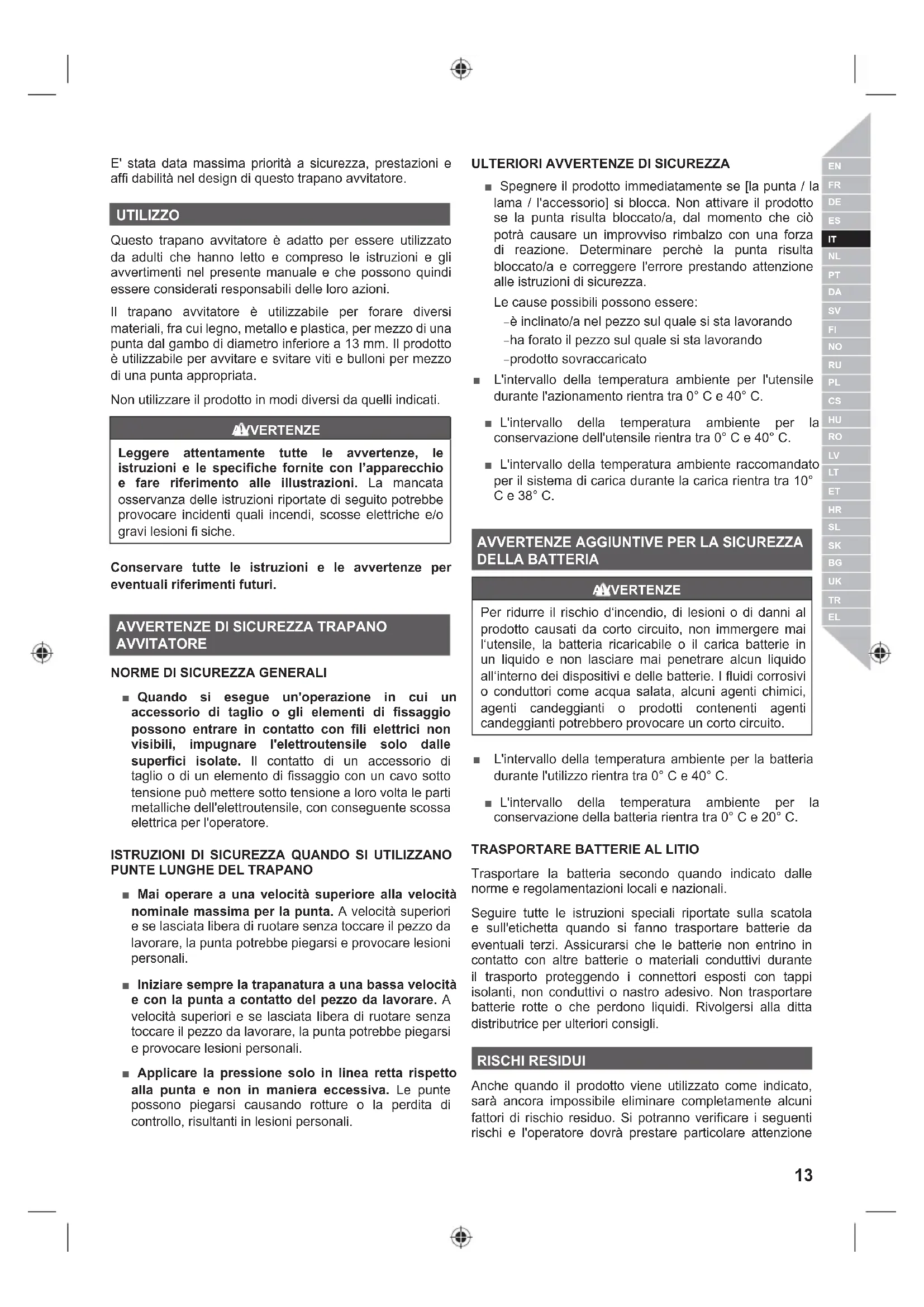 E' stata data massima priorità a sicurezza, prestazioni e affi dabilità nel design di questo trapano avvitatore. UTILIZZO Questo trapano avvitatore è adatto per essere utilizzato da adulti che hanno letto e compreso le istruzioni e gli avvertimenti nel presente manuale e che possono quindi essere considerati responsabili delle loro azioni. Il trapano avvitatore è utilizzabile per forare diversi materiali, fra cui legno, metallo e plastica, per mezzo di una punta dal gambo di diametro inferiore a 13 mm. Il prodotto è utilizzabile per avvitare e svitare viti e bulloni per mezzo di una punta appropriata. Non utilizzare il prodotto in modi diversi da quelli indicati. AVVERTENZE Leggere attentamente tutte le avvertenze, le istruzioni e le specifiche fornite con l’apparecchio e fare riferimento alle illustrazioni. La mancata osservanza delle istruzioni riportate di seguito potrebbe provocare incidenti quali incendi, scosse elettriche e/o gravi lesioni fi siche. Conservare tutte le istruzioni e le avvertenze per eventuali riferimenti futuri.