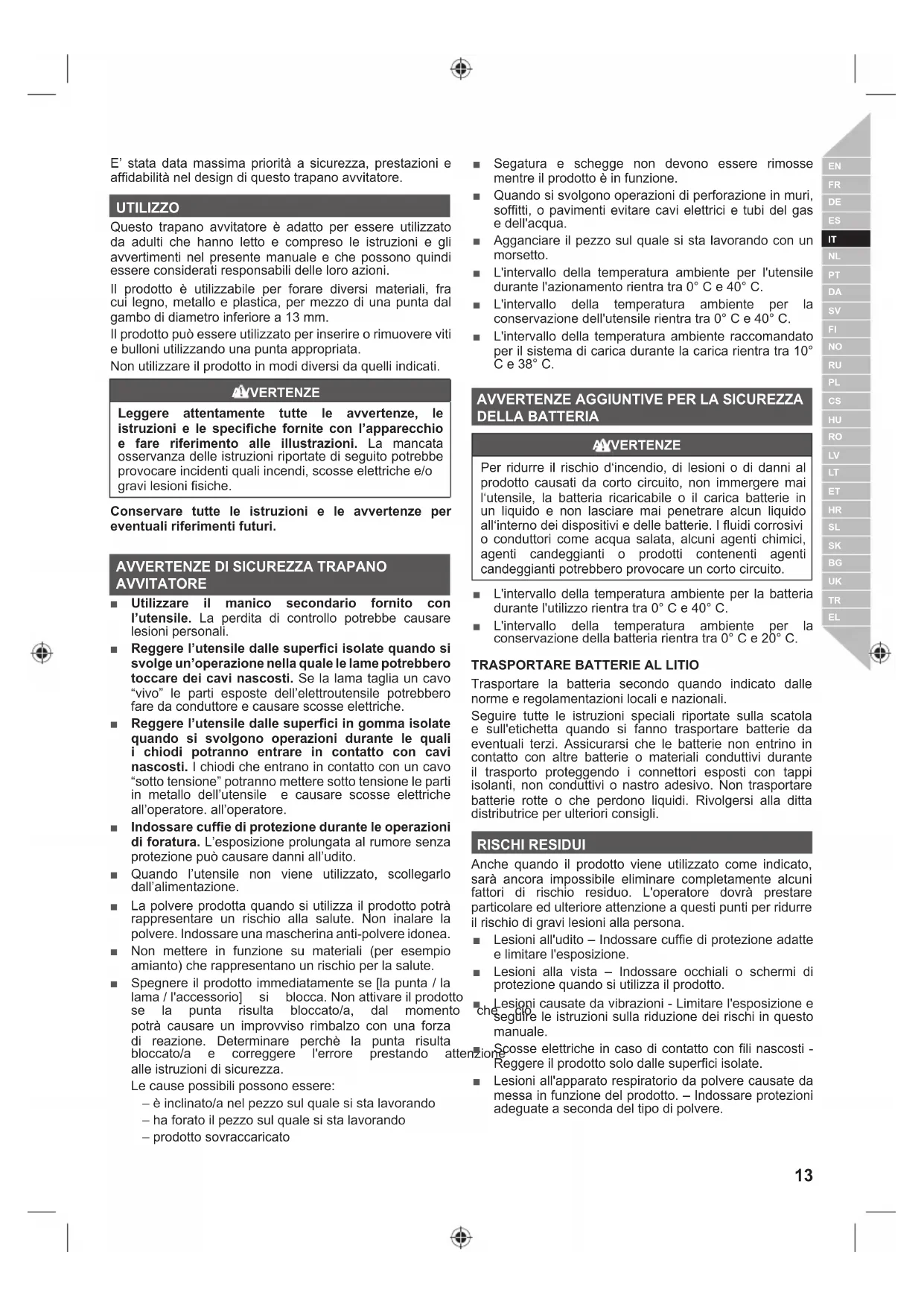 Trasportare la batteria secondo quando indicato dalle norme e regolamentazioni locali e nazionali. Seguire tutte le istruzioni speciali riportate sulla scatola e sull'etichetta quando si fanno trasportare batterie da eventuali terzi. Assicurarsi che le batterie non entrino in contatto con altre batterie o materiali conduttivi durante il trasporto proteggendo i connettori esposti con tappi isolanti, non conduttivi o nastro adesivo. Non trasportare batterie rotte o che perdono liquidi. Rivolgersi alla ditta distributrice per ulteriori consigli. RISCHI RESIDUI Anche quando il prodotto viene utilizzato come indicato, sarà ancora impossibile eliminare completamente alcuni fattori di rischio residuo. L'operatore dovrà prestare particolare ed ulteriore attenzione a questi punti per ridurre il rischio di gravi lesioni alla persona. Ŷ Lesioni all'udito – Indossare cuffie di protezione adatte e limitare l'esposizione. Ŷ Lesioni alla vista – Indossare occhiali o schermi di protezione quando si utilizza il prodotto. Ŷ Lesioni causate da vibrazioni - Limitare l'esposizione e seguire le istruzioni sulla riduzione dei rischi in questo manuale. Ŷ Scosse elettriche in caso di contatto con fili nascosti - Reggere il prodotto solo dalle superfici isolate. Ŷ Lesioni all'apparato respiratorio da polvere causate da messa in funzione del prodotto. – Indossare protezioni adeguate a seconda del tipo di polvere. 13 Italiano |