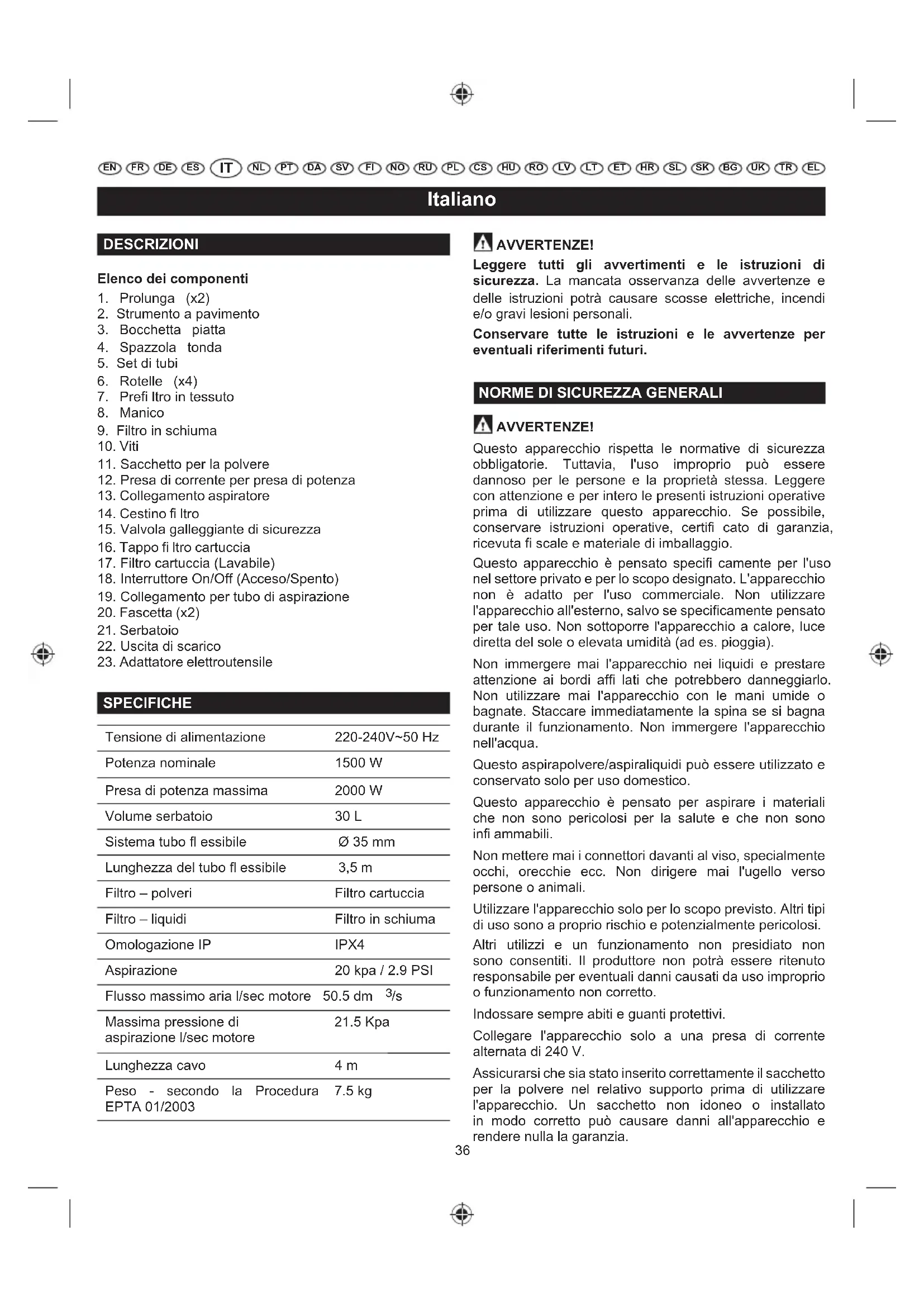 SPECIFICHE Tensione di alimentazione 220-240V~50 Hz Potenza nominale 1500 W Presa di potenza massima 2000 W Volume serbatoio 30 L Sistema tubo fl essibile Ø 35 mm Lunghezza del tubo fl essibile 3,5 m Filtro – polveri Filtro cartuccia Filtro – liquidi Filtro in schiuma Omologazione IP IPX4 Aspirazione 20 kpa / 2.9 PSI Flusso massimo aria l/sec motore 50.5 dm