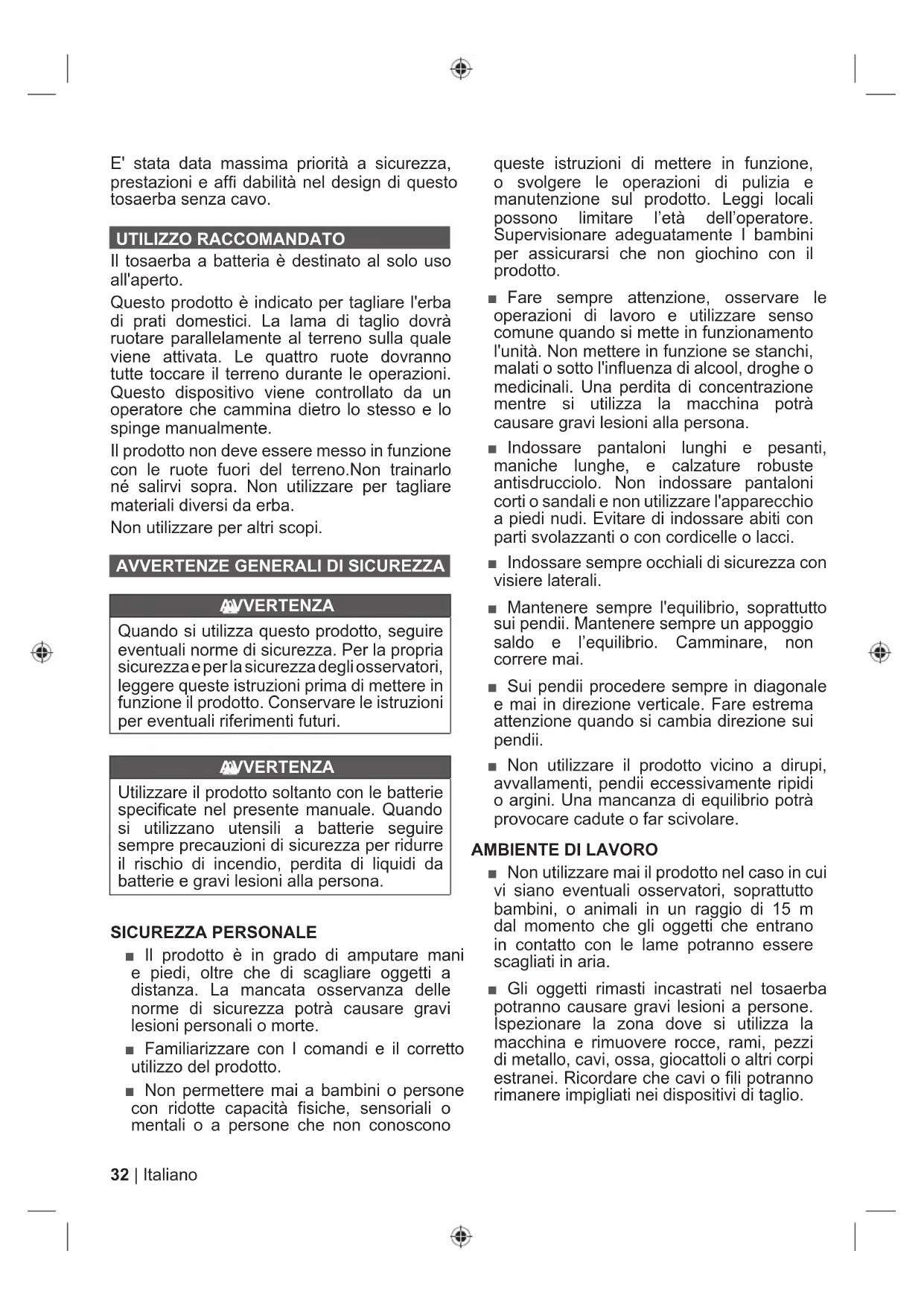 TRE' stata data massima priorità a sicurezza, prestazioni e affi dabilità nel design di questo tosaerba senza cavo. UTILIZZO RACCOMANDATO Il tosaerba a batteria è destinato al solo uso all'aperto. Questo prodotto è indicato per tagliare l'erba di prati domestici. La lama di taglio dovrà ruotare parallelamente al terreno sulla quale viene attivata. Le quattro ruote dovranno tutte toccare il terreno durante le operazioni. Questo dispositivo viene controllato da un operatore che cammina dietro lo stesso e lo spinge manualmente. Il prodotto non deve essere messo in funzione con le ruote fuori del terreno.Non trainarlo né salirvi sopra. Non utilizzare per tagliare materiali diversi da erba. Non utilizzare per altri scopi.
