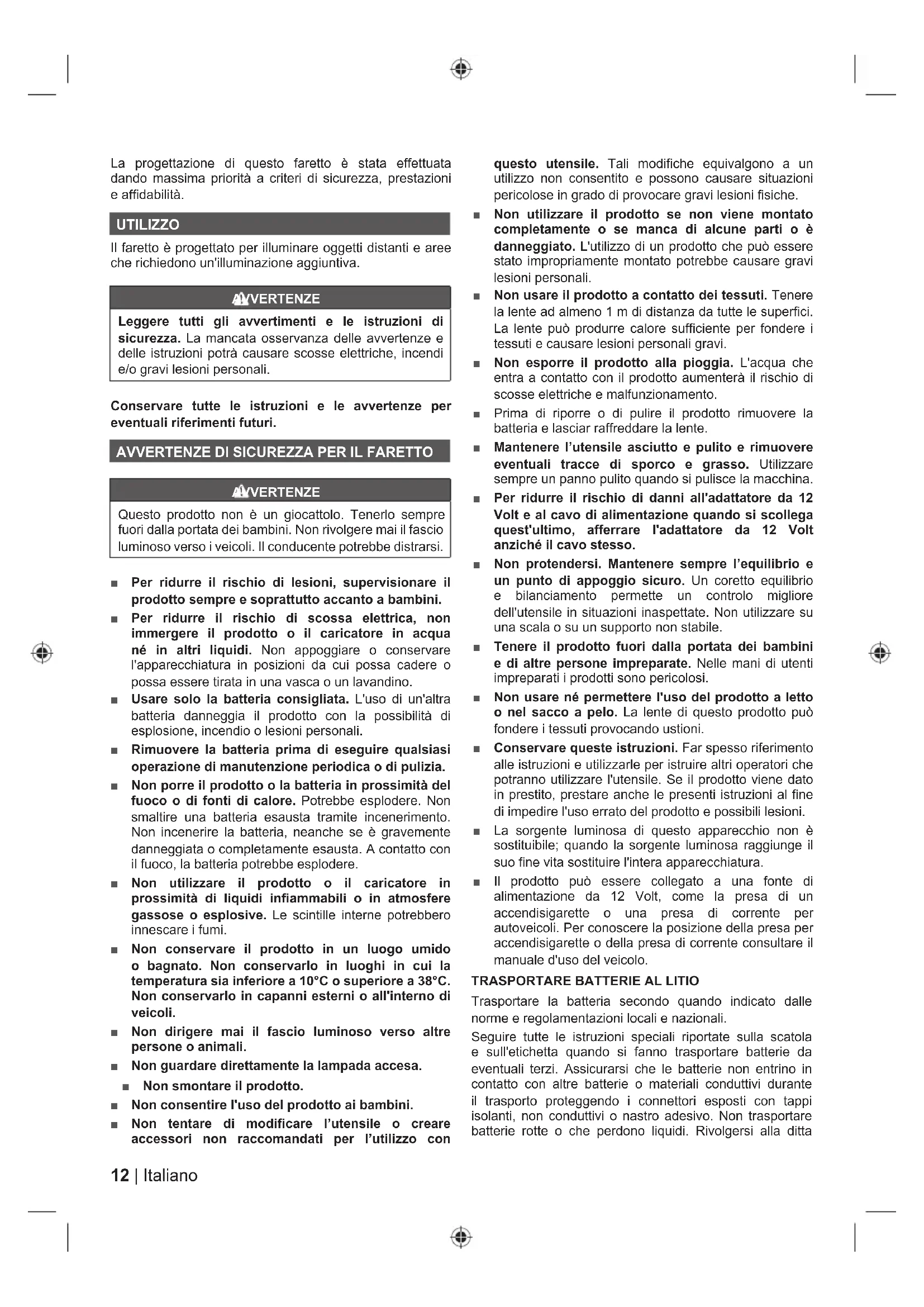 AVVERTENZE Questo prodotto non è un giocattolo. Tenerlo sempre fuori dalla portata dei bambini. Non rivolgere mai il fascio luminoso verso i veicoli. Il conducente potrebbe distrarsi. Ŷ Per ridurre il rischio di lesioni, supervisionare il prodotto sempre e soprattutto accanto a bambini. Ŷ Per ridurre il rischio di scossa elettrica, non immergere il prodotto o il caricatore in acqua né in altri liquidi. Non appoggiare o conservare l'apparecchiatura in posizioni da cui possa cadere o possa essere tirata in una vasca o un lavandino. Ŷ Usare solo la batteria consigliata. L'uso di un'altra batteria danneggia il prodotto con la possibilità di esplosione, incendio o lesioni personali. Ŷ Rimuovere la batteria prima di eseguire qualsiasi operazione di manutenzione periodica o di pulizia. Ŷ Non porre il prodotto o la batteria in prossimità del fuoco o di fonti di calore. Potrebbe esplodere. Non smaltire una batteria esausta tramite incenerimento. Non incenerire la batteria, neanche se è gravemente danneggiata o completamente esausta. A contatto con il fuoco, la batteria potrebbe esplodere. Ŷ Non utilizzare il prodotto o il caricatore in prossimità di liquidi infiammabili o in atmosfere gassose o esplosive. Le scintille interne potrebbero innescare i fumi. Ŷ Non conservare il prodotto in un luogo umido o bagnato. Non conservarlo in luoghi in cui la temperatura sia inferiore a 10°C o superiore a 38°C. Non conservarlo in capanni esterni o all'interno di veicoli. Ŷ Non dirigere mai il fascio luminoso verso altre persone o animali. Ŷ Non guardare direttamente la lampada accesa. Ŷ Non smontare il prodotto. Ŷ Non consentire l'uso del prodotto ai bambini. Ŷ Non tentare di modificare l’utensile o creare accessori non raccomandati per l’utilizzo con questo utensile. Tali modifiche equivalgono a un utilizzo non consentito e possono causare situazioni pericolose in grado di provocare gravi lesioni fisiche. Ŷ Non utilizzare il prodotto se non viene montato completamente o se manca di alcune parti o è danneggiato. L'utilizzo di un prodotto che può essere stato impropriamente montato potrebbe causare gravi lesioni personali. Ŷ Non usare il prodotto a contatto dei tessuti. Tenere la lente ad almeno 1 m di distanza da tutte le superfici. La lente può produrre calore sufficiente per fondere i tessuti e causare lesioni personali gravi. Ŷ Non esporre il prodotto alla pioggia. L'acqua che entra a contatto con il prodotto aumenterà il rischio di scosse elettriche e malfunzionamento. Ŷ Prima di riporre o di pulire il prodotto rimuovere la batteria e lasciar raffreddare la lente. Ŷ Mantenere l’utensile asciutto e pulito e rimuovere eventuali tracce di sporco e grasso. Utilizzare sempre un panno pulito quando si pulisce la macchina. Ŷ Per ridurre il rischio di danni all'adattatore da 12 Volt e al cavo di alimentazione quando si scollega quest'ultimo, afferrare l'adattatore da 12 Volt anziché il cavo stesso. Ŷ Non protendersi. Mantenere sempre l’equilibrio e un punto di appoggio sicuro. Un coretto equilibrio e bilanciamento permette un controlo migliore dell'utensile in situazioni inaspettate. Non utilizzare su una scala o su un supporto non stabile. Ŷ Tenere il prodotto fuori dalla portata dei bambini e di altre persone impreparate. Nelle mani di utenti impreparati i prodotti sono pericolosi. Ŷ Non usare né permettere l'uso del prodotto a letto o nel sacco a pelo. La lente di questo prodotto può fondere i tessuti provocando ustioni. Ŷ Conservare queste istruzioni. Far spesso riferimento alle istruzioni e utilizzarle per istruire altri operatori che potranno utilizzare l'utensile. Se il prodotto viene dato in prestito, prestare anche le presenti istruzioni al fine di impedire l'uso errato del prodotto e possibili lesioni. Ŷ La sorgente luminosa di questo apparecchio non è sostituibile; quando la sorgente luminosa raggiunge il suo fine vita sostituire l'intera apparecchiatura. Ŷ Il prodotto può essere collegato a una fonte di alimentazione da 12 Volt, come la presa di un accendisigarette o una presa di corrente per autoveicoli. Per conoscere la posizione della presa per accendisigarette o della presa di corrente consultare il manuale d'uso del veicolo.