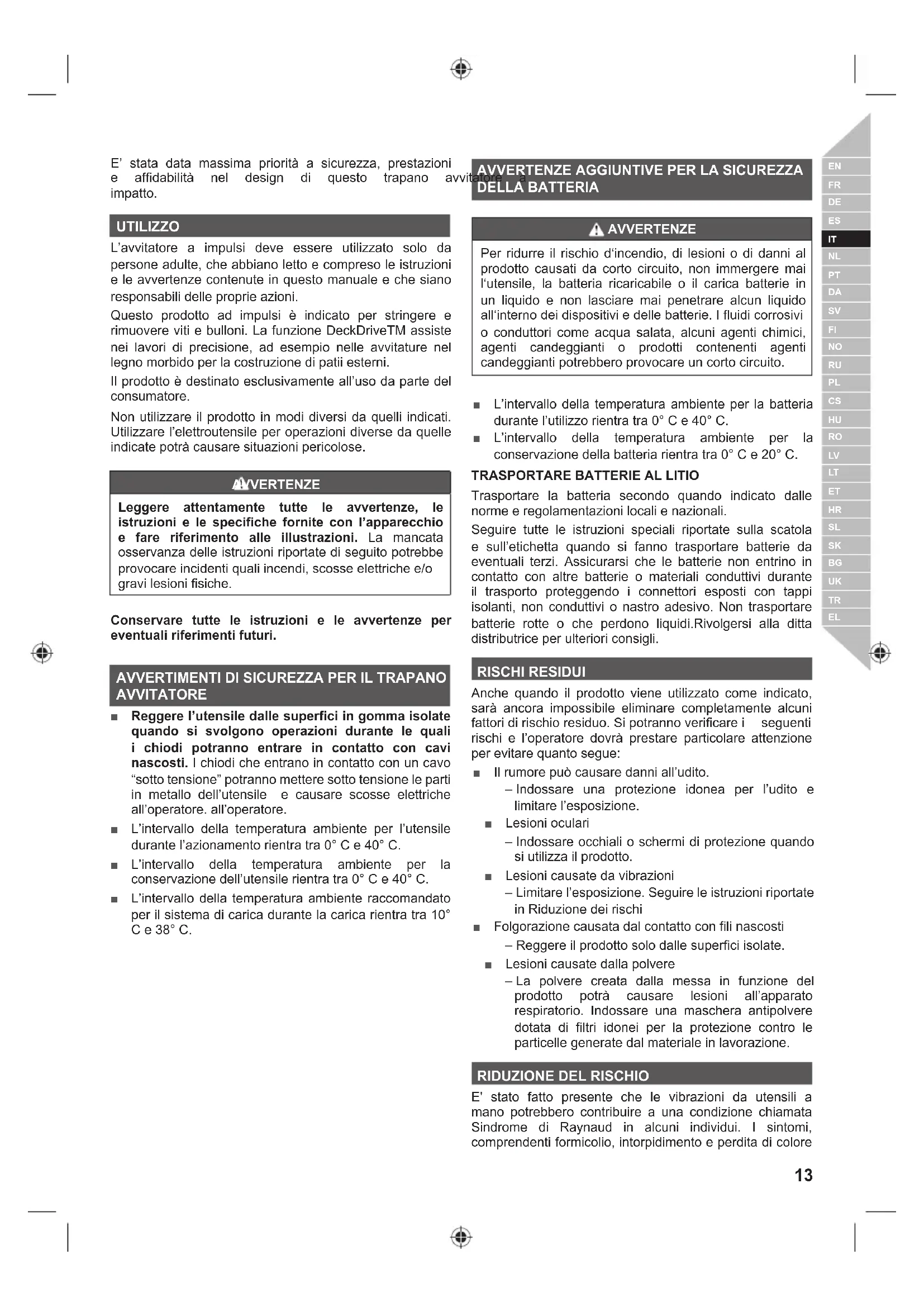 E’ stata data massima priorità a sicurezza, prestazioni H DI¿GDELOLWj QHO GHVLJQ GL TXHVWR WUDSDQR DYYLWDWRUH D impatto. UTILIZZO L’avvitatore a impulsi deve essere utilizzato solo da persone adulte, che abbiano letto e compreso le istruzioni e le avvertenze contenute in questo manuale e che siano responsabili delle proprie azioni. Questo prodotto ad impulsi è indicato per stringere e rimuovere viti e bulloni. La funzione DeckDriveTM assiste nei lavori di precisione, ad esempio nelle avvitature nel legno morbido per la costruzione di patii esterni. Il prodotto è destinato esclusivamente all’uso da parte del consumatore. Non utilizzare il prodotto in modi diversi da quelli indicati. Utilizzare l’elettroutensile per operazioni diverse da quelle indicate potrà causare situazioni pericolose. AVVERTENZE Leggere attentamente tutte le avvertenze, le istruzioni e le specifiche fornite con l’apparecchio e fare riferimento alle illustrazioni. La mancata osservanza delle istruzioni riportate di seguito potrebbe SURYRFDUHLQFLGHQWLTXDOLLQFHQGLVFRVVHHOHWWULFKHHR JUDYLOHVLRQL¿VLFKH Conservare tutte le istruzioni e le avvertenze per eventuali riferimenti futuri.