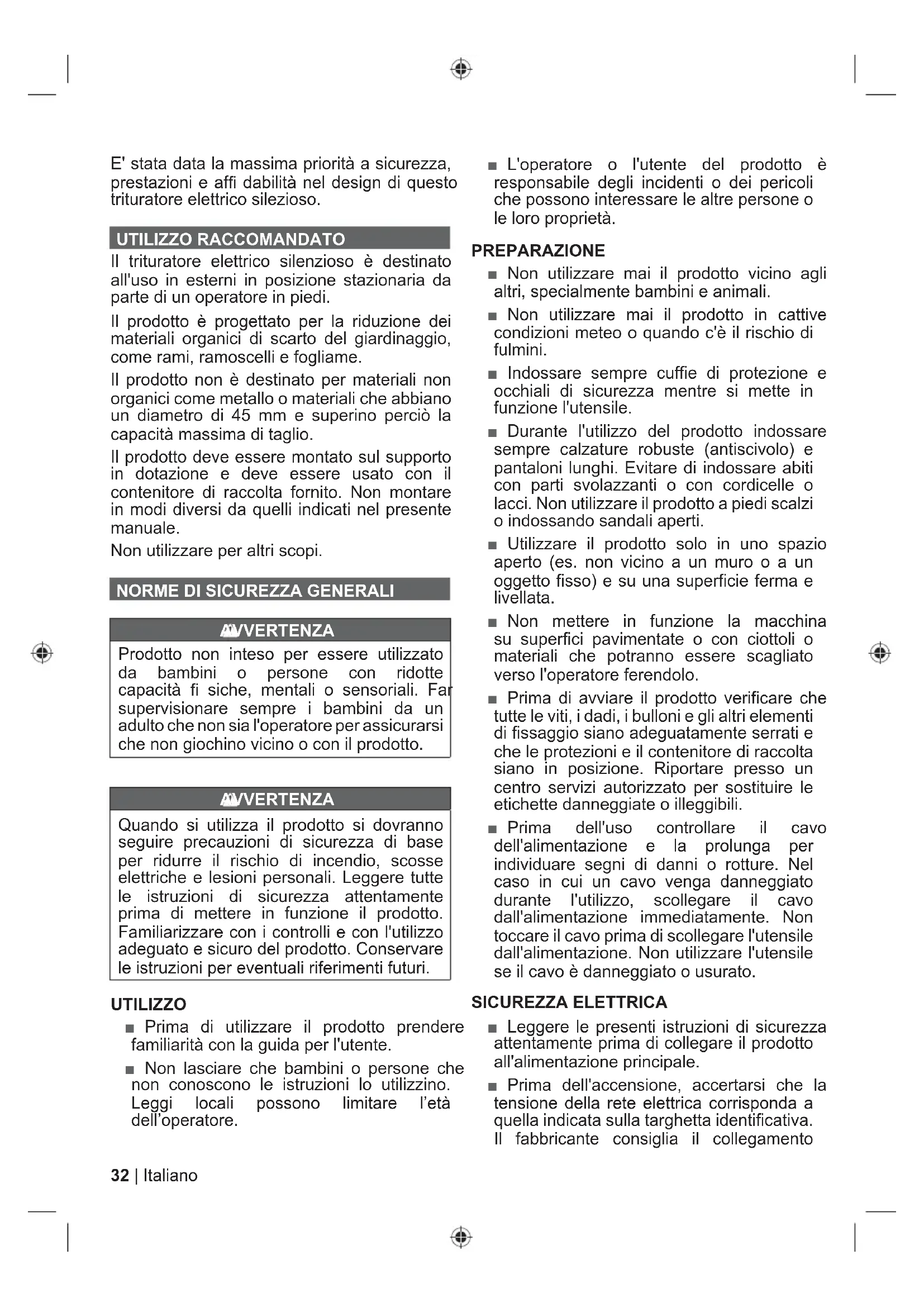 Il livello di potenza sonora garantito è 102 dB Classe II: Il doppio isolamento o l'isolamento rafforzato permettono di proteggersi dalle scosse elettriche. I prodotti elettrici non devono essere smaltiti con i rifi uti domestici. Vi sono strutture per smaltire tali prodotti. Informarsi presso il proprio Comune o rivenditore di sicurezza per smatire adeguatamente tali rifi uti. Avviamento Arresto Indietro Se il prodotto non riesce a triturare il materiale, la piastra di triturazione potrà dover essere regolata.