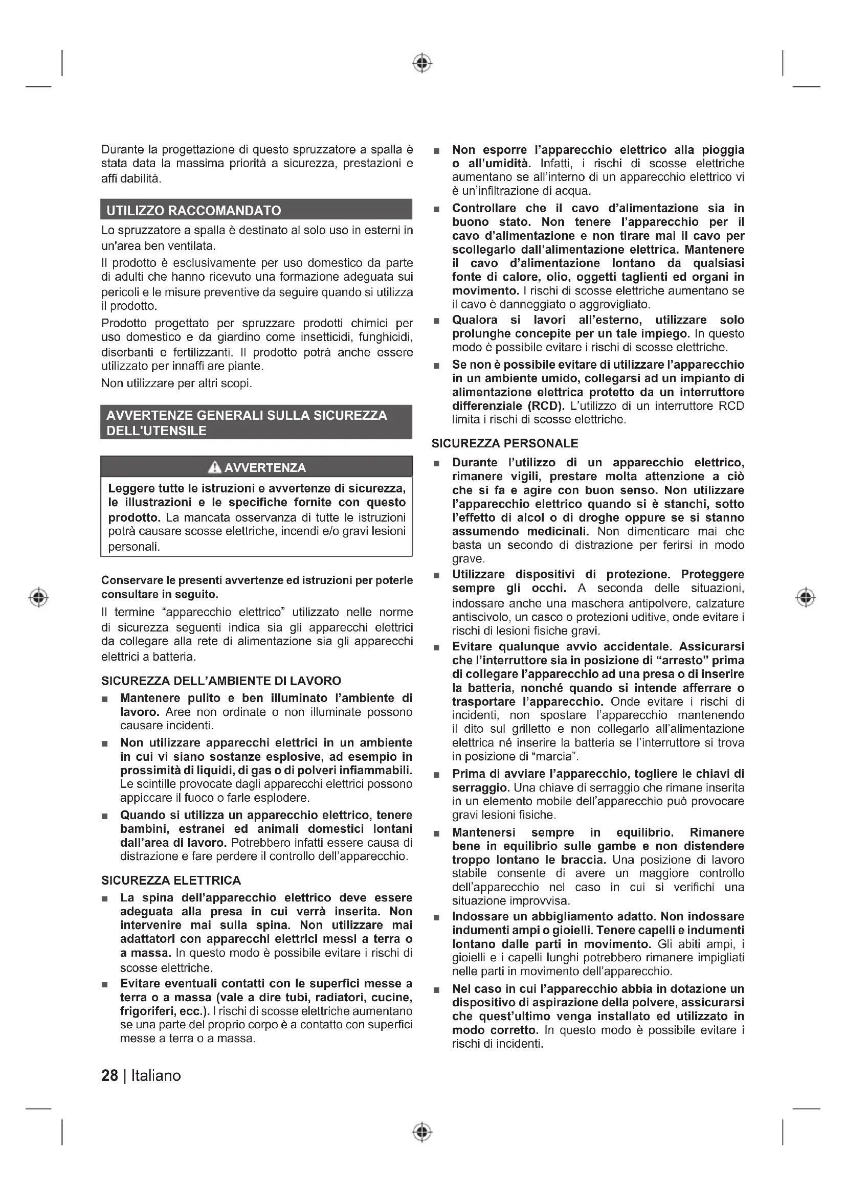 ■ Non lasciare mai che bambini, persone con ridotte capacità fisiche, sensoriali o mentali o mancanza di esperienza e conoscenza o persone non familiari con queste istruzioni utilizzino il prodotto. ■ Tenere eventuali osservatori, bambini e animali lontani durante le operazioni di lavoro. ■ Fare sempre attenzione ai rischi rappresentati dai materiali da spruzzare. Prima di utilizzare pesticidi o altri materiali da spruzzare con questo prodotto, leggere attentamente l'etichetta sul contenitore originale e seguire le istruzioni. ■ Assicurarsi che la bacchetta dello spruzzatore sia connessa con sicurezza al manico della bacchetta prima di utilizzare il prodotto. Se necessario, utilizzare delle pinze per collegare la bacchetta al manico dello spruzzatore. ■ Ricordarsi di riposizionare e serrare correttamente il coperchio del serbatoio dello spruzzatore dopo aver versato liquido nello stesso. ■ Utilizzare solo prodotti chimici per prati e giardini a base d'acqua. ■ Non utilizzare sostanze chimiche commerciali o per scopi commerciali o industriali. ■ Non utilizzare liquidi auto combustibili (alcali) o corrosivi (acidi) con il prodotto. Potranno corrodere le parti in metallo o indebolire il serbatoio e il tubo. ■ Non lasciare residui o materiale da spruzzare nel serbatoio dopo aver utilizzato il prodotto. Pulire dopo ogni utilizzo. ■ Non versare liquidi caldi o bollenti nel serbatoio dello spruzzatore. Potranno indebolire o danneggiare il tubo o il serbatoio dello spruzzatore. ■ Non riempire eccessivamente il serbatoio. ■ L'area di lavoro dovrà essere ben ventilata. ■ Non fumare, mangiare, né bere mentre si utilizza il prodotto. ■ Non scaricare i materiali a spruzzo direttamente sulla pelle. ■ Non lasciare che i materiali spruzzati entrino in contatto con la pelle. In caso di contatto, lavarsi immediatamente con acqua e sapone. ■ Puntare l'ugello direttamente verso le piante o gli oggetti da spruzzare. ■ Assicurarsi che tutti i materiali a spray vengano diretti su un'area che non potranno danneggiare. 30 | Italiano■ Rischio di scosse elettriche. Non spruzzare su prese elettriche. ■ Dopo ogni utilizzo, lavarsi le mani e tutte le parti della pelle che sono state esposte allo spruzzatore. ■ Rimuovere la batteria dal prodotto prima di svolgere le operazioni di denaggio, pulizia o riponimento per evitare un avvio accidentale. Indicazione che stabilisce che la macchina può essere assoggettata ai requisiti nazionali di normale ispezione da parte degli organi designati, come previsto dalla direttiva 2009/128/CE del Parlamento e del Consiglio Europeo del 21 ottobre 2009, che stabilisce la cornice d'azione Comunitaria sull'uso sostenibile dei pesticidi.