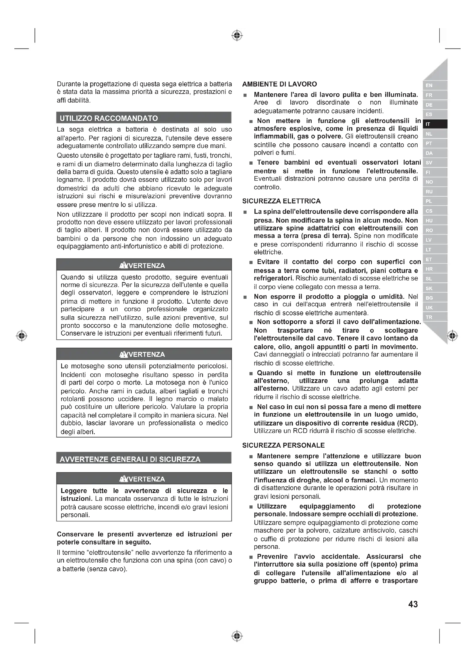 AVVERTENZE DI SICUREZZA MOTOSEGA
