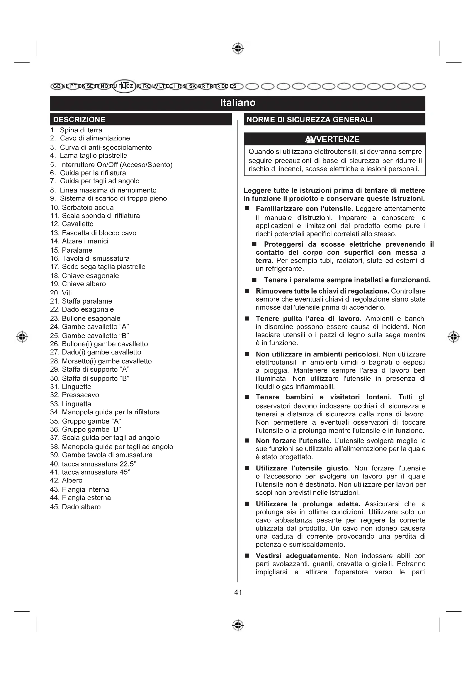 GB NL PT DK SE FI NO RU PL CZ HU RO LV LT EE HR SI SK GR TRFR DE ES dell'utensile in movimento. Si raccomanda di indossare guanti in gomma e calzature antiscivolo (con suola di gomma) quando si svolgono operazioni di lavoro all'esterno. Indossare inoltre una rete protettiva per proteggere i capelli lunghi. Indossare sempre occhiali di sicurezza con schermi laterali. I normali occhiali sono dotati solo di lenti resistenti agli impatti, NON sono occhiali di sicurezza. Assicurare il pezzo sul quale si sta lavorando. Utilizzare dei morsetti o ganasce per reggere le parti sulle quali si sta lavorando è più sicuro che tenere le parti ferme con una mano e permette di utilizzare entrambe le mani per operare l'utensile. Non protendersi. Mantenere sempre l'equilibrio e un punto di appoggio sicuro. Svolgere sempre le dovute manutenzioni sull'utensile. Mantenere sempre gli utensili in ordine e puliti per prestazioni migliori e più sicure. Seguire le istruzioni per lubrificare e cambiare gli accessori. Ispezionare periodicamente i cavi dell'utensile e, se danneggiati, farli riparare da un servizio clienti autorizzato. Ispezionare periodicamente la prolunga e sostituirla se danneggiata. Tenere i manici puliti, asciutti e senza tracce di olio e grasso. Scollegare gli utensili. Quando non si utilizza l'utensile, prima di svolgere la dovuta manutenzione o quando si cambiano gli accessori, le lame, le punte, i taglierini ecc. tutti gli utensili devono essere scollegati dall'alimentazione. Scollegare la spina prima di svolgere eventuali regolazioni e operazioni di manutenzione. Evitare l'avvio accidentale. Assicurarsi che l'interruttore sia spento prima di collegare l'utensile all'alimentazione. Utilizzare gli accessori raccomandati. Consultare il manuale d'istruzioni per gli accessori raccomandati. L'utilizzo di accessori diversi da quelli raccomandati potrà causare gravi lesioni. Non salire mai sull'utensile. Si potranno verificare gravi lesioni personali se l'utensile si rovescia o entrando accidentalmente in contatto con lo stesso. Controllare eventuali parti danneggiate. Prima di utilizzare ulteriormente l'utensile, controllare le sue protezioni o eventuali parti danneggiate e verificare che funzioni e svolga le sue funzioni correttamente. Controllare l'allineamento, il blocco o la rottura delle parti in movimento, il montaggio e qualsiasi altra condizione che potrà influenzare il funzionamento dell'utensile. Eventuali protezioni o parti danneggiate dovranno essere adeguatamente riparate o sostituite da un centro servizi autorizzato per evitare rischi di gravi lesioni personali. Utilizzare la direzione giusta. Inserire il materiale nella lama o taglierina solo nella direzione opposta a quella di rotazione. Non lasciare mai l'utensile incustodito. Spegnere l'alimentazione. Non lasciare l'utensile incustodito fino a che non si sia completamente fermato. Proteggere i polmoni. Indossare una maschera per il volto o per la polvere nel caso in cui si prevede di produrre polvere durante le operazioni. Proteggere l'udito. Indossare cuffie di protezione durante lunghi periodi di funzionamernto. Non sottoporre il cavo a stress. Non tirare mai il cavo per scollegarlo dalla spina. Tenere il cavo dell'alimentazione lontano da fonti di calore, olio e estremità appuntite. Tenere sempre il paralame installato e assicurarsi che funzioni correttamente. Tenere le mani lontane dall'area di taglio. Tenere le mani lontane dalla lama. Non posizionarsi sotto, sopra o attorno alla lama mentre è in movimento. Non tentare di rimuovere il materiale da tagliare mentre la lama si muove. La lama continua a girare per inerzia una volta spento l'utensile. Non utilizzare in atmosfere esplosive. L'accensione normale del motore potrà causare incendi. Ispezionare periodicamente i cavi degli utensili. In caso di danni, rivolgersi per le riparazioni a un tecnico qualificato presso un centro servizi autorizzato. Ispezionare periodicamente la prolunga e sostituirla se danneggiata. Collegare tutti gli utensili a terra. Se l'utensile è dotato di spina a tre perni, dovrà essere collegato con una presa elettrica tripolare. Consultare un tecnico o personale qualifi cato se le istruzioni per la messa a terra non sono chiare o se si hanno dubbi sulla corretta messa a terra del prodotto. Utilizzare solo i dispositivi elettrici corretti: prolunghe a 3 cavi con spine a 3 perni e connettori tripolari conformi con la spina dell'utensile. Non modifi care la presa fornita. Se la spina non entra nella presa, far installare una presa adatta da un tecnico qualifi cato. Mantenere l'utensile asciutto e pulito e rimuovere eventuali tracce di sporco e grasso. Utilizzare sempre un panno pulito quando si pulisce la macchina. Non utilizzare liquidi per freni, prodotti a base di benzina o petrolio o solventi per pulire l'utensile. Rimanere attenti ed esercitare sempre il massimo controllo. Prestare la massima attenzione a quello43 Italiano