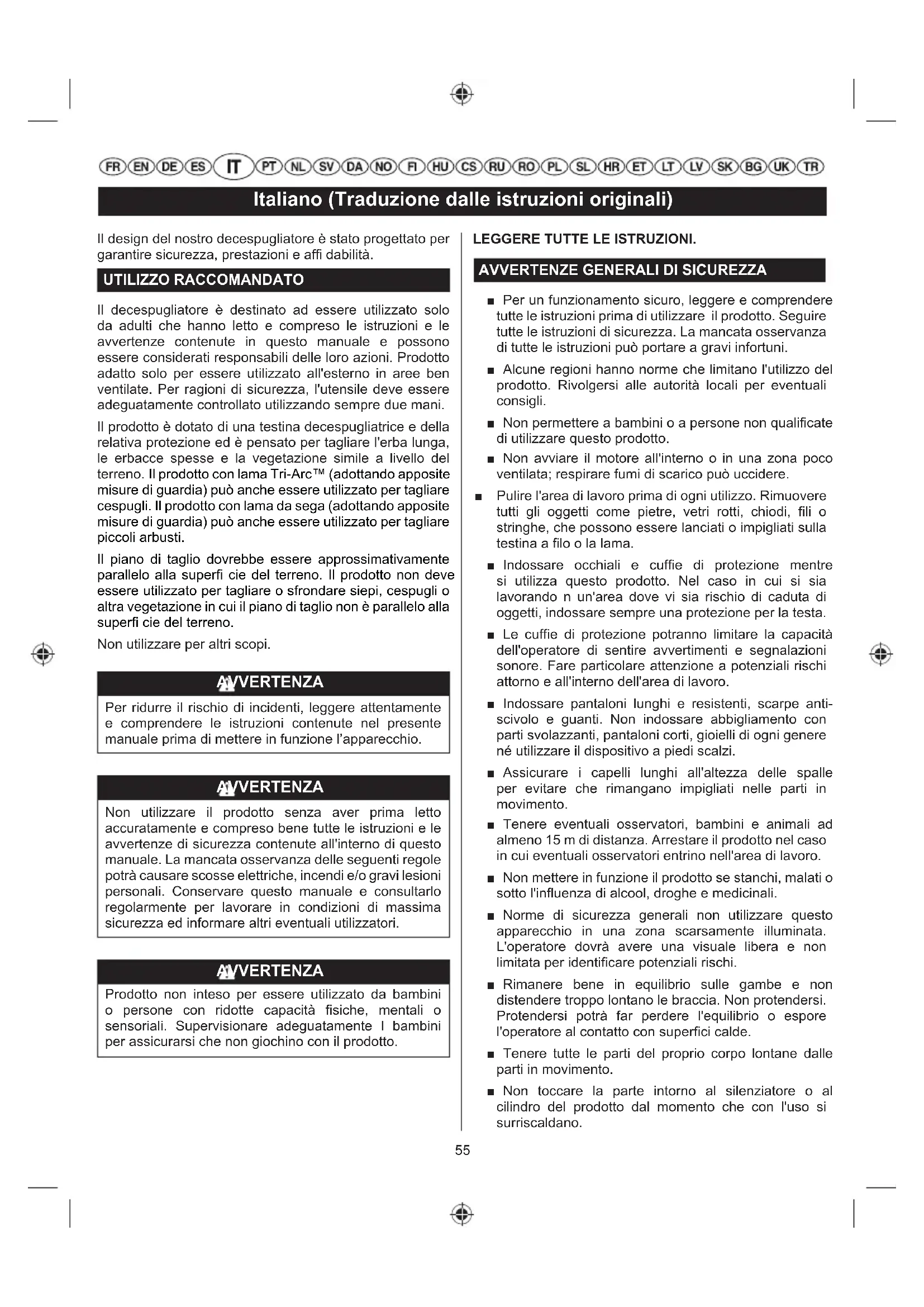 Ver fi gura 19. ■ Asegúrese de que el conmutador de encendido está en la posición de apagado (“off”). ■ Extraiga la perilla y la cubierta del filtro del aire. ■ Retire el filtro de aire y limpie con agua tibia y jabón. ■ Enjuague y deje que el filtro de aire se seque completamente. ■ Sustituya el filtro del aire. OBSERVACIÓN: Si están dañadas, substitúyalas cuanto antes. ■ Reemplace la tapa del filtro de aire. ■ Apriete la perilla del filtro del aire. OBSERVACIÓN: Para un mejor rendimiento, se debe sustituir el fi ltro de aire anualmente. COMPROBACIÓN DE LA TAPA DE COMBUSTIBLE ADVERTENCIA Una tapa de combustible que presente fugas constituye un peligro de incendio y deberá ser reemplazada de inmediato. La tapa del combustible contiene un fi ltro desechable y una válvula de retención. Un fi ltro de combustible atascado causará un rendimiento pobre del motor. Si el rendimiento mejora cuando se afl oja el tapón del combustible, puede signifi car que la válvula de retención está defectuosa o el fi ltro atascado. Reemplace la tapa del combustible si es necesario. BUJÍA Este motor utiliza una bujía L8RTF/NHSP LD o L8RTF/ BOSCH, o una bujía equivalente con una distancia entre electrodos de 0,5 mm. Use una pieza de recambio exacta. ADVERTENCIA Tenga cuidado para no dañar los hilos de la rosca de la bujía. En caso de que no enrosque bien, se dañaría gravemente el motor.55 Italiano (Traduzione dalle istruzioni originali) Il design del nostro decespugliatore è stato progettato per garantire sicurezza, prestazioni e affi dabilità. UTILIZZO RACCOMANDATO Il decespugliatore è destinato ad essere utilizzato solo da adulti che hanno letto e compreso le istruzioni e le avvertenze contenute in questo manuale e possono essere considerati responsabili delle loro azioni. Prodotto adatto solo per essere utilizzato all'esterno in aree ben ventilate. Per ragioni di sicurezza, l'utensile deve essere adeguatamente controllato utilizzando sempre due mani. Il prodotto è dotato di una testina decespugliatrice e della relativa protezione ed è pensato per tagliare l'erba lunga, le erbacce spesse e la vegetazione simile a livello del terreno. Il prodotto con lama Tri-Arc™ (adottando apposite misure di guardia) può anche essere utilizzato per tagliare cespugli. Il prodotto con lama da sega (adottando apposite misure di guardia) può anche essere utilizzato per tagliare piccoli arbusti. Il piano di taglio dovrebbe essere approssimativamente parallelo alla superfi cie del terreno. Il prodotto non deve essere utilizzato per tagliare o sfrondare siepi, cespugli o altra vegetazione in cui il piano di taglio non è parallelo alla superfi cie del terreno. Non utilizzare per altri scopi. AVVERTENZA Per ridurre il rischio di incidenti, leggere attentamente e comprendere le istruzioni contenute nel presente manuale prima di mettere in funzione l’apparecchio. AVVERTENZA Non utilizzare il prodotto senza aver prima letto accuratamente e compreso bene tutte le istruzioni e le avvertenze di sicurezza contenute all'interno di questo manuale. La mancata osservanza delle seguenti regole potrà causare scosse elettriche, incendi e/o gravi lesioni personali. Conservare questo manuale e consultarlo regolarmente per lavorare in condizioni di massima sicurezza ed informare altri eventuali utilizzatori. AVVERTENZA Prodotto non inteso per essere utilizzato da bambini o persone con ridotte capacità fisiche, mentali o sensoriali. Supervisionare adeguatamente I bambini per assicurarsi che non giochino con il prodotto. LEGGERE TUTTE LE ISTRUZIONI.