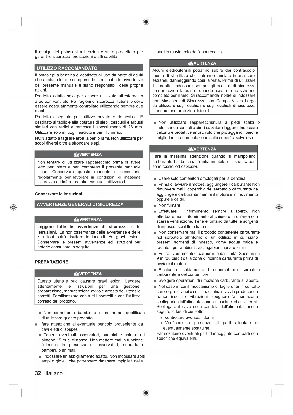 AVVERTENZA Leggere tutte le avvertenze di sicurezza e le istruzioni. La non osservanza delle avvertenze e delle istruzioni potrà risultare in incendi e/o gravi lesioni. Conservare le presenti avvertenze ed istruzioni per poterle consultare in seguito. PREPARAZIONE AVVERTENZA Questo utensile può causare gravi lesioni. Leggere attentamente le istruzioni per una gestione, preparazione, manutenzione avvio e arresto dell'utensile corretti. Familiarizzare con tutti i controlli e con l'utilizzo corretto del prodotto. ■ Non permettere a bambini o a persone non qualificate di utilizzare questo prodotto. ■ fare attenzione all'eventuale pericolo proveniente da cavi elettrici sospesi ■ Tenere eventuali osservatori, bambini e animali ad almeno 15 m di distanza. Non mettere mai in funzione l'utensile in presenza di osservatori, soprattutto bambini, o animali. ■ Indossare un abbigliamento adatto. Non indossare abiti ampi o gioielli che potrebbero rimanere impigliati nelle parti in movimento dell'apparecchio. AVVERTENZA Alcuni elettroutensili potranno subire dei contraccolpi mentre li si utilizza che potranno lanciare in aria corpi estranei, danneggiando così la vista. Prima di utilizzare il prodotto, indossare sempre gli occhiali di sicurezza con protezioni laterali e, quando occorre, uno schermo completo per il viso. Si raccomanda inoltre di indossare una Maschera di Sicurezza con Campo Visivo Largo da utilizzare sugli occhiali o sugli occhiali di sicurezza standard con protezioni laterali. ■ Non utilizzare l'apparecchiatura a piedi scalzi o indossando sandali o simili calzature leggere. Indossare calzature protettive antiscivolo che proteggano i piedi e migliorino la deambulazione sulle superfici scivolose. AVVERTENZA Fare la massima attenzione quando si manipolano carburanti. La benzina è infiammabile e i suoi vapori sono tossici ed esplosivi. ■ Usare solo contenitori omologati per la benzina. ■ Prima di avviare il motore, aggiungere il carburante Non rimuovere mai il coperchio del serbatoio carburante né aggiungere carburante mentre il motore è in movimento oppure è caldo. ■ Non fumare. ■ Effettuare il rifornimento sempre all'aperto. Non effettuare mai il rifornimento al chiuso o in un'area con scarsa ventilazione. Tenere lontano da tutte le sorgenti di innesco, scintille e fiamme. ■ Non conservare mai il prodotto contenente carburante nel serbatoio all'interno di un edificio in cui siano presenti sorgenti di innesco, come acqua calda e radiatori per ambienti, asciugabiancheria e simili. ■ Pulire i versamenti di carburante dall’unità. Spostarsi a 9 m (30 piedi) dalla zona di ricarica carburante prima di avviare il motore. ■ Richiudere saldamente i coperchi del serbatoio carburante e del contenitore. ■ Svolgere operazioni di rimozione carburante all'aperto. ■ Nel caso in cui il meccanismo di taglio entri in contatto con corpi estranei o se la macchina si avvia producendo rumori insoliti o vibrazioni, spegnere l'alimentazone scollegarla dall'alimentazione e lasciare che si fermi. Scollegare il cavo della candela dall'alimentazione e seguire le fasi di cui sotto: ● controllare eventuali danni ● Verificare la presenza di parti allentate ed eventualmente sostituirle. Far sostituire eventuali parti danneggiate con parti con specifiche equivalenti.33 Italiano |