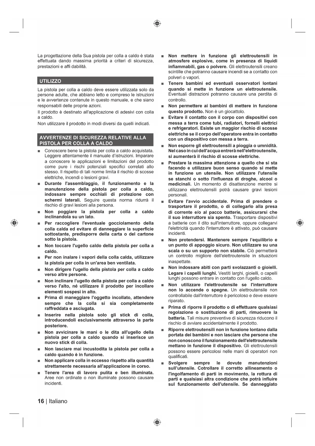 ■ Conoscere bene la pistola per colla a caldo acquistata. Leggere attentamente il manuale d’istruzioni. Imparare a conoscere le applicazioni e limitazioni del prodotto come pure i rischi potenziali specifici correlati allo stesso. Il rispetto di tali norme limita il rischio di scosse elettriche, incendi o lesioni gravi. ■ Durante l'assemblaggio, il funzionamento e la manutenzione della pistola per colla a caldo, indossare sempre occhiali di protezione con schermi laterali. Seguire questa norma ridurrà il rischio di gravi lesioni alla persona. ■ Non poggiare la pistola per colla a caldo inclinandola su un lato. ■ Per raccogliere l'eventuale gocciolamento della colla calda ed evitare di danneggiare la superficie sottostante, predisporre della carta o del cartone sotto la pistola. ■ Non toccare l'ugello caldo della pistola per colla a caldo. ■ Per non inalare i vapori della colla calda, utilizzare la pistola per colla in un'area ben ventilata. ■ Non dirigere l'ugello della pistola per colla a caldo verso altre persone. ■ Non inclinare l'ugello della pistola per colla a caldo verso l'alto, né utilizzare il prodotto per incollare elementi sospesi in alto. ■ Prima di maneggiare l'oggetto incollato, attendere sempre che la colla si sia completamente raffreddata e asciugata. ■ Inserire nella pistola solo gli stick di colla, introducendoli esclusivamente attraverso la parte posteriore. ■ Non avvicinare le mani o le dita all'ugello della pistola per colla a caldo quando si inserisce un nuovo stick di colla. ■ Non lasciare mai incustodita la pistola per colla a caldo quando è in funzione. ■ Non applicare colla in eccesso rispetto alla quantità strettamente necessaria all'applicazione in corso. ■ Tenere l'area di lavoro pulita e ben illuminata. Aree non ordinate o non illuminate possono causare incidenti. ■ Non mettere in funzione gli elettroutensili in atmosfere esplosive, come in presenza di liquidi infiammabili, gas o polvere. Gli elettroutensili creano scintille che potranno causare incendi se a contatto con polveri o vapori. ■ Tenere bambini ed eventuali osservatori lontani quando si mette in funzione un elettroutensile. Eventuali distrazioni potranno causare una perdita di controllo. ■ Non permettere ai bambini di mettere in funzione questo prodotto. Non è un giocattolo. ■ Evitare il contatto con il corpo con dispositivi con messa a terra come tubi, radiatori, fornelli elettrici e refrigeratori. Esiste un maggior rischio di scosse elettriche se il corpo dell'operatore entra in contatto con un dispositivo con messa a terra. ■ Non esporre gli elettroutensili a pioggia o umnidità. Nel caso in cui dell'acqua entrerà nell'elettroutensile, si aumenterà il rischio di scosse elettriche. ■ Prestare la massima attenzione a quello che si sta facendo e utilizzare buon senso quando si mette in funzione un utensile. Non utilizzare l'utensile se stanchi o sotto l'influenza di droghe, alcool o medicinali. Un momento di disattenzione mentre si utilizzano elettroutensili potrà causare gravi lesioni personali. ■ Evitare l'avvio accidentale. Prima di prendere o trasportare il prodotto, o di collegarlo alla presa di corrente e/o al pacco batterie, assicurarsi che il suo interruttore sia spento. Trasportare dispositivi a batterie con il dito sull'interruttore, oppure collegarvi l'elettricità quando l'interruttore è attivato, può causare incidenti. ■ Non protendersi. Mantenere sempre l’equilibrio e un punto di appoggio sicuro. Non utilizzare su una scala o su un supporto non stabile. Ciò permetterà un controllo migliore dell'elettroutensile in situazioni inaspettate. ■ Non indossare abiti con parti svolazzanti o gioielli. Legare i capelli lunghi. Vestiti larghi, gioielli, o capelli lunghi possono entrare in contatto con l'ugello caldo. ■ Non utilizzare l'elettroutensile se l'interruttore non lo accende o spegne. Un elettroutensile non controllabile dall'interruttore è pericoloso e deve essere riparato. ■ Prima di riporre il prodotto o di effettuare qualsiasi regolazione o sostituzione di parti, rimuovere la batteria. Tali misure preventive di sicurezza riducono il rischio di avviare accidentalmente il prodotto. ■ Riporre elettroutensili non in funzione lontano dalla portata dei bambini e non lasciare che persone che non conoscono il funzionamento dell'elettroutensile mettano in funzione il dispositivo. Gli elettroutensili possono essere pericolosi nelle mani di operatori non qualificati. ■ Svolgere sempre le dovute manutenzioni sull’utensile. Cotrollare il corretto allineamento o l'ingolfamento di parti in movimento, la rottura di parti e qualsiasi altra condizione che potrà influire sul funzionamento dell'utensile. Se danneggiato17 Italiano |
