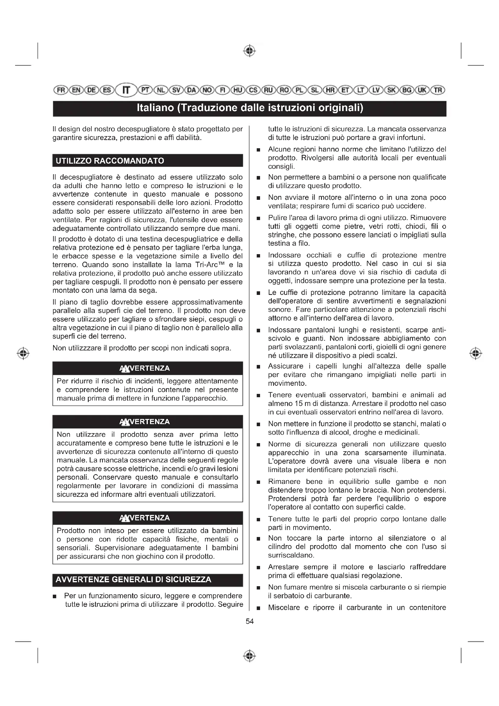 ■ Per un funzionamento sicuro, leggere e comprendere tutte le istruzioni prima di utilizzare il prodotto. Seguire tutte le istruzioni di sicurezza. La mancata osservanza di tutte le istruzioni può portare a gravi infortuni. ■ Alcune regioni hanno norme che limitano l'utilizzo del prodotto. Rivolgersi alle autorità locali per eventuali consigli. ■ Non permettere a bambini o a persone non qualificate di utilizzare questo prodotto. ■ Non avviare il motore all'interno o in una zona poco ventilata; respirare fumi di scarico può uccidere. ■ Pulire l'area di lavoro prima di ogni utilizzo. Rimuovere tutti gli oggetti come pietre, vetri rotti, chiodi, fili o stringhe, che possono essere lanciati o impigliati sulla testina a filo. ■ Indossare occhiali e cuffie di protezione mentre si utilizza questo prodotto. Nel caso in cui si sia lavorando n un'area dove vi sia rischio di caduta di oggetti, indossare sempre una protezione per la testa. ■ Le cuffie di protezione potranno limitare la capacità dell'operatore di sentire avvertimenti e segnalazioni sonore. Fare particolare attenzione a potenziali rischi attorno e all'interno dell'area di lavoro. ■ Indossare pantaloni lunghi e resistenti, scarpe anti- scivolo e guanti. Non indossare abbigliamento con parti svolazzanti, pantaloni corti, gioielli di ogni genere né utilizzare il dispositivo a piedi scalzi. ■ Assicurare i capelli lunghi all'altezza delle spalle per evitare che rimangano impigliati nelle parti in movimento. ■ Tenere eventuali osservatori, bambini e animali ad almeno 15 m di distanza. Arrestare il prodotto nel caso in cui eventuali osservatori entrino nell'area di lavoro. ■ Non mettere in funzione il prodotto se stanchi, malati o sotto l'influenza di alcool, droghe e medicinali. ■ Norme di sicurezza generali non utilizzare questo apparecchio in una zona scarsamente illuminata. L'operatore dovrà avere una visuale libera e non limitata per identificare potenziali rischi. ■ Rimanere bene in equilibrio sulle gambe e non distendere troppo lontano le braccia. Non protendersi. Protendersi potrà far perdere l'equilibrio o espore l'operatore al contatto con superfici calde. ■ Tenere tutte le parti del proprio corpo lontane dalle parti in movimento. ■ Non toccare la parte intorno al silenziatore o al cilindro del prodotto dal momento che con l'uso si surriscaldano. ■ Arrestare sempre il motore e lasciarlo raffreddare prima di effettuare qualsiasi regolazione. ■ Non fumare mentre si miscela carburante o si riempie il serbatoio di carburante. ■ Miscelare e riporre il carburante in un contenitore55 Italiano (Traduzione dalle istruzioni originali) idoneo. ■ Miscelare il carburante all’aperto, in assenza di scintille o fiamme. Ripulire qualsiasi versamento. Spostarsi a 9 m (30 piedi) dalla zona di ricarica carburante prima di avviare il motore. ■ Arrestare il motore e lasciarlo raffreddare prima di ricaricare l'utensile di carburante, prima di riporre o trasportare l'utensile. ■ Lasciare raffreddare il motore; svuotare il serbatoio del carburante e il serbatoio dell'olio, e fissare l'unità per impedire che si muova prima di trasportarla in un veicolo. ■ Arrestare sempre il motore per assicurarsi che tutte le parti in movimento si siano fermate prima di: ● assistenza ● Lasciare il prodotto incustodito ● Pulizia del prodotto ● Cambio accessori ● rimozione dei blocchi ● Controllare eventuali danni dopo aver colpito un oggetto ● Controllare eventuali danni se il prodotto inizia a vibrare eccessivamente ● Svolgere le operazioni di manutenzione ● rimozione della lama ● montaggio della lama AVVERTENZA Non usare mezzi di taglio o accessori non specificati da Ryobi in questo manuale. Questo comprende l'uso di lame a cerniera in più parti e lame battenti. Questi elementi sono noti per rompersi durante l'uso e presentano un elevato rischio di gravi lesioni all'operatore o ai presenti. AVVERTENZA Controllare l'utensile dopo che è caduto o dopo altri tipi di impatti Ispezionare il prodotto e identificare eventuali difetti o danni. Riparare eventuali parti danneggiate o farle sostituire da un centro servizi autorizzato.
