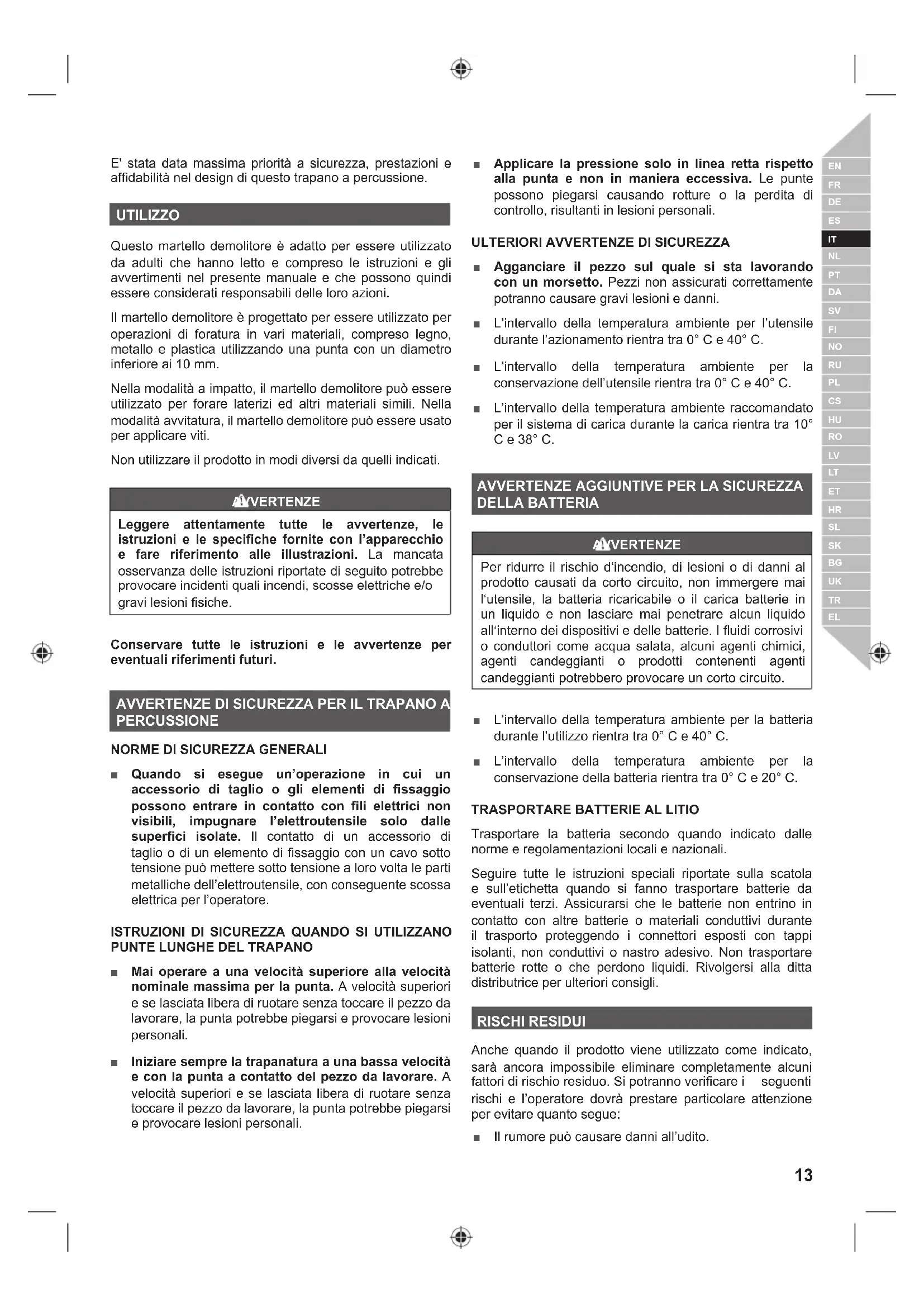 E' stata data massima priorità a sicurezza, prestazioni e DI¿GDELOLWjQHOGHVLJQGLTXHVWRWUDSDQRDSHUFXVVLRQH UTILIZZO Questo martello demolitore è adatto per essere utilizzato da adulti che hanno letto e compreso le istruzioni e gli avvertimenti nel presente manuale e che possono quindi essere considerati responsabili delle loro azioni. Il martello demolitore è progettato per essere utilizzato per operazioni di foratura in vari materiali, compreso legno, metallo e plastica utilizzando una punta con un diametro inferiore ai 10 mm. Nella modalità a impatto, il martello demolitore può essere utilizzato per forare laterizi ed altri materiali simili. Nella modalità avvitatura, il martello demolitore può essere usato per applicare viti. Non utilizzare il prodotto in modi diversi da quelli indicati. AVVERTENZE Leggere attentamente tutte le avvertenze, le istruzioni e le specifiche fornite con l’apparecchio e fare riferimento alle illustrazioni. La mancata osservanza delle istruzioni riportate di seguito potrebbe SURYRFDUHLQFLGHQWLTXDOLLQFHQGLVFRVVHHOHWWULFKHHR JUDYLOHVLRQL¿VLFKH Conservare tutte le istruzioni e le avvertenze per eventuali riferimenti futuri. AVVERTENZE DI SICUREZZA PER IL TRAPANO A PERCUSSIONE