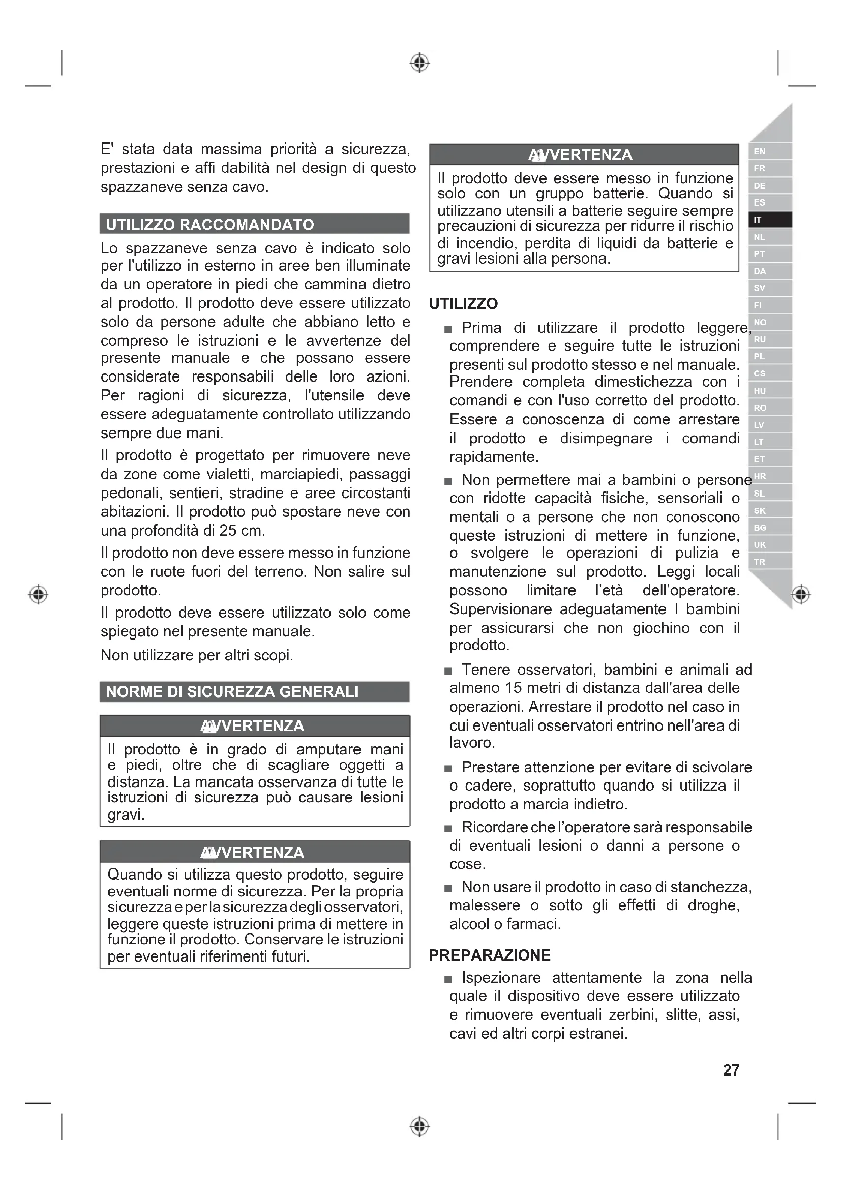 E' stata data massima priorità a sicurezza, prestazioni e affi dabilità nel design di questo spazzaneve senza cavo. UTILIZZO RACCOMANDATO Lo spazzaneve senza cavo è indicato solo per l'utilizzo in esterno in aree ben illuminate da un operatore in piedi che cammina dietro al prodotto. Il prodotto deve essere utilizzato solo da persone adulte che abbiano letto e compreso le istruzioni e le avvertenze del presente manuale e che possano essere considerate responsabili delle loro azioni. Per ragioni di sicurezza, l'utensile deve essere adeguatamente controllato utilizzando sempre due mani. Il prodotto è progettato per rimuovere neve da zone come vialetti, marciapiedi, passaggi pedonali, sentieri, stradine e aree circostanti abitazioni. Il prodotto può spostare neve con una profondità di 25 cm. Il prodotto non deve essere messo in funzione con le ruote fuori del terreno. Non salire sul prodotto. Il prodotto deve essere utilizzato solo come spiegato nel presente manuale. Non utilizzare per altri scopi.