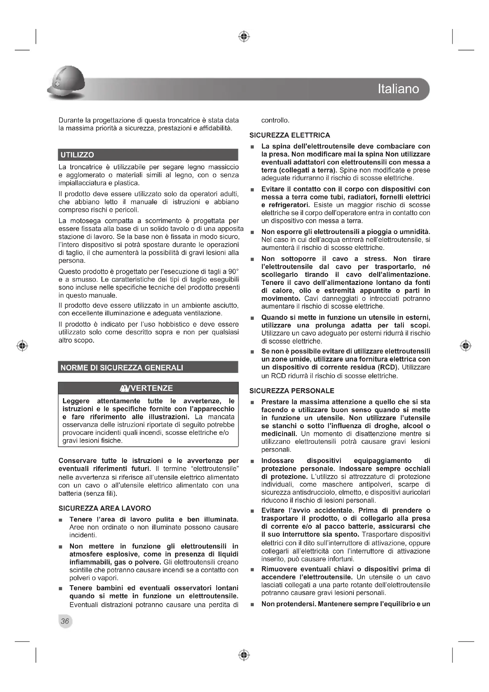Ŷ Tenere sempre lontano il cavo di collegamento dall’area di lavoro dell’attrezzo. Tenere lontano dall’area in cui si trova l’operatore. Ŷ Non esporsi sull’area accanto alla lama a meno che la lama non si sia completamente arrestata. Ŷ Prima di ogni utilizzo controllare che il cavo di alimentazione, eventuali prolunghe e la spina siano integre e senza danni. Riparazioni a tutto l’utensile compreso il cavo dell’alimentazione dovranno essere svolte solo da personale autorizzato. Ŷ Utilizzare sempre le protezioni presenti sul prodotto. Non utilizzare il prodotto se le protezioni non sono in posizione o non funzionano correttamente. Ŷ Il coprilama inferiore deve aprirsi solo quando la lama è abbassata sul pezzo in lavorazione e deve poter muoversi sempre liberamente e chiudere automaticamente. Ŷ Fissare e utilizzare sempre le barre di prolunga per supportare il pezzo in lasvorazione durante il funzionamento della sega. Ŷ Non apportare mai modifiche al prodotto o alle sue modalità di funzionamento. La sicurezza dell’utente potrà essere compromessa. Ŷ Non utilizzare lame rotte, danneggiate o deformate. Ŷ Non utilizzare lame di sega fatte in acciaio rapido. Ŷ Utilizzare solo lame affilate. Sostituire le lame non più affilate. Ŷ Utilizzare sempre lame di dimensioni e forma idonee all’alesaggio dell’albero. Una lama non idonea all’albero sul quale deve essere montata non è in grado di girare correttamente e potrebbe causare una perdita del controllo dell’apparecchio. Ŷ Utilizzare solo le lame per la lavorazione del legno specificate in questo manuale, conformi allo standard EN 847-1. Ŷ Non utilizzare flange, rondelle e dadi per assicurare la motosega diversi da quelli forniti o indicati nel manuale d’istruzioni. Ŷ Scegliere una lama di sega adatta al materiale da tagliare. Non usare mai il prodotto per tagliare materiali diversi da quelli specificati in questo manuale nella sezione relativa all’uso previsto. Ŷ Durante il taglio è importante evitare il surriscaldamento della lama e l’eventuale fusione di parti in plastica. Ŷ È essenziale rispettare la velocità massima specificata sulla lama per sega. Utilizzare esclusivamente lame per sega contrassegnate con l’indicazione di velocità massima pari o superiore a quella indicata sullo strumento. Ŷ Sostituire l’inserto tavolo quando consumato o danneggiato. Ŷ Prima di avviare le operazioni di lavoro, fare un taglio di prova senza accendere il motore in modo da poter controllare la posizione delle lame, il funzionamento dei paralame rispetto alle altre parti delle macchine e i pezzi sui quali si dovrà lavorare. Ŷ Durante l’esecuzione di tagli a 90°, smussi, o obliqui composti, regolare la guida o la sottoguida di appoggio scorrevoli per assicurare una corretta distanza dalla lama. Ŷ Quando il prodotto viene traspotatooccorre sempre inserire il dispositivo di blocco della maniglia. Ŷ Rimuovere materiali come trucioli e scarti di legno dalla zona di lavoro. Ŷ Non rimuovere dalla zona di lavorazione i residui di taglio o altre porzioni dei pezzi in lavorazione se la macchina è in funzione e la testa segatrice non si trova in posizione di riposo. Ŷ Pezzi lunghi devono essere supportati adeguatamente. L’area di lavoro della motosega comprende tutta la zona di lavoro. L’operatore dovrebbe assicurare quest’area dal contatto accidentale con altre persone od oggetti che, trovandosi nell’area di lavoro, potranno spostare il pezzo sul quale si sta lavorando durante le operazioni. Ŷ La polvere prodotta durante l’utilizzo del prodotto può essere dannosa per la salute. Utilizzare un sistema di estrazione polvere e indossare una maschera di protezione dalla polvere adatta. Rimuovere completamente la polvere che si è depositata sulle superfici con un aspirapolvere. Ŷ Non sostituire il laser o LED con un tipo di laser diverso. Tutte le riparazioni dovranno essere svolte dalla ditta produttrice del laser o da un agente autorizzato. Ŷ L’unità deve essere collegata a un dispositivo elettrotecnico in grado di interrompere un circuito in caso di guasto verso terra (fusibile o interruttore differenziale). Ŷ Quando si utilizza la motosega per tagli obliqui all’esterno, la ditta produttrice raccomanda di utilizzare un dispositivo RCD (interruttore differenziale) con sensibilità di valore pari a 30mA. Ŷ Quando si utilizza questo utensile, le fluttuazioni del voltaggio potranno interessare altri prodotti elettrici o luci collegati allo stesso circuito dell’alimentazione. Collegare l’utensile a una fonte d’alimentazione con XQD LPSHGHQ]D SDUL D ȍ SHU PLQLPL]]DUH OH fluttuazioni del voltaggio. Contattare il proprio fornitore elettrico per avere maggiori chiarificazioni.