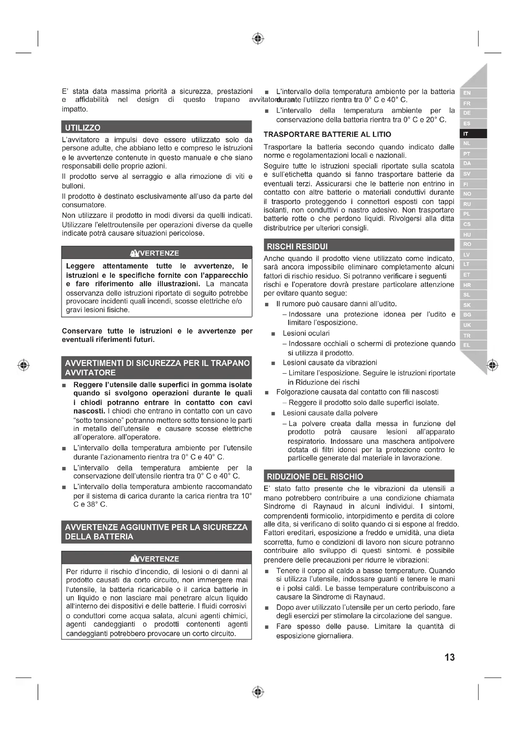 Trasportare la batteria secondo quando indicato dalle norme e regolamentazioni locali e nazionali. Seguire tutte le istruzioni speciali riportate sulla scatola e sull’etichetta quando si fanno trasportare batterie da eventuali terzi. Assicurarsi che le batterie non entrino in contatto con altre batterie o materiali conduttivi durante il trasporto proteggendo i connettori esposti con tappi isolanti, non conduttivi o nastro adesivo. Non trasportare batterie rotte o che perdono liquidi. Rivolgersi alla ditta distributrice per ulteriori consigli. RISCHI RESIDUI Anche quando il prodotto viene utilizzato come indicato, sarà ancora impossibile eliminare completamente alcuni