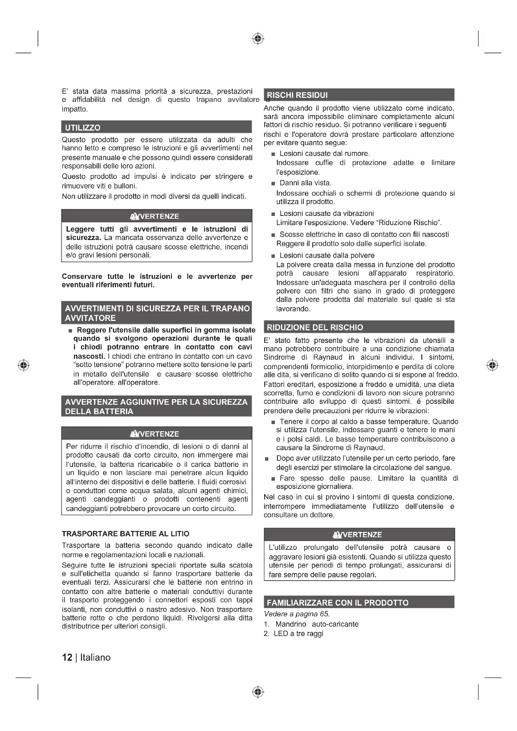 Los siguientes símbolos y palabras detallan los niveles de cuidado necesarios para usar este producto. PELIGRO Indica una situación inminente de peligro que, si no se evita, provocará la muerte o lesiones graves. ADVERTENCIA Indica una situación potencialmente peligrosa que, si no se evita, podría causar la muerte o lesiones graves. PRECAUCIÓN Indica una situación potencialmente peligrosa que, si no se evita, puede provocar lesiones leves o moderadas. PRECAUCIÓN (Sin símbolo de seguridad) Indica una situación que podría ocasionar daños materiales.12 | Italiano E’ stata data massima priorità a sicurezza, prestazioni H DI¿GDELOLWj QHO GHVLJQ GL TXHVWR WUDSDQR DYYLWDWRUH D impatto. UTILIZZO Questo prodotto per essere utilizzata da adulti che hanno letto e compreso le istruzioni e gli avvertimenti nel presente manuale e che possono quindi essere considerati responsabili delle loro azioni. Questo prodotto ad impulsi è indicato per stringere e rimuovere viti e bulloni. Non utilizzare il prodotto in modi diversi da quelli indicati. AVVERTENZE Leggere tutti gli avvertimenti e le istruzioni di sicurezza. La mancata osservanza delle avvertenze e delle istruzioni potrà causare scosse elettriche, incendi HRJUDYLOHVLRQLSHUVRQDOL Conservare tutte le istruzioni e le avvertenze per eventuali riferimenti futuri.