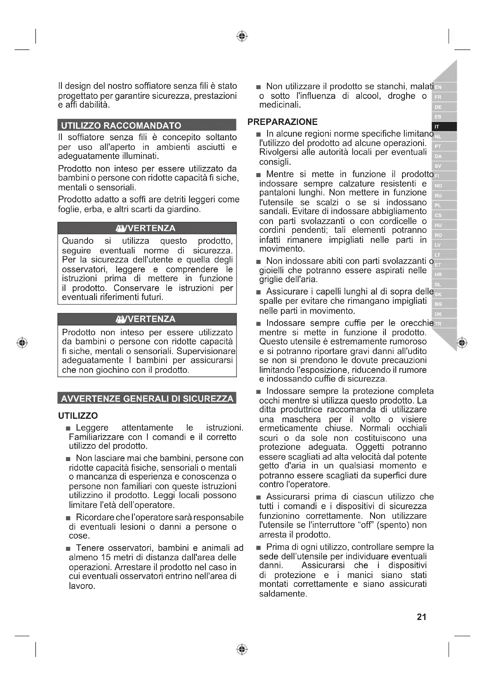 UTILIZZO ■ Leggere attentamente le istruzioni. Familiarizzare con I comandi e il corretto utilizzo del prodotto. ■ Non lasciare mai che bambini, persone con ridotte capacità fisiche, sensoriali o mentali o mancanza di esperienza e conoscenza o persone non familiari con queste istruzioni utilizzino il prodotto. Leggi locali possono limitare l’età dell’operatore. ■ Ricordare che l’operatore sarà responsabile di eventuali lesioni o danni a persone o cose. ■ Tenere osservatori, bambini e animali ad almeno 15 metri di distanza dall'area delle operazioni. Arrestare il prodotto nel caso in cui eventuali osservatori entrino nell'area di lavoro. ■ Non utilizzare il prodotto se stanchi, malati o sotto l'influenza di alcool, droghe o medicinali. PREPARAZIONE ■ In alcune regioni norme specifiche limitano l'utilizzo del prodotto ad alcune operazioni. Rivolgersi alle autorità locali per eventuali consigli. ■ Mentre si mette in funzione il prodotto indossare sempre calzature resistenti e pantaloni lunghi. Non mettere in funzione l'utensile se scalzi o se si indossano sandali. Evitare di indossare abbigliamento con parti svolazzanti o con cordicelle o cordini pendenti; tali elementi potranno infatti rimanere impigliati nelle parti in movimento. ■ Non indossare abiti con parti svolazzanti o gioielli che potranno essere aspirati nelle griglie dell'aria. ■ Assicurare i capelli lunghi al di sopra delle spalle per evitare che rimangano impigliati nelle parti in movimento. ■ Indossare sempre cuffie per le orecchie mentre si mette in funzione il prodotto. Questo utensile è estremamente rumoroso e si potranno riportare gravi danni all'udito se non si prendono le dovute precauzioni limitando l'esposizione, riducendo il rumore e indossando cuffie di sicurezza. ■ Indossare sempre la protezione completa occhi mentre si utilizza questo prodotto. La ditta produttrice raccomanda di utilizzare una maschera per il volto o visiere ermeticamente chiuse. Normali occhiali scuri o da sole non costituiscono una protezione adeguata. Oggetti potranno essere scagliati ad alta velocità dal potente getto d'aria in un qualsiasi momento e potranno essere scagliati da superfici dure contro l'operatore. ■ Assicurarsi prima di ciascun utilizzo che tutti i comandi e i dispositivi di sicurezza funzionino correttamente. Non utilizzare l'utensile se l'interruttore “off” (spento) non arresta il prodotto. ■ Prima di ogni utilizzo, controllare sempre la sede dell’utensile per individuare eventuali danni. Assicurarsi che i dispositivi di protezione e i manici siano stati montati correttamente e siano assicurati saldamente.22 | Italiano