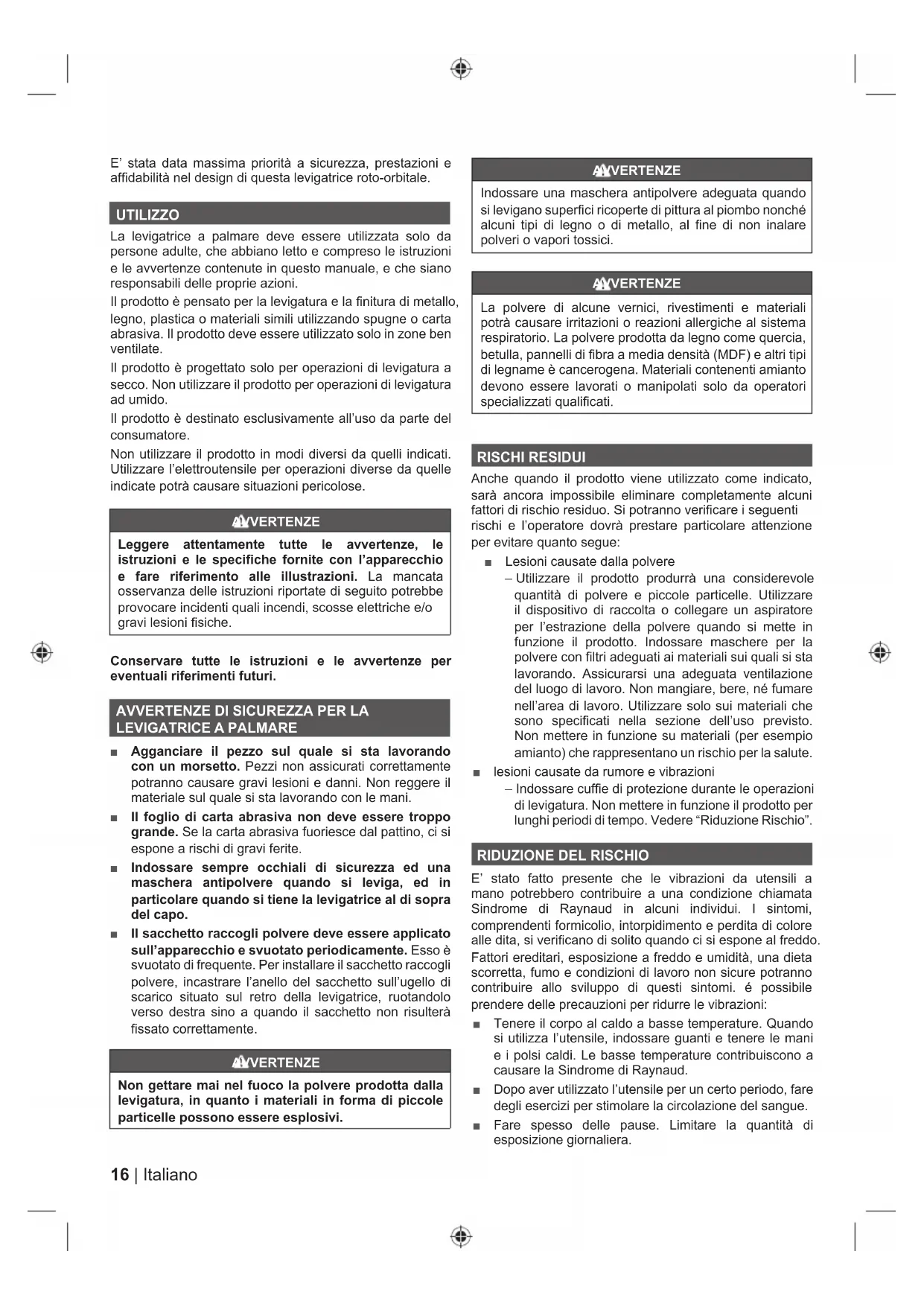 rischi e l’operatore dovrà prestare particolare attenzione per evitare quanto segue: Ŷ Lesioni causate dalla polvere – Utilizzare il prodotto produrrà una considerevole quantità di polvere e piccole particelle. Utilizzare il dispositivo di raccolta o collegare un aspiratore per l’estrazione della polvere quando si mette in funzione il prodotto. Indossare maschere per la polvere con filtri adeguati ai materiali sui quali si sta lavorando. Assicurarsi una adeguata ventilazione del luogo di lavoro. Non mangiare, bere, né fumare nell’area di lavoro. Utilizzare solo sui materiali che sono specificati nella sezione dell’uso previsto. Non mettere in funzione su materiali (per esempio amianto) che rappresentano un rischio per la salute. Ŷ lesioni causate da rumore e vibrazioni – Indossare cuffie di protezione durante le operazioni di levigatura. Non mettere in funzione il prodotto per lunghi periodi di tempo. Vedere “Riduzione Rischio”.