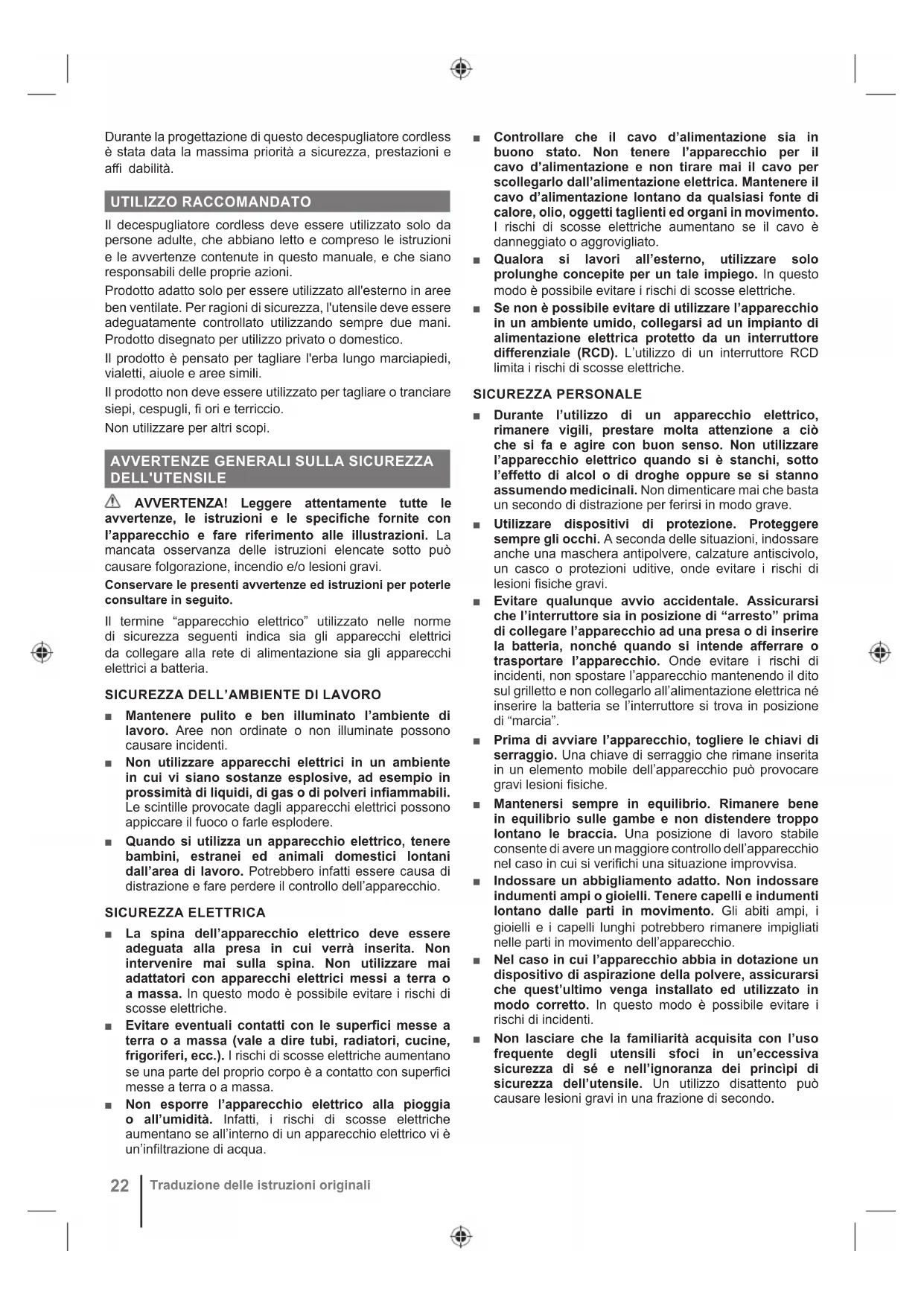 Traduzione delle istruzioni originaliUTILIZZO E MANUTENZIONE DEGLI APPARECCHI ELETTRICI ■ Non forzare l’apparecchio. Utilizzare l’apparecchio adeguato al lavoro da effettuare. L’apparecchio offrirà migliori prestazioni e sarà più sicuro se utilizzato al regime per il quale è stato concepito. ■ Non utilizzare un apparecchio elettrico se l’interruttore non ne consente l’avvio e l’arresto. Un apparecchio che non può essere acceso e spento correttamente è pericoloso e pertanto deve essere assolutamente riparato. ■ Prima di effettuare regolazioni, di cambiare gli accessori o di riporre l’utensile elettrico scollegare la spina dalla presa di corrente e/o rimuovere il pacco batteria, se staccabile, dall’utensile. In questo modo è possibile ridurre i rischi di avvio involontario dell’apparecchio. ■ Riporre gli apparecchi elettrici fuori dalla portata dei bambini. Non consentire l’utilizzo dell’apparecchio a persone che non lo conoscono o che non sono venute a conoscenza delle presenti norme di sicurezza. Gli apparecchi elettrici diventano strumenti pericolosi nelle mani di persone che non sanno utilizzarli. ■ Eseguire la manutenzione degli utensili elettrici e relativi accessori. Controllare l’allineamento dei componenti mobili. Verificare che non vi siano componenti rotti. Controllare il montaggio ed altri eventuali fattori importanti per il corretto funzionamento dell’apparecchio. In caso di componenti danneggiati, fare riparare l’apparecchio prima di utilizzarlo. Molti incidenti sono dovuti ad una cattiva manutenzione degli apparecchi. ■ Mantenere gli apparecchi sempre puliti ed affilati. Se un utensile di taglio viene mantenuto pulito e adeguatamente affilato, le probabilità che si blocchi saranno inferiori e l’utilizzatore potrà conservare un maggiore controllo dell’apparecchio. ■ Utilizzare l’apparecchio elettrico, i relativi accessori, gli inserti, ecc. attenendosi alle presenti indicazioni per l’uso, tenendo conto delle condizioni di utilizzo e delle applicazioni previste. Onde evitare situazioni di pericolo, utilizzare l’apparecchio elettrico solo per i lavori per cui è stato concepito. ■ Tenere maniglie e superfici delle impugnature asciutte, pulite e prive di olii e grassi. Maniglie e impugnature scivolose non consentono l’utilizzo e il controllo in sicurezza dell’utensile nelle situazioni impreviste. NORME DI SICUREZZA SPECIFICHE PER GLI AP-