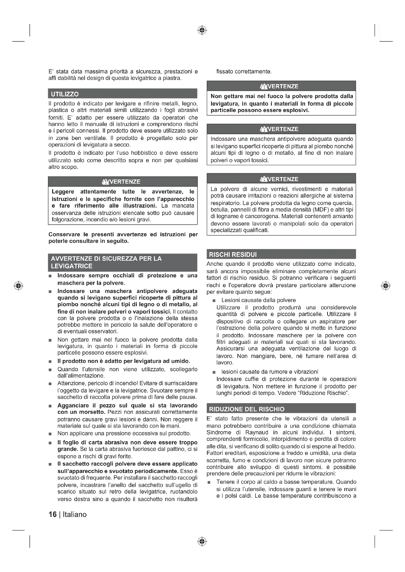 LEVIGATRICE ■ Indossare sempre occhiali di protezione e una maschera per la polvere. ■ Indossare una maschera antipolvere adeguata quando si levigano superfici ricoperte di pittura al piombo nonché alcuni tipi di legno o di metallo, al fine di non inalare polveri o vapori tossici. Il contatto con la polvere prodotta o o l’inalazione della stessa potrebbe mettere in pericolo la salute dell’operatore e di eventuali osservatori. ■ Non gettare mai nel fuoco la polvere prodotta dalla levigatura, in quanto i materiali in forma di piccole particelle possono essere esplosivi. ■ Il prodotto non è adatto per levigatura ad umido. ■ Quando l’utensile non viene utilizzato, scollegarlo dall’alimentazione. ■ Attenzione, pericolo di incendio! Evitare di surriscaldare l’oggetto da levigare e la levigatrice. Svuotare sempre il sacchetto di raccolta polvere prima di fare delle pause. ■ Agganciare il pezzo sul quale si sta lavorando con un morsetto. Pezzi non assicurati correttamente potranno causare gravi lesioni e danni. Non reggere il materiale sul quale si sta lavorando con le mani. ■ Non applicare una pressione eccessiva sul prodotto. ■ Il foglio di carta abrasiva non deve essere troppo grande. Se la carta abrasiva fuoriesce dal pattino, ci si espone a rischi di gravi ferite. ■ Il sacchetto raccogli polvere deve essere applicato sull’apparecchio e svuotato periodicamente. Esso è svuotato di frequente. Per installare il sacchetto raccogli polvere, incastrare l’anello del sacchetto sull’ugello di scarico situato sul retro della levigatrice, ruotandolo verso destra sino a quando il sacchetto non risulterà fissato correttamente. AVVERTENZE Non gettare mai nel fuoco la polvere prodotta dalla levigatura, in quanto i materiali in forma di piccole particelle possono essere esplosivi. AVVERTENZE Indossare una maschera antipolvere adeguata quando si levigano superfici ricoperte di pittura al piombo nonché alcuni tipi di legno o di metallo, al fine di non inalare polveri o vapori tossici. AVVERTENZE La polvere di alcune vernici, rivestimenti e materiali potrà causare irritazioni o reazioni allergiche al sistema respiratorio. La polvere prodotta da legno come quercia, betulla, pannelli di fibra a media densità (MDF) e altri tipi di legname è cancerogena. Materiali contenenti amianto devono essere lavorati o manipolati solo da operatori specializzati qualificati. RISCHI RESIDUI Anche quando il prodotto viene utilizzato come indicato, sarà ancora impossibile eliminare completamente alcuni fattori di rischio residuo. Si potranno verifi care i seguenti rischi e l’operatore dovrà prestare particolare attenzione per evitare quanto segue: ■ Lesioni causate dalla polvere Utilizzare il prodotto produrrà una considerevole quantità di polvere e piccole particelle. Utilizzare il dispositivo di raccolta o collegare un aspiratore per l’estrazione della polvere quando si mette in funzione il prodotto. Indossare maschere per la polvere con filtri adeguati ai materiali sui quali si sta lavorando. Assicurarsi una adeguata ventilazione del luogo di lavoro. Non mangiare, bere, né fumare nell’area di lavoro. ■ lesioni causate da rumore e vibrazioni Indossare cuffie di protezione durante le operazioni di levigatura. Non mettere in funzione il prodotto per lunghi periodi di tempo. Vedere “Riduzione Rischio”.