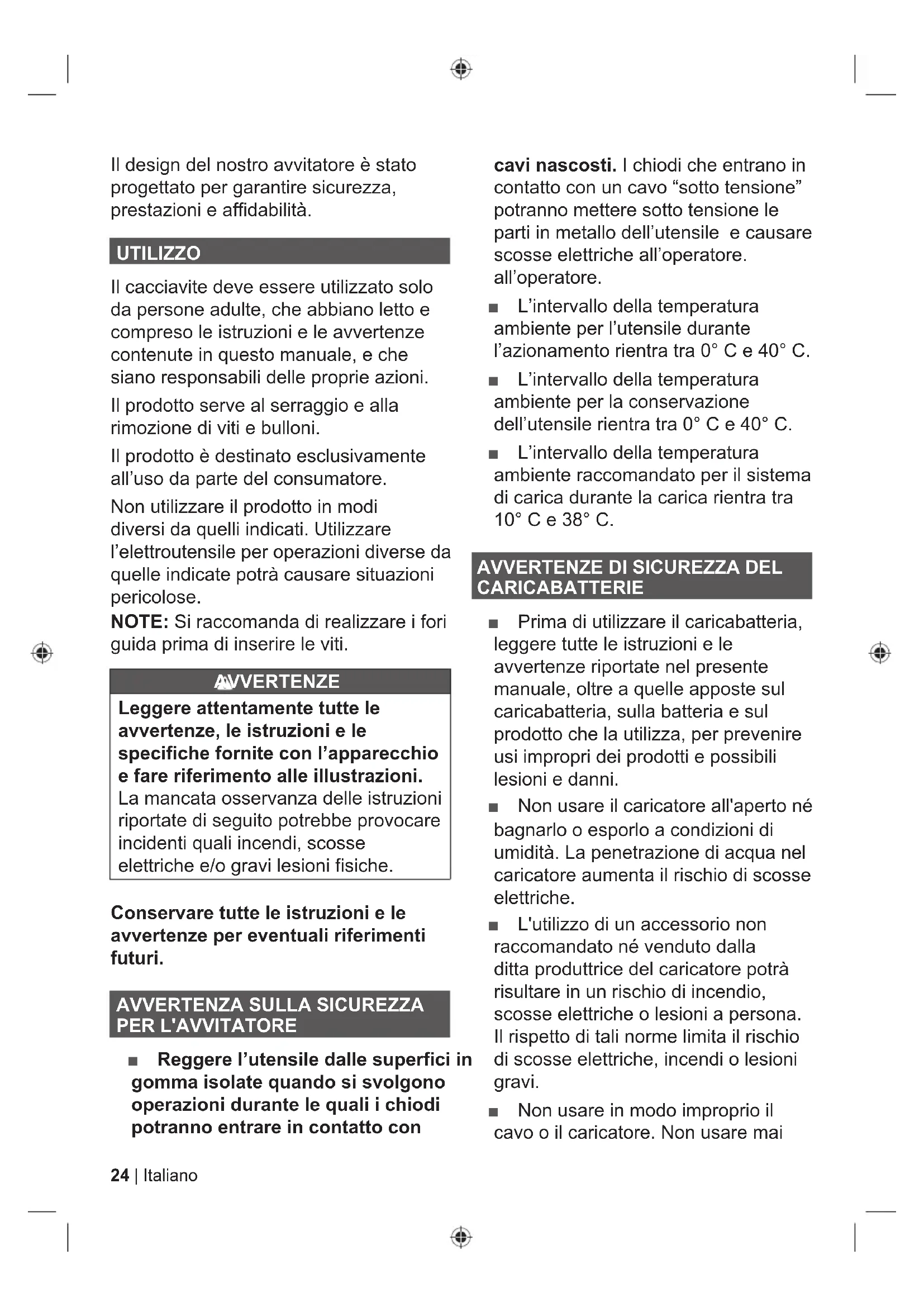 Conectarse a la red eléctrica. Tiempo de carga Torsión, máxima Par mínimo Los siguientes símbolos y palabras detallan los niveles de cuidado necesarios para usar este producto. PELIGRO Indica una situación inminente de peligro que, si no se evita, provocará la muerte o lesiones graves. ADVERTENCIA Indica una situación potencialmente peligrosa que, si no se evita, podría causar la muerte o lesiones graves. PRECAUCIÓN Indica una situación potencialmente peligrosa que, si no se evita, puede provocar lesiones leves o moderadas. PRECAUCIÓN (Sin símbolo de seguridad) Indica una situación que podría ocasionar daños materiales.24 | Italiano Il design del nostro avvitatore è stato progettato per garantire sicurezza, prestazioni e affidabilità. UTILIZZO Il cacciavite deve essere utilizzato solo da persone adulte, che abbiano letto e compreso le istruzioni e le avvertenze contenute in questo manuale, e che siano responsabili delle proprie azioni. Il prodotto serve al serraggio e alla rimozione di viti e bulloni. Il prodotto è destinato esclusivamente all’uso da parte del consumatore. Non utilizzare il prodotto in modi diversi da quelli indicati. Utilizzare l’elettroutensile per operazioni diverse da quelle indicate potrà causare situazioni pericolose. NOTE: Si raccomanda di realizzare i fori guida prima di inserire le viti. AVVERTENZE Leggere attentamente tutte le avvertenze, le istruzioni e le specifiche fornite con l’apparecchio e fare riferimento alle illustrazioni. La mancata osservanza delle istruzioni riportate di seguito potrebbe provocare incidenti quali incendi, scosse elettriche e/o gravi lesioni fisiche. Conservare tutte le istruzioni e le avvertenze per eventuali riferimenti futuri.