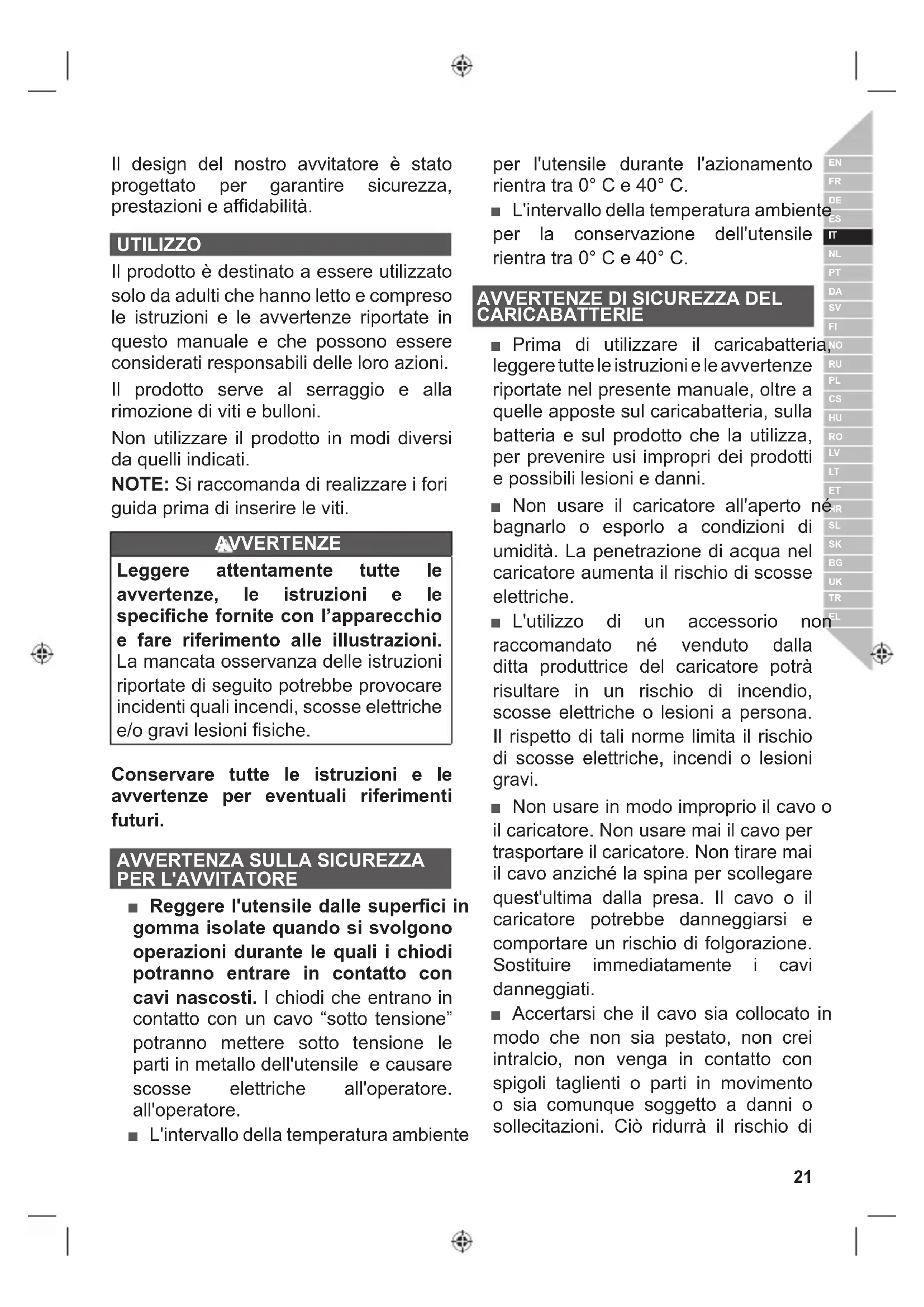 CARICABATTERIE Ŷ Prima di utilizzare il caricabatteria, leggere tutte le istruzioni e le avvertenze riportate nel presente manuale, oltre a quelle apposte sul caricabatteria, sulla batteria e sul prodotto che la utilizza, per prevenire usi impropri dei prodotti e possibili lesioni e danni. Ŷ Non usare il caricatore all'aperto né bagnarlo o esporlo a condizioni di umidità. La penetrazione di acqua nel caricatore aumenta il rischio di scosse elettriche. Ŷ L'utilizzo di un accessorio non raccomandato né venduto dalla ditta produttrice del caricatore potrà risultare in un rischio di incendio, scosse elettriche o lesioni a persona. Il rispetto di tali norme limita il rischio di scosse elettriche, incendi o lesioni gravi. Ŷ Non usare in modo improprio il cavo o il caricatore. Non usare mai il cavo per trasportare il caricatore. Non tirare mai il cavo anziché la spina per scollegare quest'ultima dalla presa. Il cavo o il caricatore potrebbe danneggiarsi e comportare un rischio di folgorazione. Sostituire immediatamente i cavi danneggiati. Ŷ Accertarsi che il cavo sia collocato in modo che non sia pestato, non crei intralcio, non venga in contatto con spigoli taglienti o parti in movimento o sia comunque soggetto a danni o sollecitazioni. Ciò ridurrà il rischio di22 | Italiano cadute accidentali che potrebbero causare lesioni oppure danni al cavo stesso, con il conseguente rischio di folgorazioni. Ŷ Tenere il cavo e il caricatore lontano da fonti di calore per prevenire danni all'involucro o alle parti interne. Ŷ Non utilizzare il caricatore se il cavo o la spina sono danneggiati, per evitare il rischio di corto circuiti e folgorazioni. In caso di danni, far sostituire il caricatore da un tecnico autorizzato. Ŷ Non utilizzare il caricatore se ha subito un urto violento, è stato fatto cadere o è stato altrimenti danneggiato. Portarlo da un tecnico autorizzato per eseguire verifiche elettriche e per determinare se il caricatore funziona bene. Ŷ Non smontare il caricatore. Quando un intervento o una riparazione sono necessari, portarlo da un tecnico autorizzato. Un montaggio scorretto potrà causare rischi di scosse elettriche o incendi. Ŷ Prima di eseguire un intervento di manutenzione o di pulizia scollegare il caricatore dalla presa elettrica per ridurre il rischio di folgorazione. Ŷ Scollegare il caricatore dall'alimenazione quando non è in uso. Ciò riduce il rischio di folgorazioni o di danni al caricatore nel caso in cui oggetti metallici cadessero nell'apertura. Previene inoltre i danni al caricatore in caso di sovracorrente. Ŷ Rischio di scosse elettriche. Non toccare la parte non isolata del connettore o del terminale della batteria. Ŷ Non tentare mai di ricaricare batterie non ricaricabili. Ŷ L'intervallo della temperatura ambiente raccomandato per il sistema di carica durante la carica rientra tra 10° C e 38°