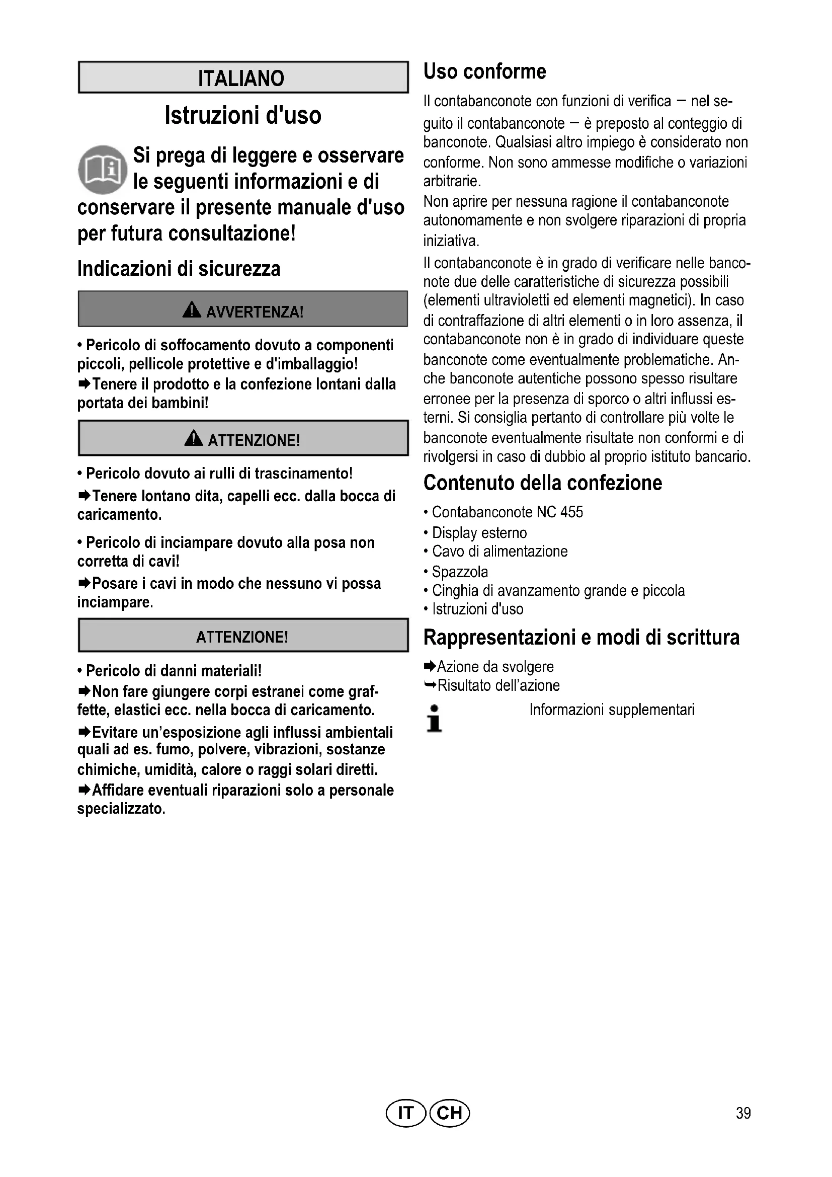 - Pericolo di danni materiali! Æ Non fare giungere corpi estranei come graf fette, elastici ecc. nella bocca di caricamento. Æ Evitare un’esposizione agli influssi ambientali quali ad es. fumo, polvere, vibrazioni, sostanze chimiche, umidità, calore o raggi solari diretti. Æ Affidare eventuali riparazioni solo a personale specializzato. Uso conforme Il contabanconote con funzioni di verifica – nel se guito il contabanconote – è preposto al conteggio di banconote. Qualsiasi altro impiego è considerato non conforme. Non sono ammesse modifiche o variazioni arbitrarie. Non aprire per nessuna ragione il contabanconote autonomamente e non svolgere riparazioni di propria iniziativa. Il contabanconote è in grado di verificare nelle banco note due delle caratteristiche di sicurezza possibili (elementi ultravioletti ed elementi magnetici). In caso di contraffazione di altri elementi o in loro assenza, il contabanconote non è in grado di individuare queste banconote come eventualmente problematiche. An che banconote autentiche possono spesso risultare erronee per la presenza di sporco o altri influssi es terni. Si consiglia pertanto di controllare più volte le banconote eventualmente risultate non conformi e di rivolgersi in caso di dubbio al proprio istituto bancario. Contenuto della confezione