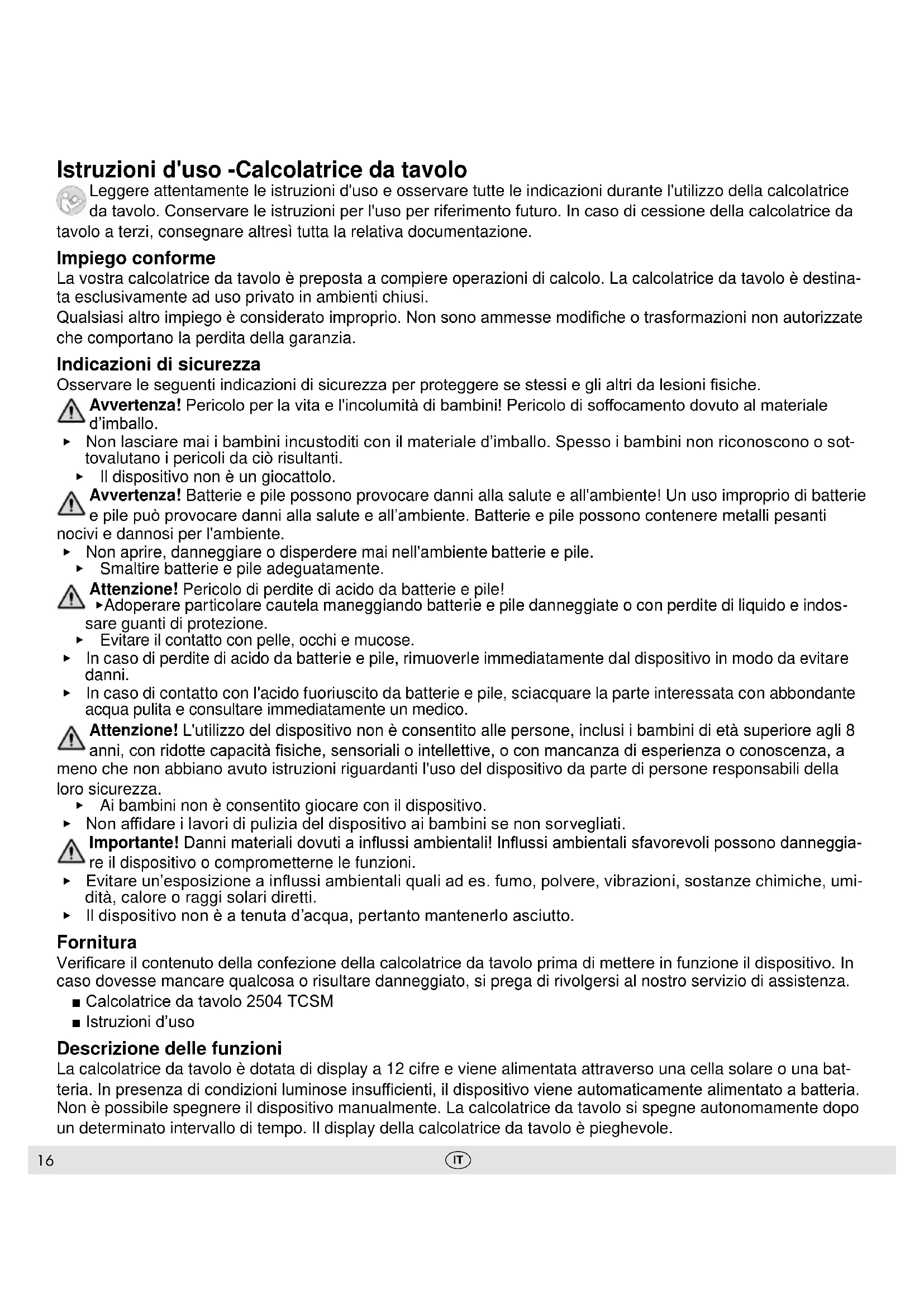 - Il dispositivo non è a tenuta d’acqua, pertanto mantenerlo asciutto. Fornitura Vericare il contenuto della confezione della calcolatrice da tavolo prima di mettere in funzione il dispositivo. In caso dovesse mancare qualcosa o risultare danneggiato, si prega di rivolgersi al nostro servizio di assistenza. ■ Calcolatrice da tavolo 2504 TCSM ■ Istruzioni d’uso Descrizione delle funzioni La calcolatrice da tavolo è dotata di display a 12 cifre e viene alimentata attraverso una cella solare o una bat- teria. In presenza di condizioni luminose insucienti, il dispositivo viene automaticamente alimentato a batteria. Non è possibile spegnere il dispositivo manualmente. La calcolatrice da tavolo si spegne autonomamente dopo un determinato intervallo di tempo. Il display della calcolatrice da tavolo è pieghevole.17