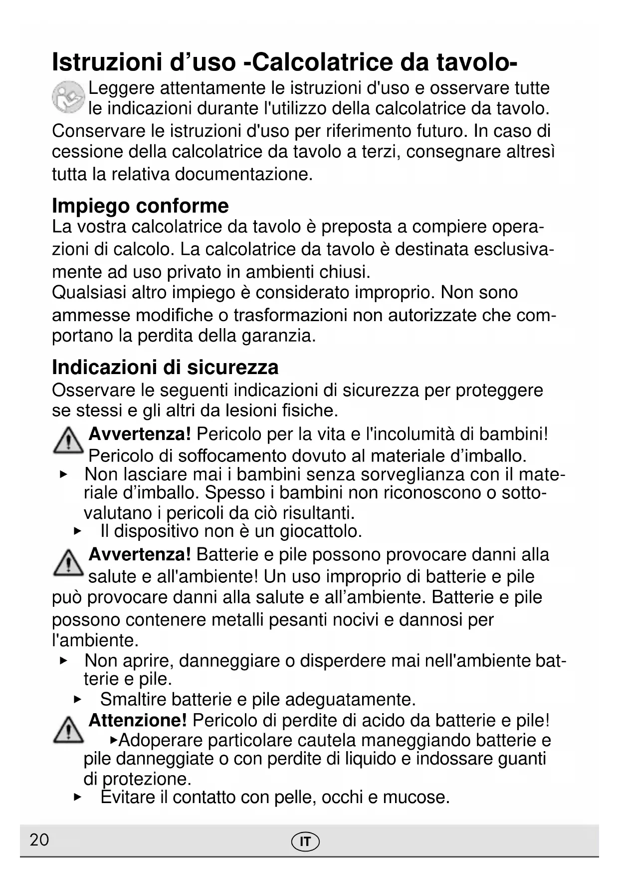 Istruzioni d’uso -Calcolatrice da tavolo- Leggere attentamente le istruzioni d'uso e osservare tutte le indicazioni durante l'utilizzo della calcolatrice da tavolo. Conservare le istruzioni d'uso per riferimento futuro. In caso di cessione della calcolatrice da tavolo a terzi, consegnare altresì tutta la relativa documentazione. Impiego conforme La vostra calcolatrice da tavolo è preposta a compiere opera- zioni di calcolo. La calcolatrice da tavolo è destinata esclusiva- mente ad uso privato in ambienti chiusi. Qualsiasi altro impiego è considerato improprio. Non sono ammesse modiche o trasformazioni non autorizzate che com- portano la perdita della garanzia. Indicazioni di sicurezza Osservare le seguenti indicazioni di sicurezza per proteggere se stessi e gli altri da lesioni siche. Avvertenza! Pericolo per la vita e l'incolumità di bambini! Pericolo di soocamento dovuto al materiale d’imballo.