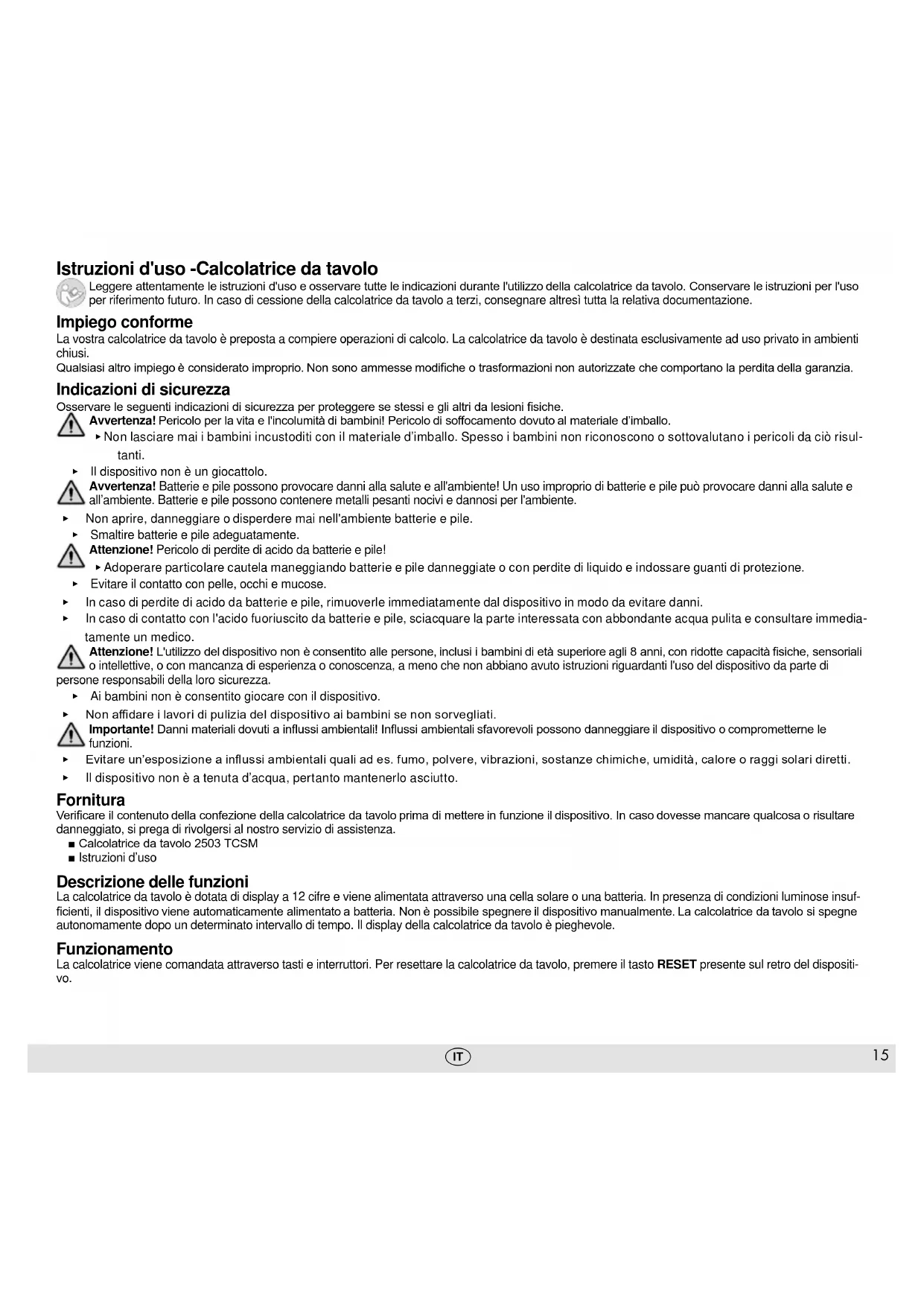 - Il dispositivo non è a tenuta d’acqua, pertanto mantenerlo asciutto. Fornitura Vericare il contenuto della confezione della calcolatrice da tavolo prima di mettere in funzione il dispositivo. In caso dovesse mancare qualcosa o risultare danneggiato, si prega di rivolgersi al nostro servizio di assistenza. ■ Calcolatrice da tavolo 2503 TCSM ■ Istruzioni d’uso Descrizione delle funzioni La calcolatrice da tavolo è dotata di display a 12 cifre e viene alimentata attraverso una cella solare o una batteria. In presenza di condizioni luminose insuf- cienti, il dispositivo viene automaticamente alimentato a batteria. Non è possibile spegnere il dispositivo manualmente. La calcolatrice da tavolo si spegne autonomamente dopo un determinato intervallo di tempo. Il display della calcolatrice da tavolo è pieghevole. Funzionamento La calcolatrice viene comandata attraverso tasti e interruttori. Per resettare la calcolatrice da tavolo, premere il tasto RESET presente sul retro del dispositi- vo.16
