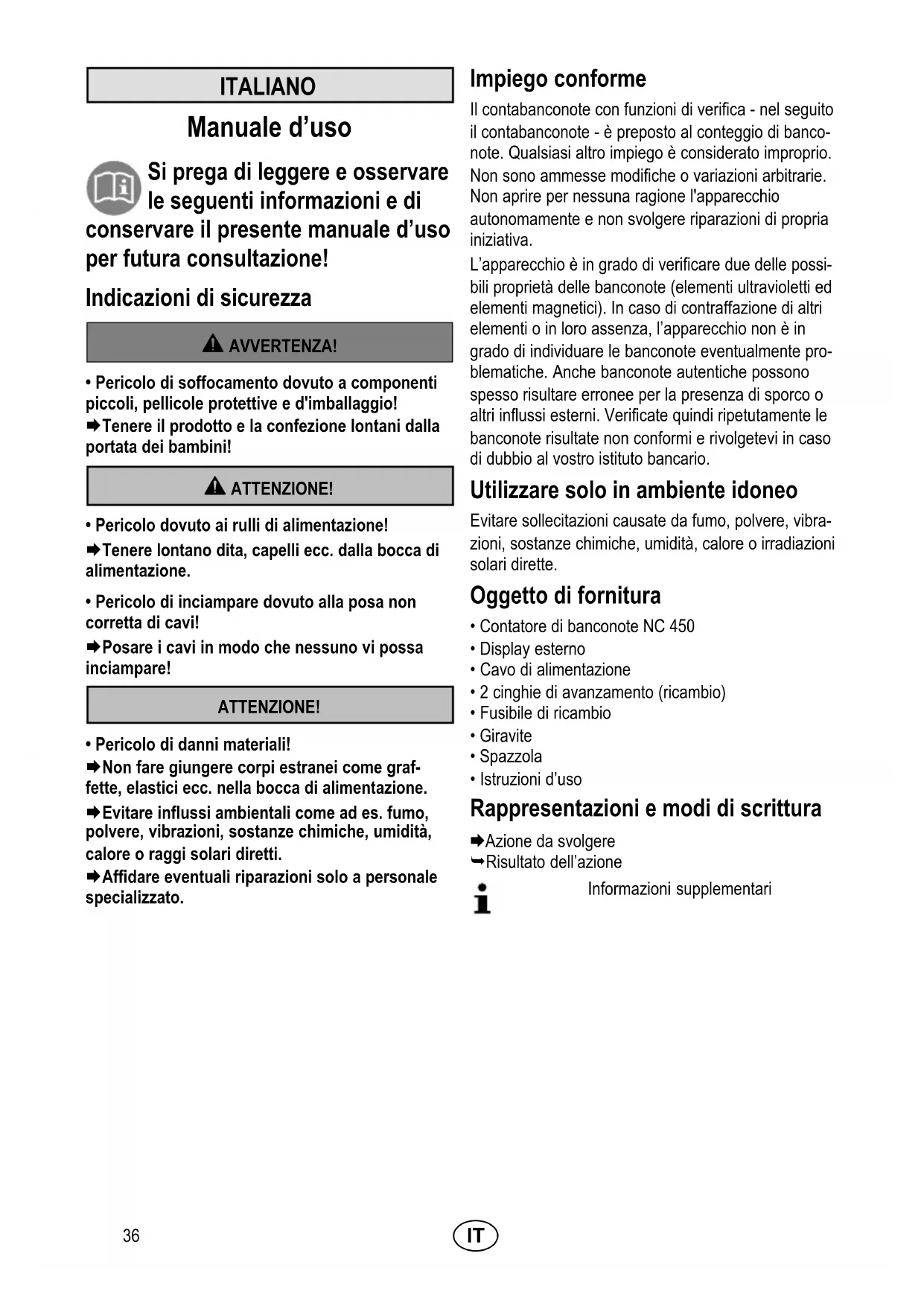 - Pericolo di danni materiali! Æ Non fare giungere corpi estranei come graf fette, elastici ecc. nella bocca di alimentazione. Æ Evitare influssi ambientali come ad es. fumo, polvere, vibrazioni, sostanze chimiche, umidità, calore o raggi solari diretti. Æ Affidare eventuali riparazioni solo a personale specializzato. Impiego conforme Il contabanconote con funzioni di verifica - nel seguito il contabanconote - è preposto al conteggio di banco note. Qualsiasi altro impiego è considerato improprio. Non sono ammesse modifiche o variazioni arbitrarie. Non aprire per nessuna ragione l'apparecchio autonomamente e non svolgere riparazioni di propria iniziativa. L’apparecchio è in grado di verificare due delle possi bili proprietà delle banconote (elementi ultravioletti ed elementi magnetici). In caso di contraffazione di altri elementi o in loro assenza, l’apparecchio non è in grado di individuare le banconote eventualmente pro blematiche. Anche banconote autentiche possono spesso risultare erronee per la presenza di sporco o altri influssi esterni. Verificate quindi ripetutamente le banconote risultate non conformi e rivolgetevi in caso di dubbio al vostro istituto bancario. Utilizzare solo in ambiente idoneo Evitare sollecitazioni causate da fumo, polvere, vibra zioni, sostanze chimiche, umidità, calore o irradiazioni solari dirette. Oggetto di fornitura
