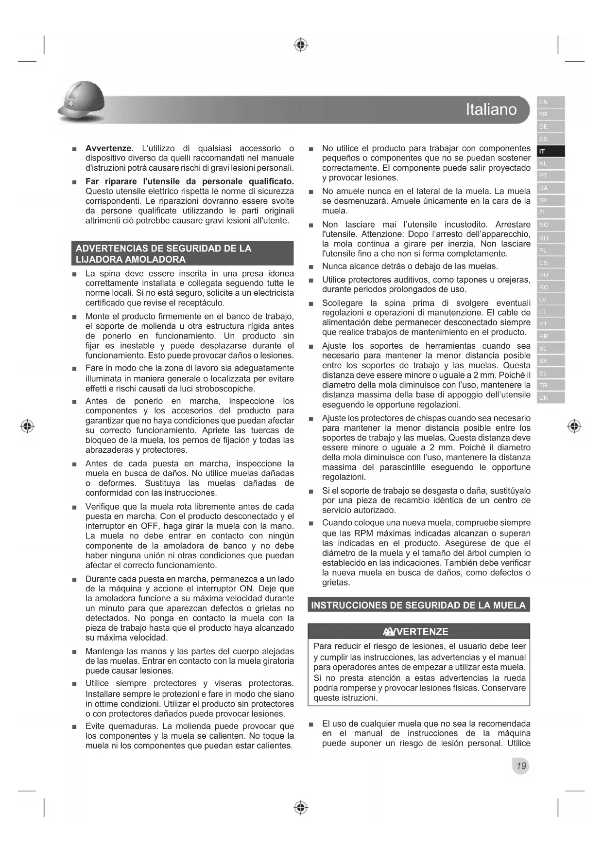 rischi e l'operatore dovrà prestare particolare attenzione per evitare quanto segue: Ŷ Riesgo de contacto con las partes no protegidas de la muela rotatoria. Ŷ Riesgo de quemaduras en contacto con la muela o pieza de trabajo caliente. Ŷ Danni al sistema respiratorio nel caso in cui non si indosserà una maschera per la polvere. Ŷ Danni all'udito nel caso in cui non si indossino cuffie.